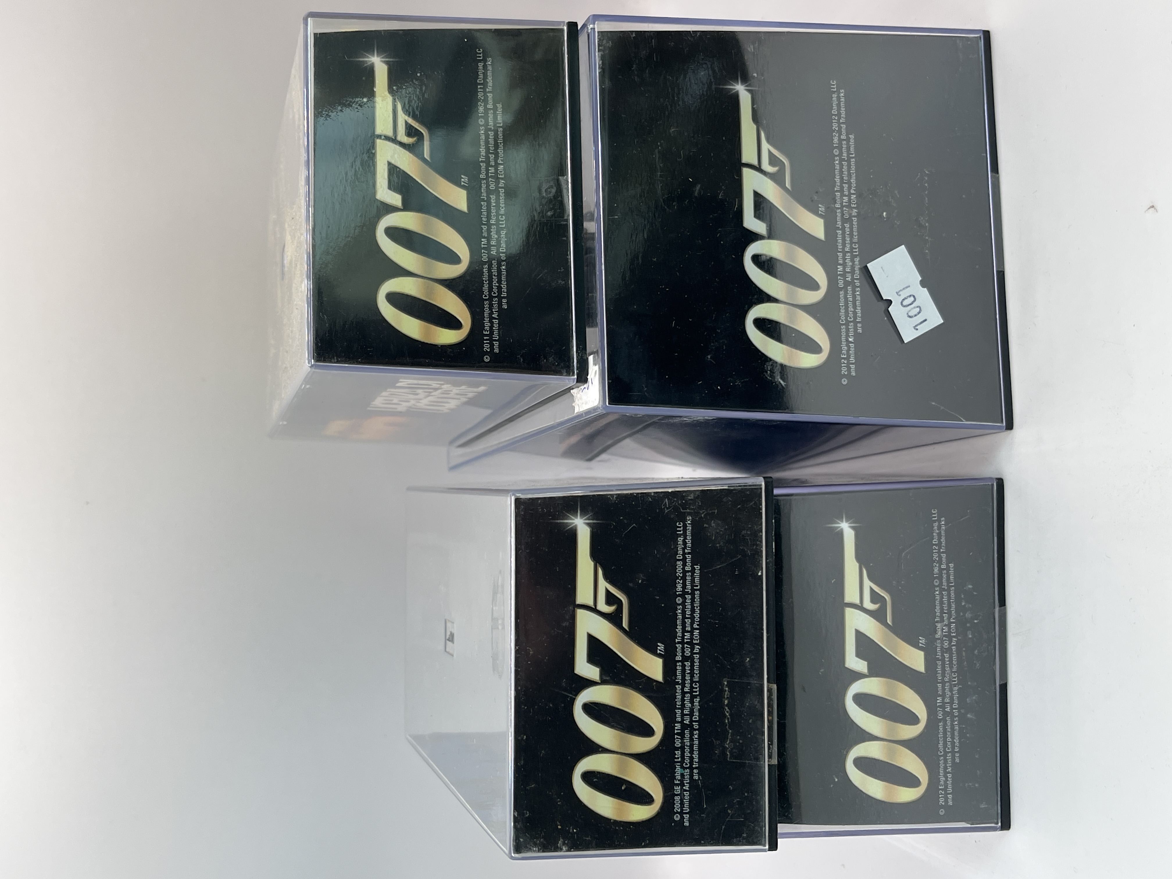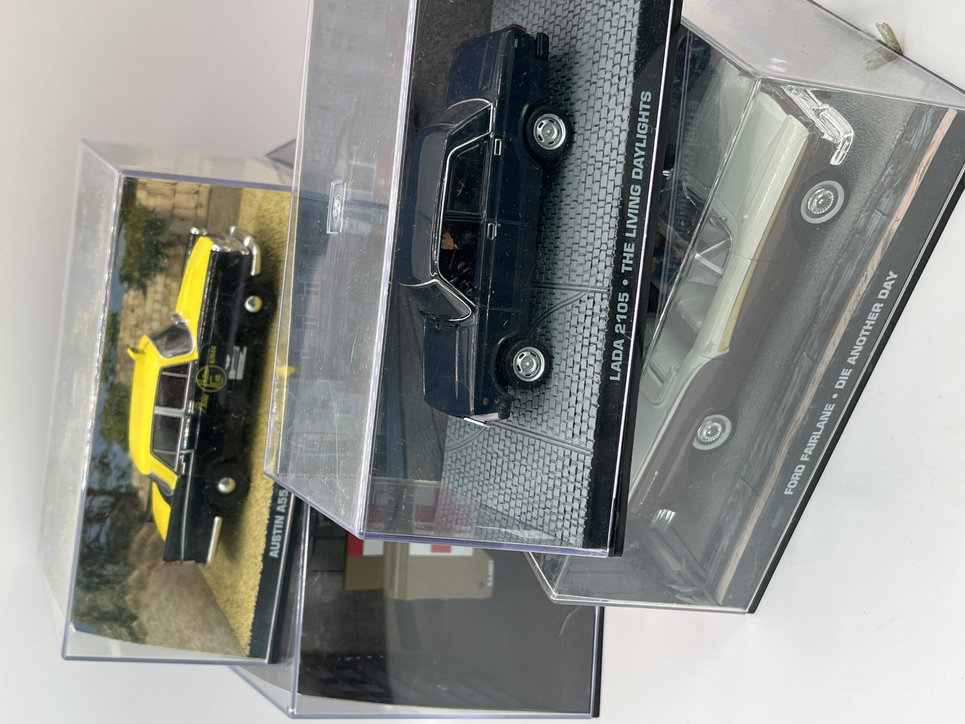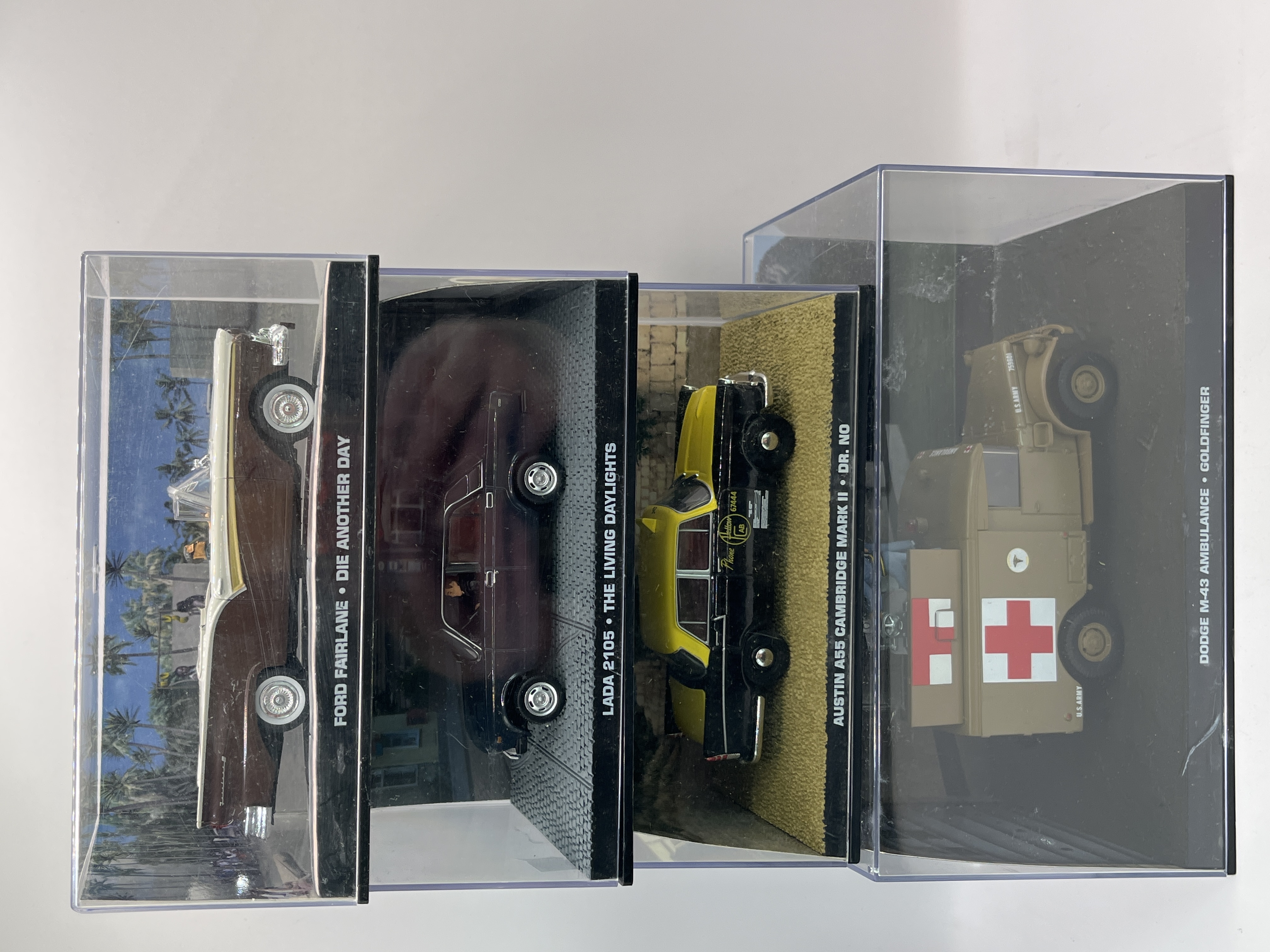 A collection of die-cast model vehicles from the James Bond 007 Car Collection, produced by Eaglemoss Collections and GE Fabbri Ltd. Each vehicle is presented on a themed diorama base within a clear acrylic display case. The collection includes models such as the Ford Fairlane from Die Another Day, the Lada 2105 from The Living Daylights, the Austin A55 Cambridge Mark II from Dr. No, and the Dodge M-43 Ambulance from Goldfinger. The side panels of the display cases feature the 007 logo and manufacturer copyright information for Eon Productions Limited, with dates ranging from 2008 to 2012.