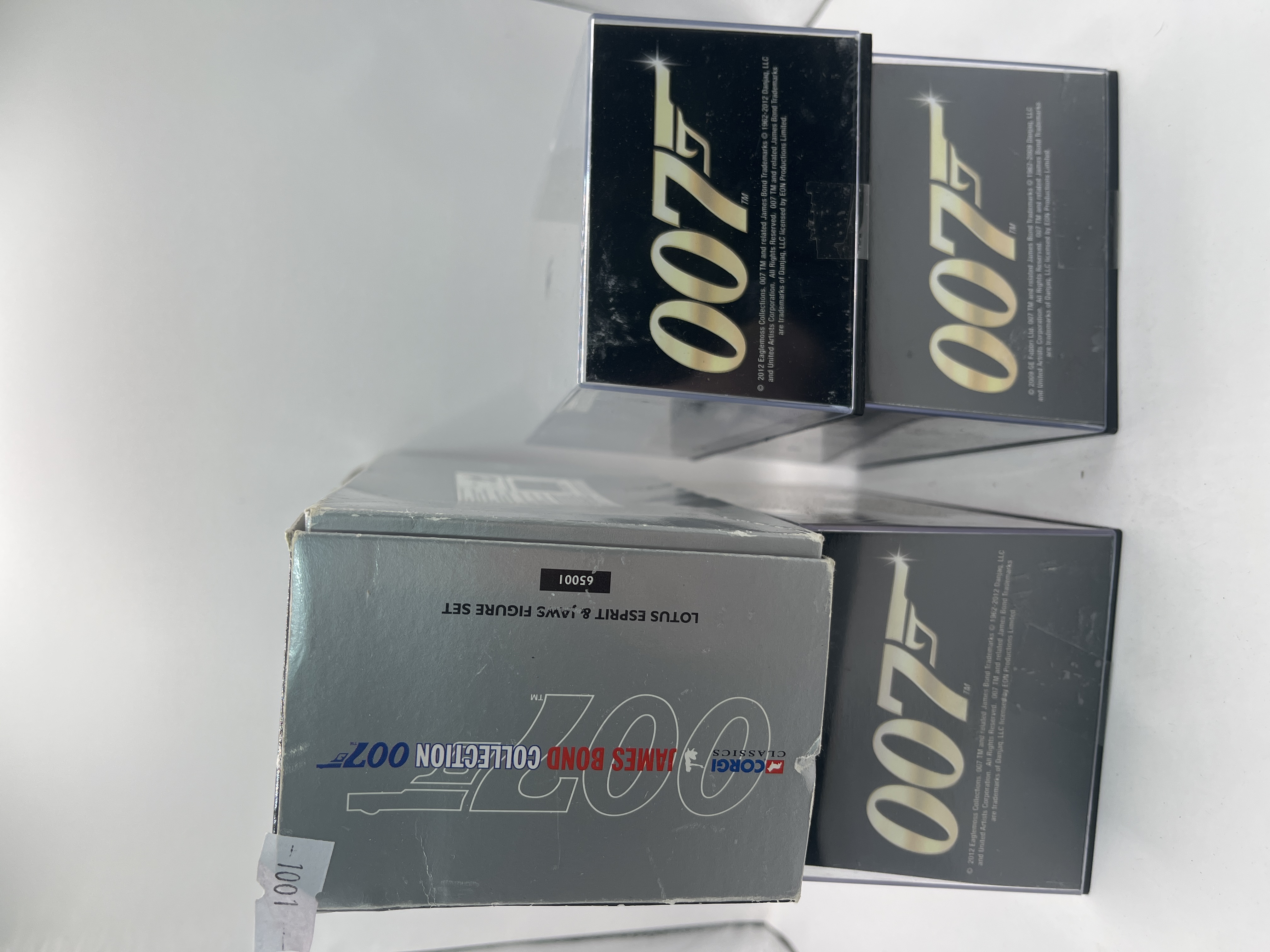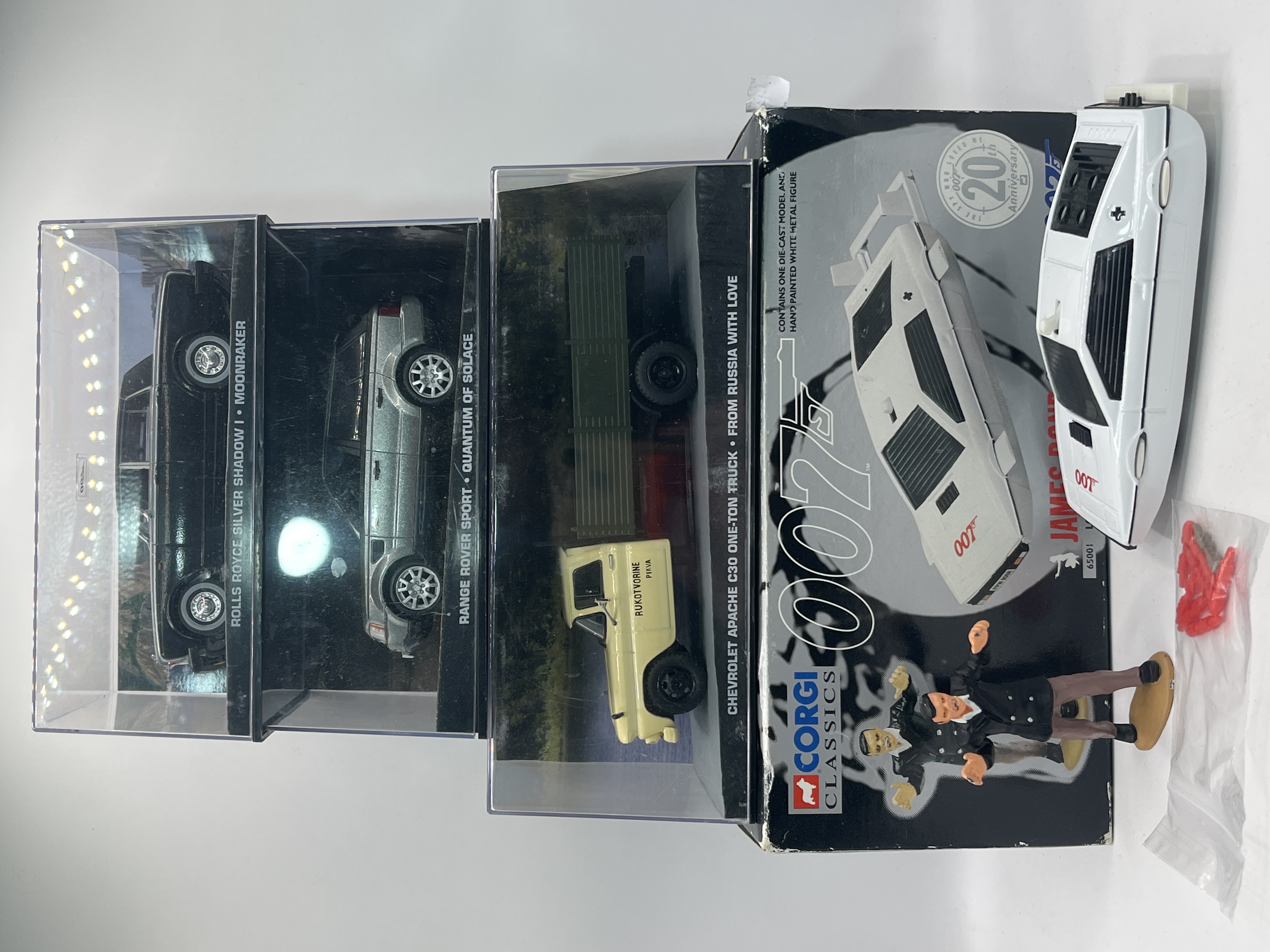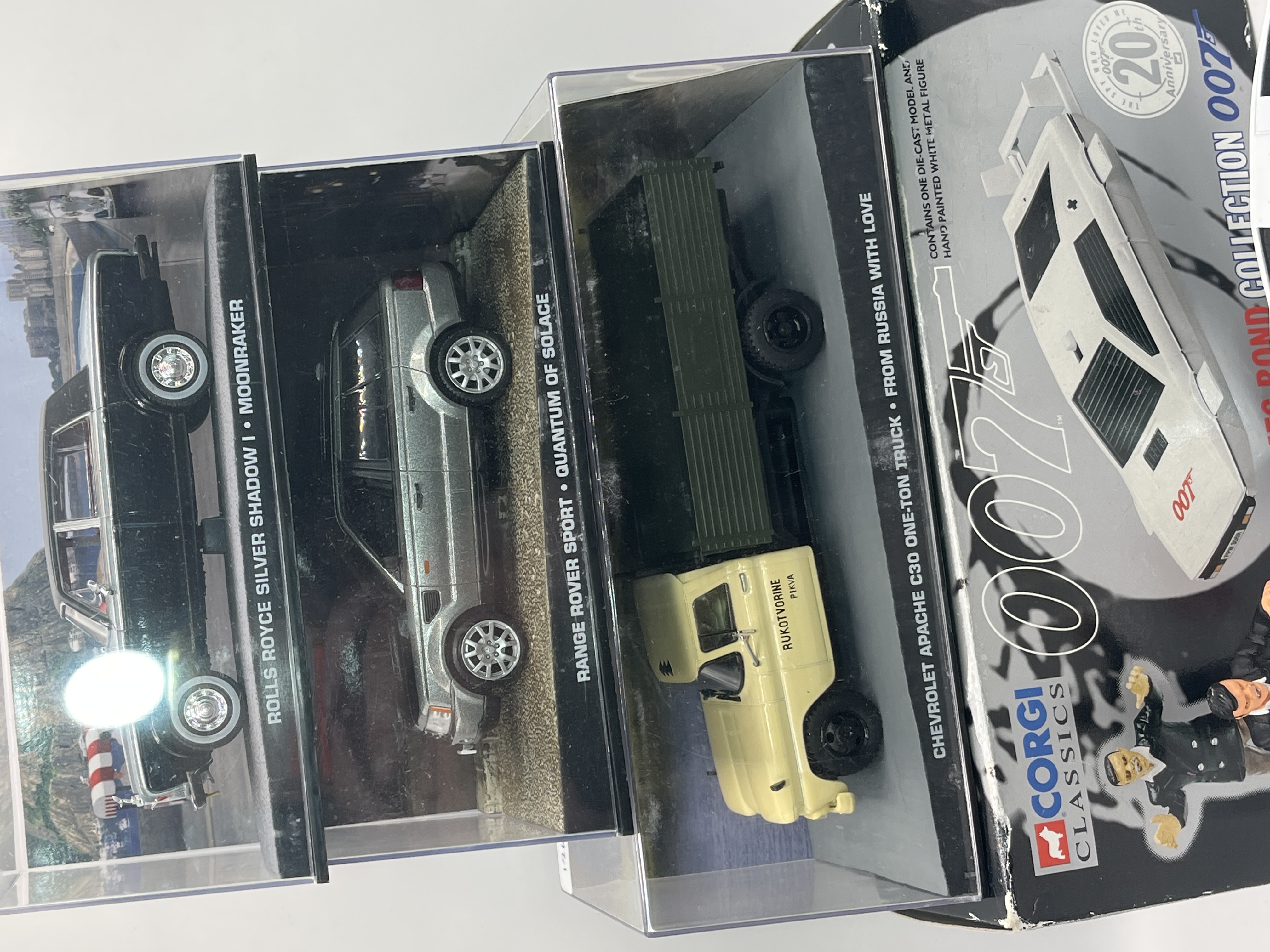 A collection of James Bond 007 themed scale model vehicles and a character figure, featuring pieces from Eaglemoss Collections and Corgi Classics. The group includes multiple die-cast models presented in clear acrylic display cases by Eaglemoss: a black Rolls Royce Silver Shadow I from Moonraker, a silver Range Rover Sport from Quantum of Solace, and a tan Chevrolet Apache C30 one-ton truck from From Russia With Love. The collection also features a Corgi Classics 20th Anniversary boxed set, item 65001, for The Spy Who Loved Me, which includes a white Lotus Esprit submarine car, a hand-painted white metal figure of the character Jaws, and associated red plastic accessories. The Eaglemoss packaging displays copyright dates of 2009 and 2012.
