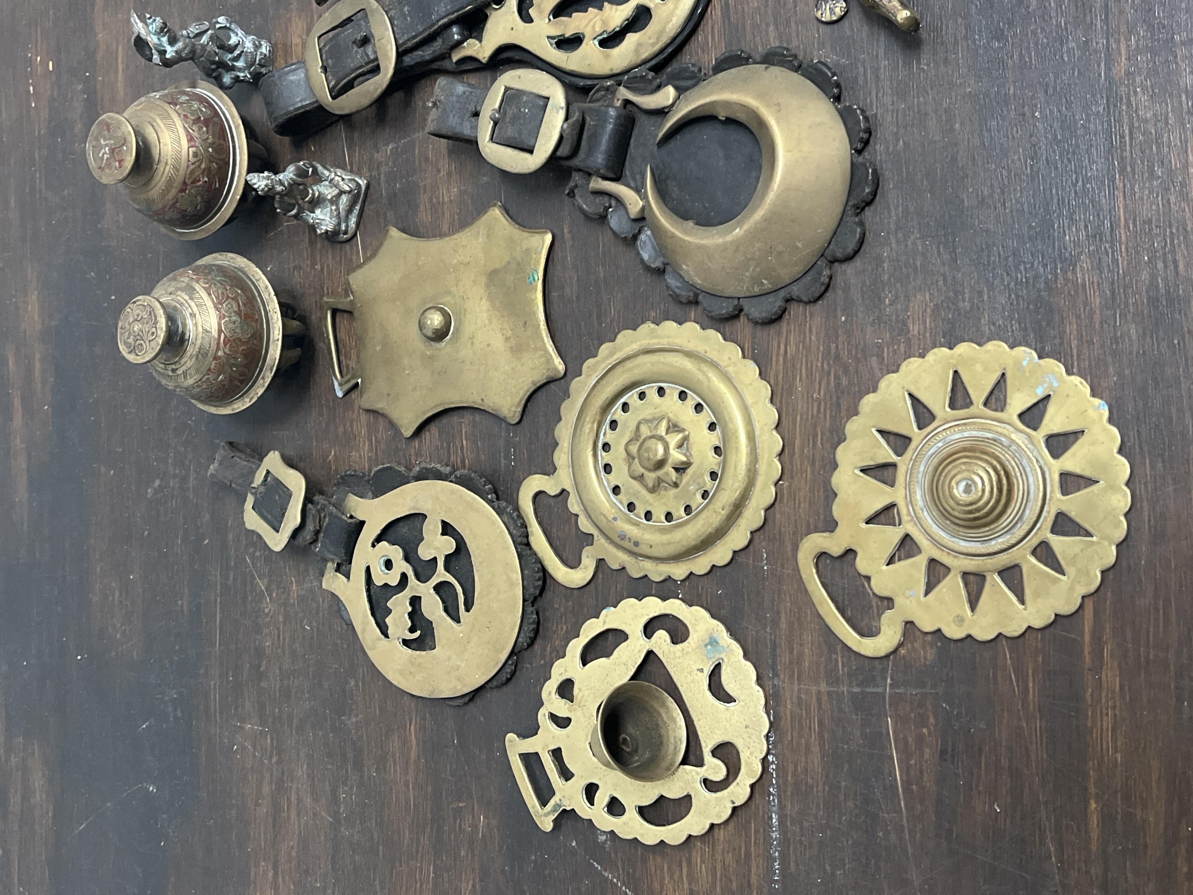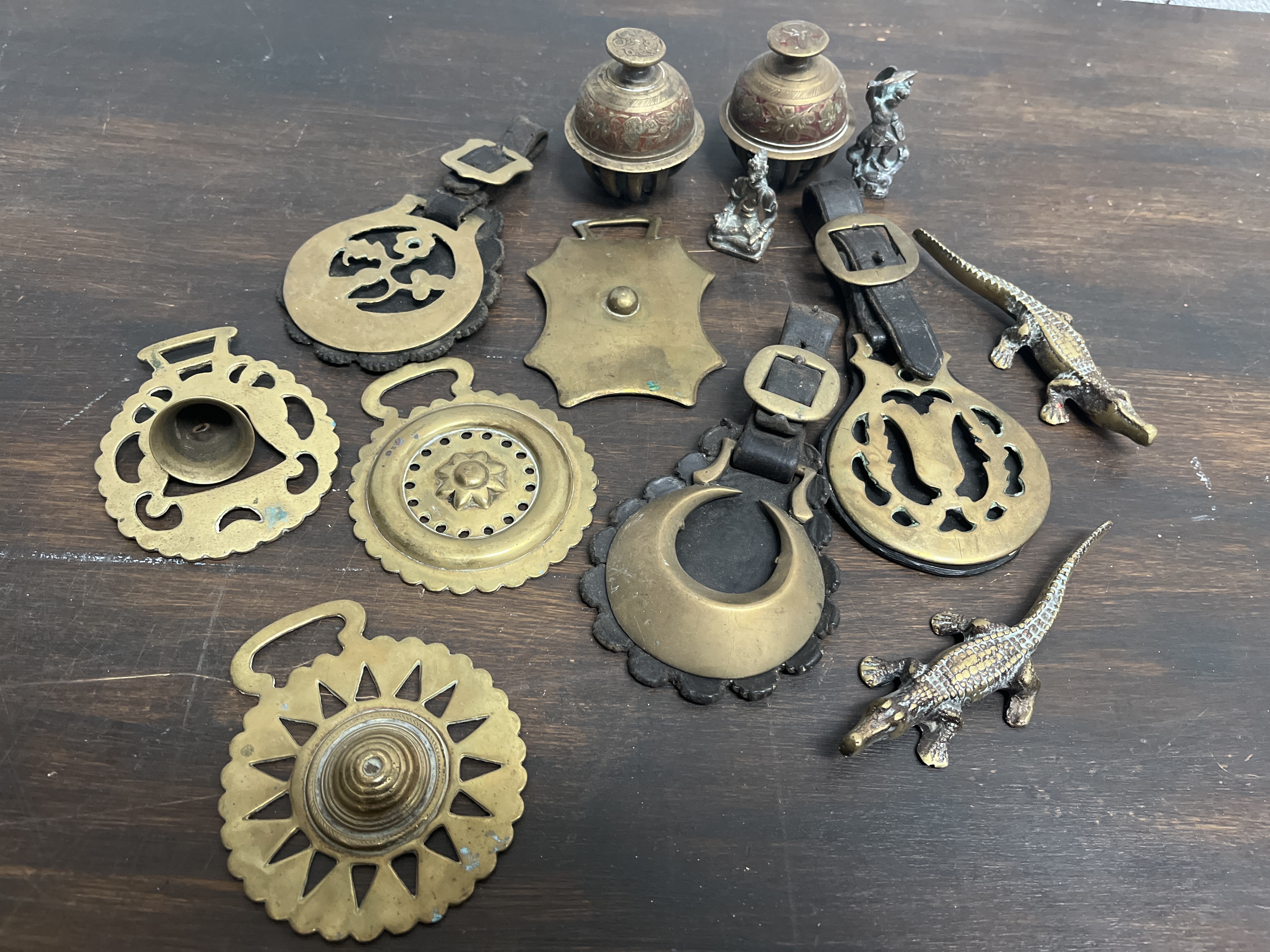 An assortment of metal decorative items, primarily featuring cast brass horse brasses. The horse brasses include various traditional motifs such as a sunburst, a crescent moon, and scrolling openwork designs. Several brasses remain attached to their original black leather straps with metal buckles. The lot also includes a pair of dome-shaped bells with red and gold-toned decorative patterns and script-like markings on the finials, showing Eastern-influenced design. Additionally, the collection contains small cast-metal figurines, including two crocodiles with textured scale details and two miniature silver-toned figures. Materials include brass, leather, and white metal.