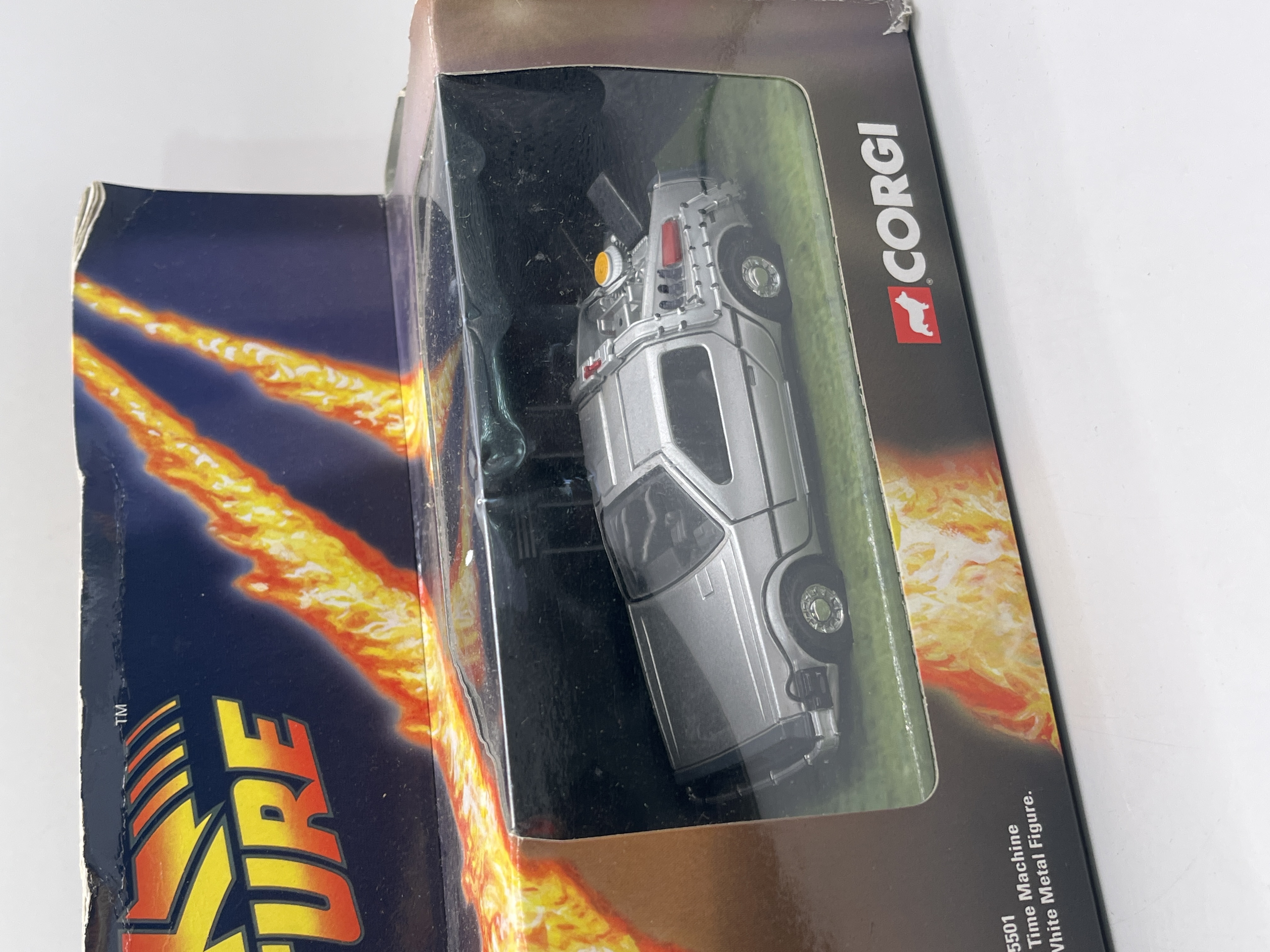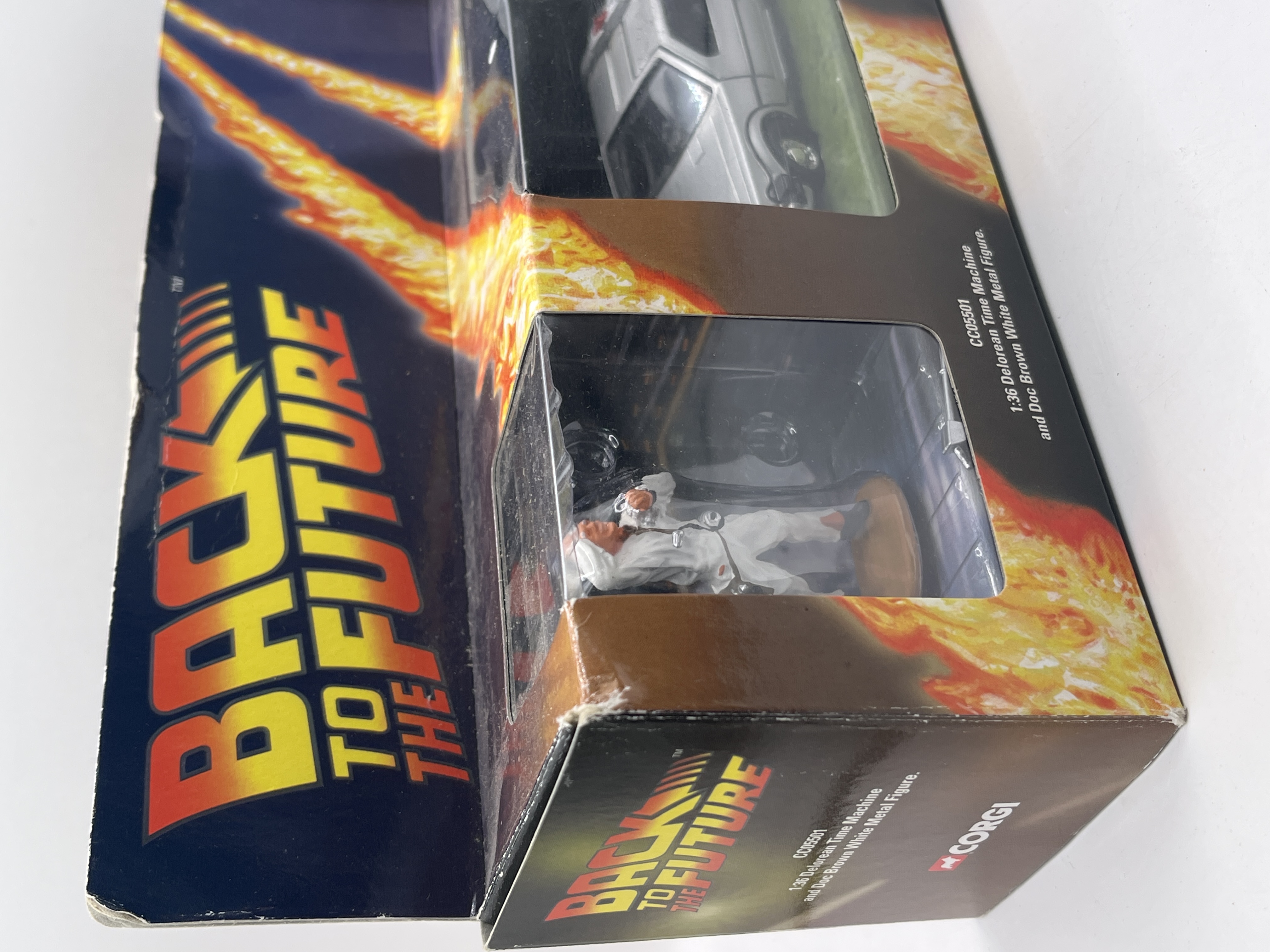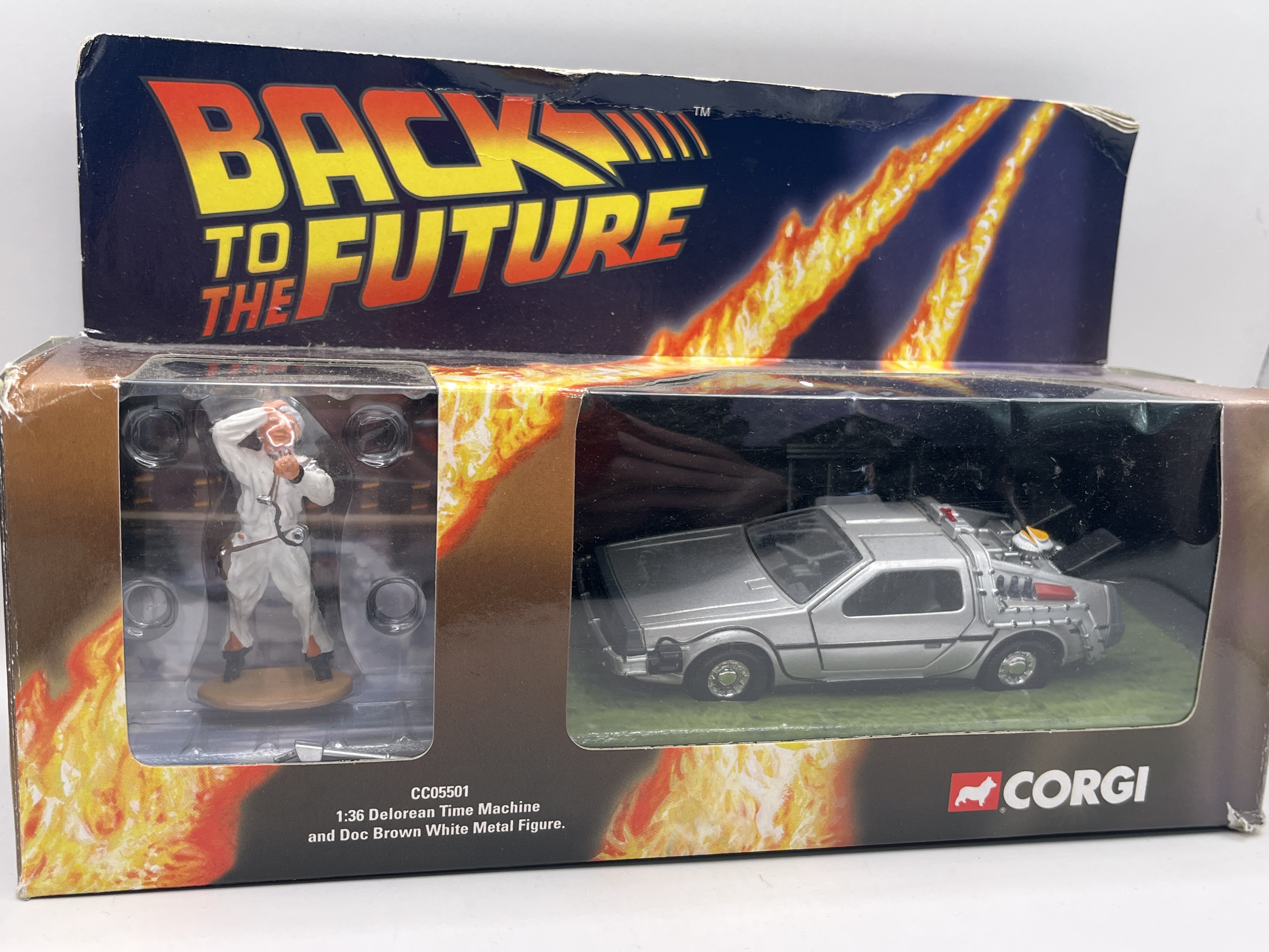 A Corgi CC05501 Back to the Future set comprising a 1:36 scale die-cast model of the DeLorean Time Machine and a painted white metal figurine of Dr Emmett Brown. The vehicle is finished in silver with detailed exterior modifications including the rear-mounted reactor and wiring. The figurine depicts the character in a white radiation suit. The set is contained within its original illustrative window-box packaging featuring film-themed graphics.