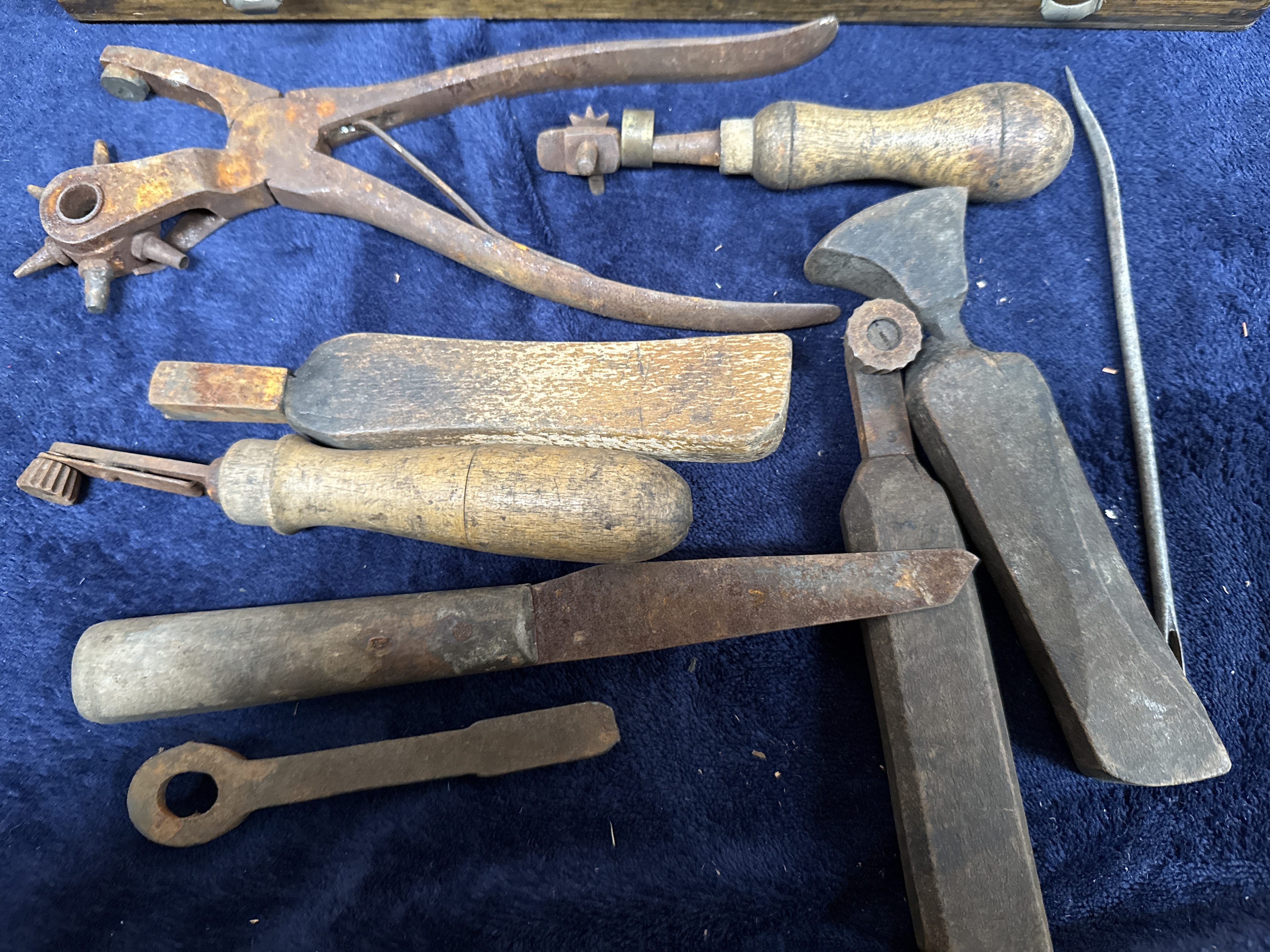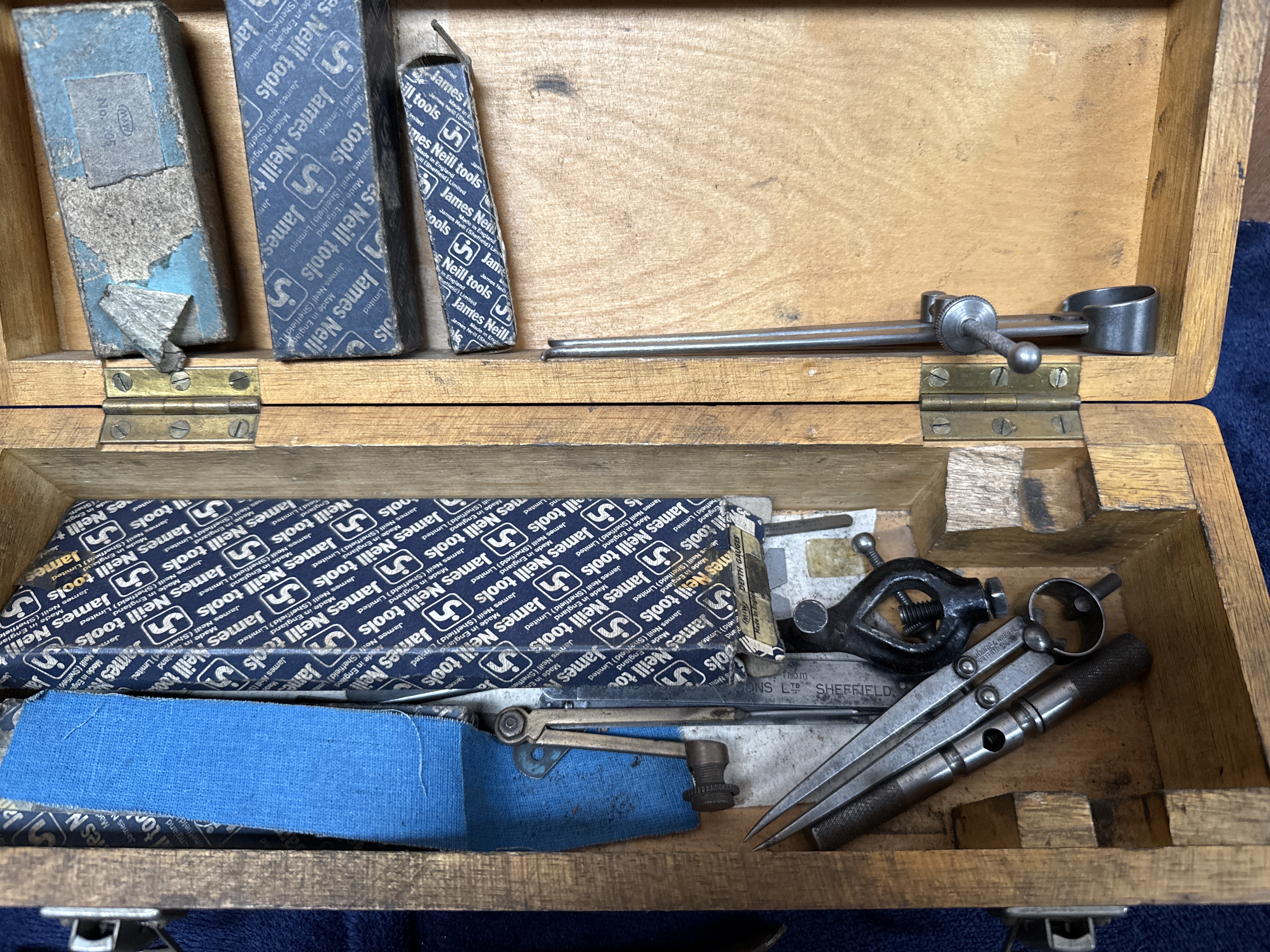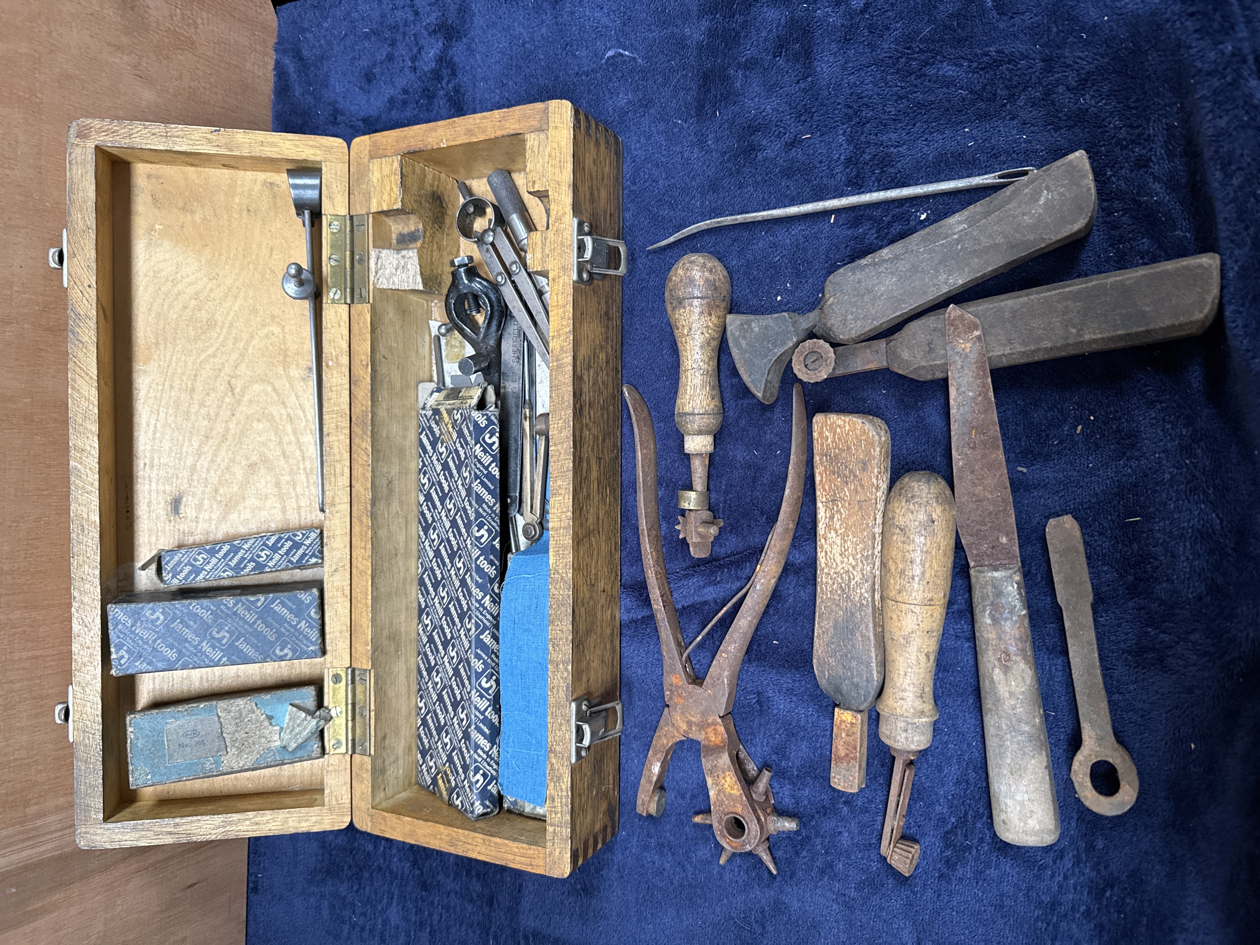 A group of vintage and antique hand tools comprising precision measuring instruments and leatherworking implements. The lot includes several items by James Neill (Sheffield) in original blue and white paper packaging, alongside a Moore & Wright (Sheffield) depth gauge and steel calipers. The measuring instruments are housed in a simple wooden storage box with metal clasps. Accompanying the box is an assortment of specialised leatherworking tools, including a rotary leather punch, a wooden-handled tracing wheel, a utility knife, and several wooden-handled slickers or files. Visible markings include James Neill, Moore & Wright Sheffield England, and Made in England.
