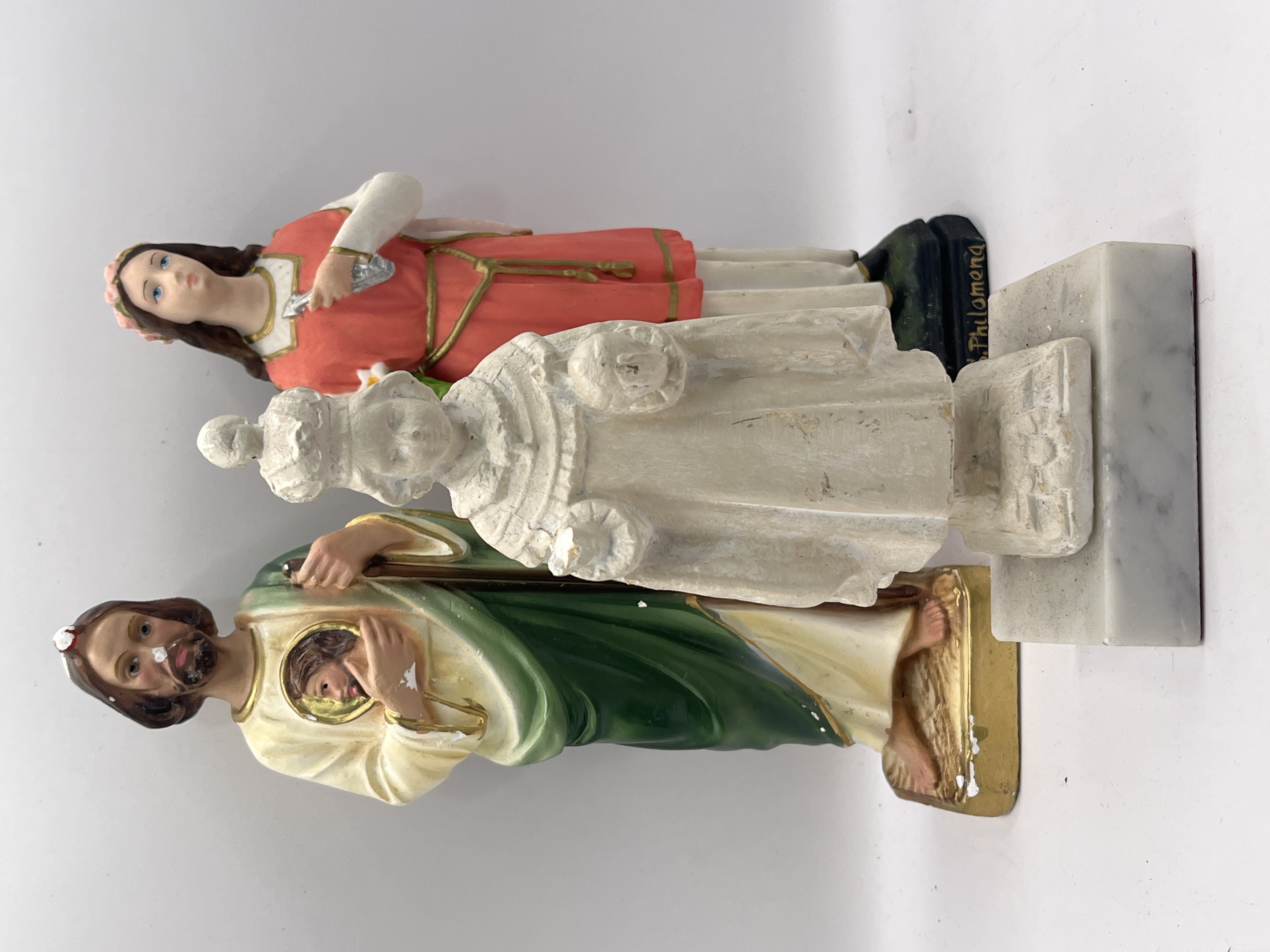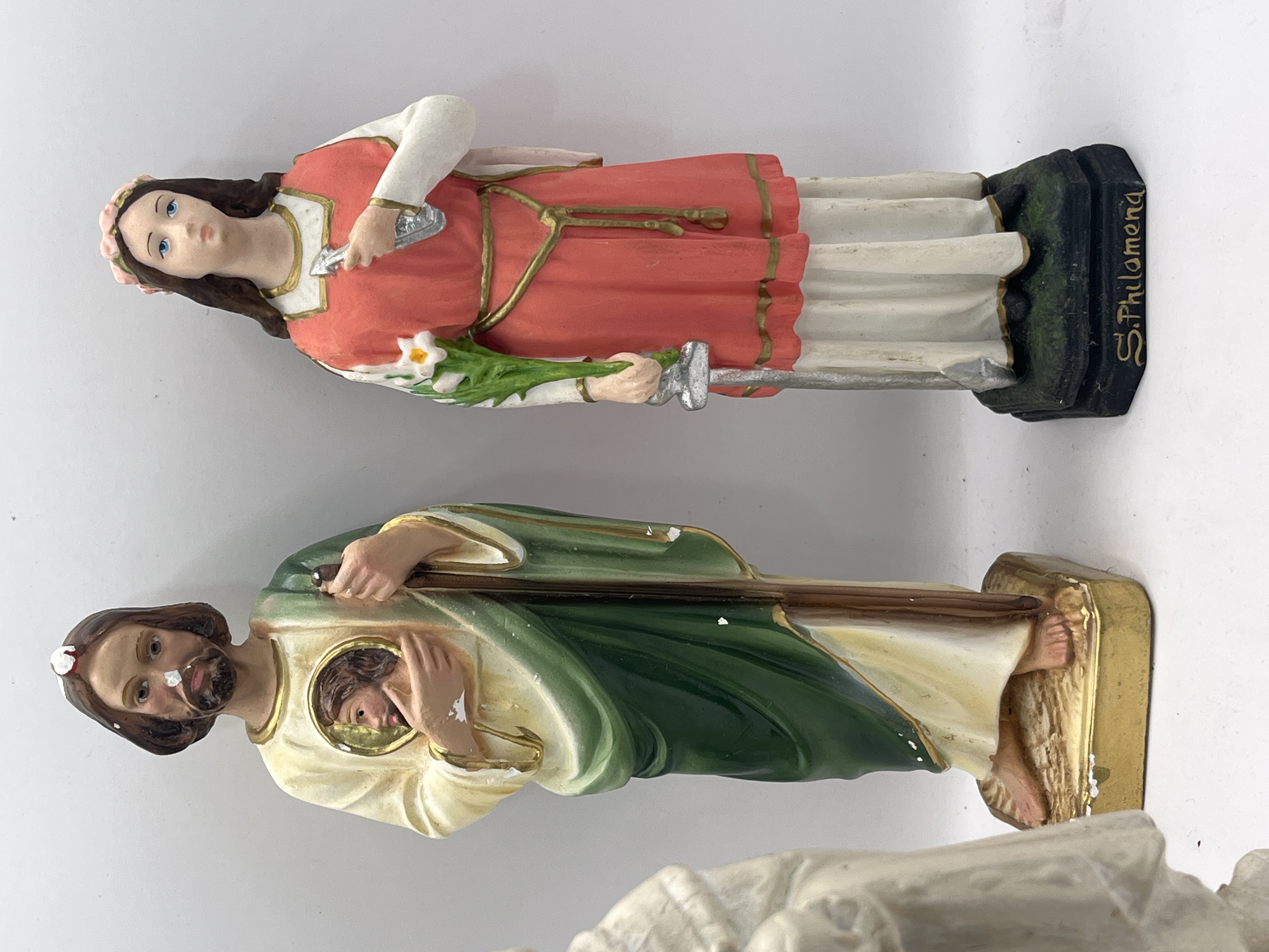 A trio of religious devotional figurines constructed from moulded resin or plaster. The collection includes a polychrome representation of Saint Philomena, identified by the inscription S. Philomena on the base, depicted in red and white robes holding an arrow and lilies. Also included is a figure of Saint Jude in green and white garments holding a staff and a medallion. The third item is a monochromatic white figurine depicting a crowned holy child, resembling the Infant Jesus of Prague, mounted on a tiered square base.