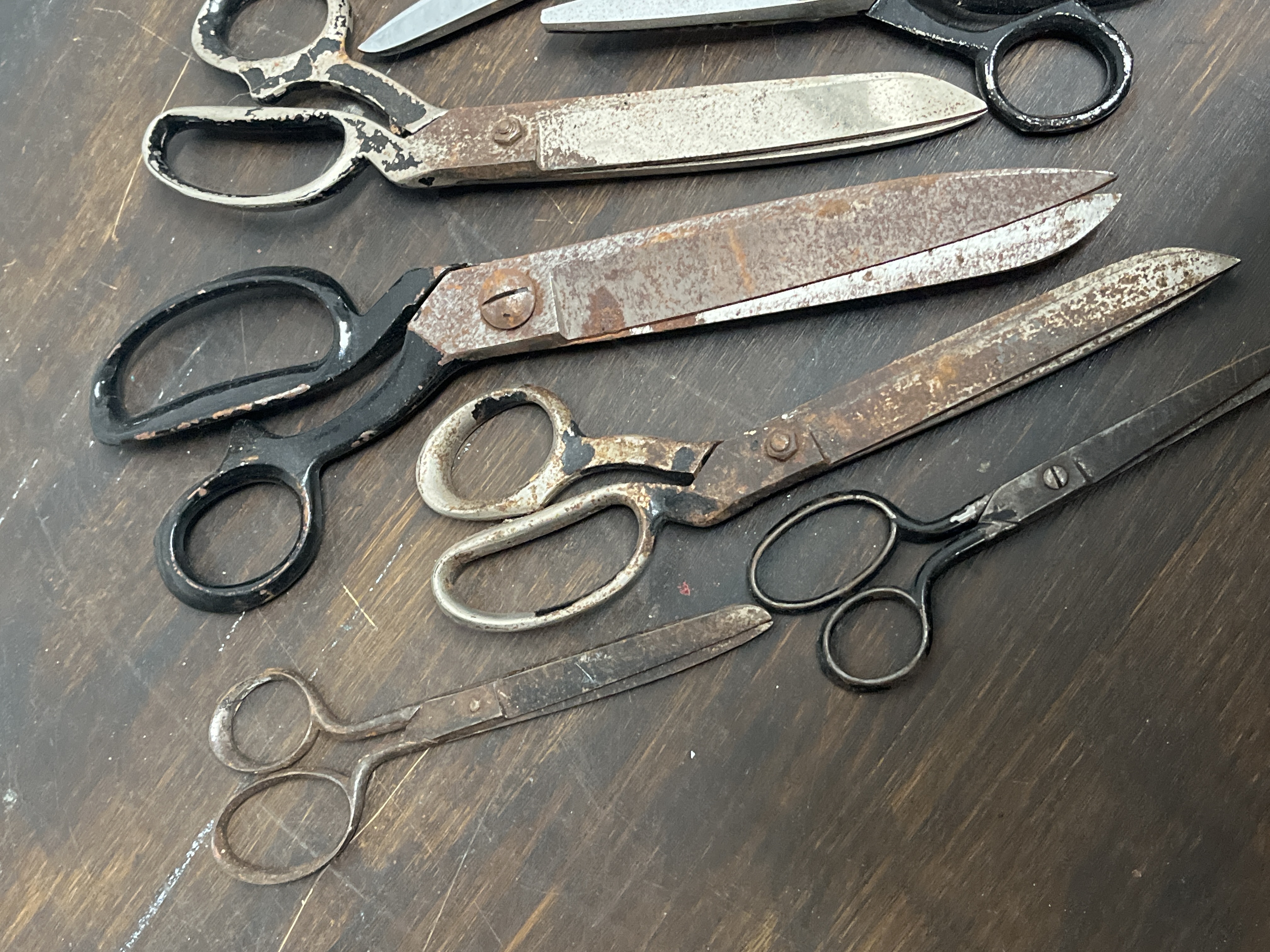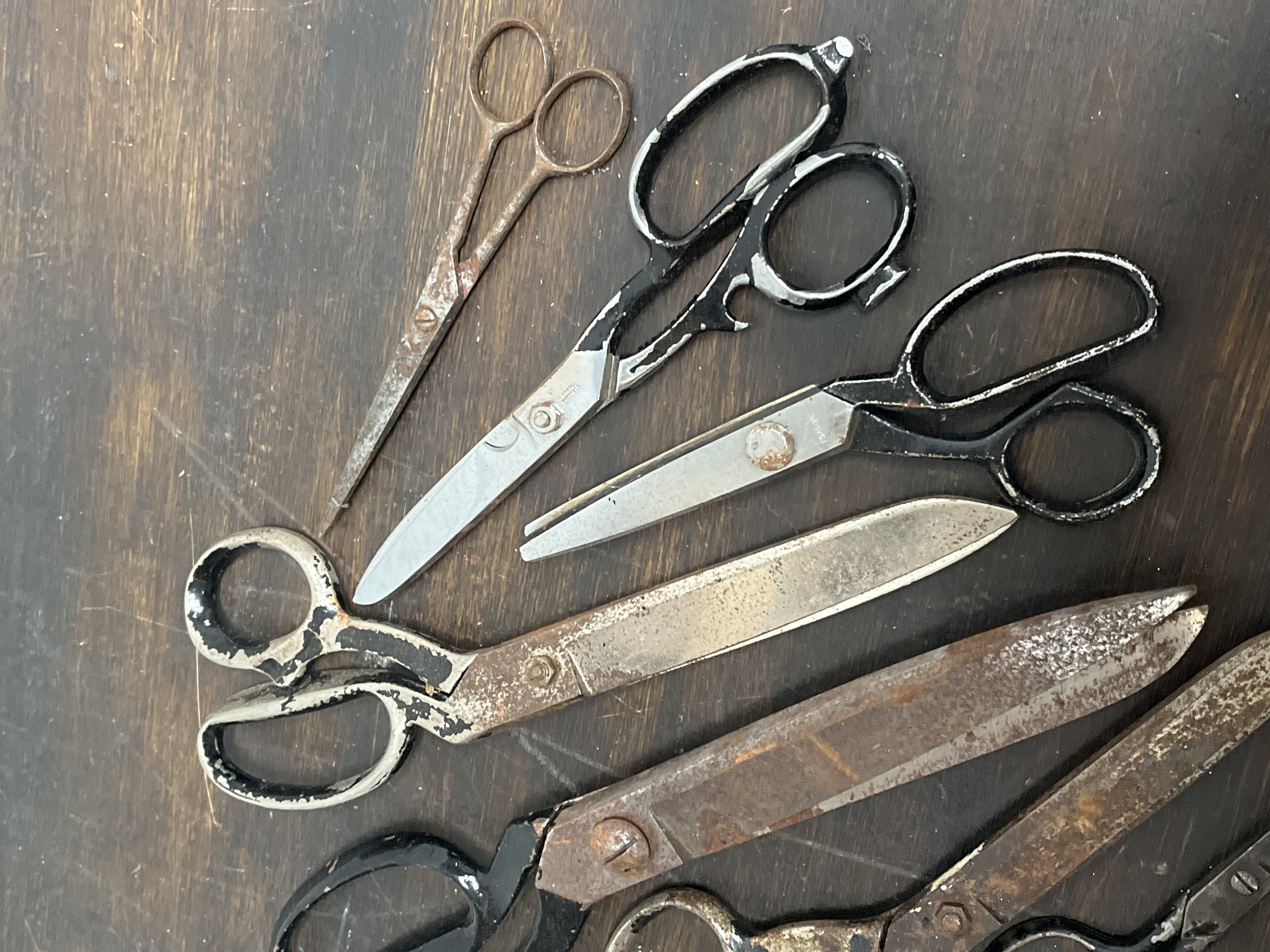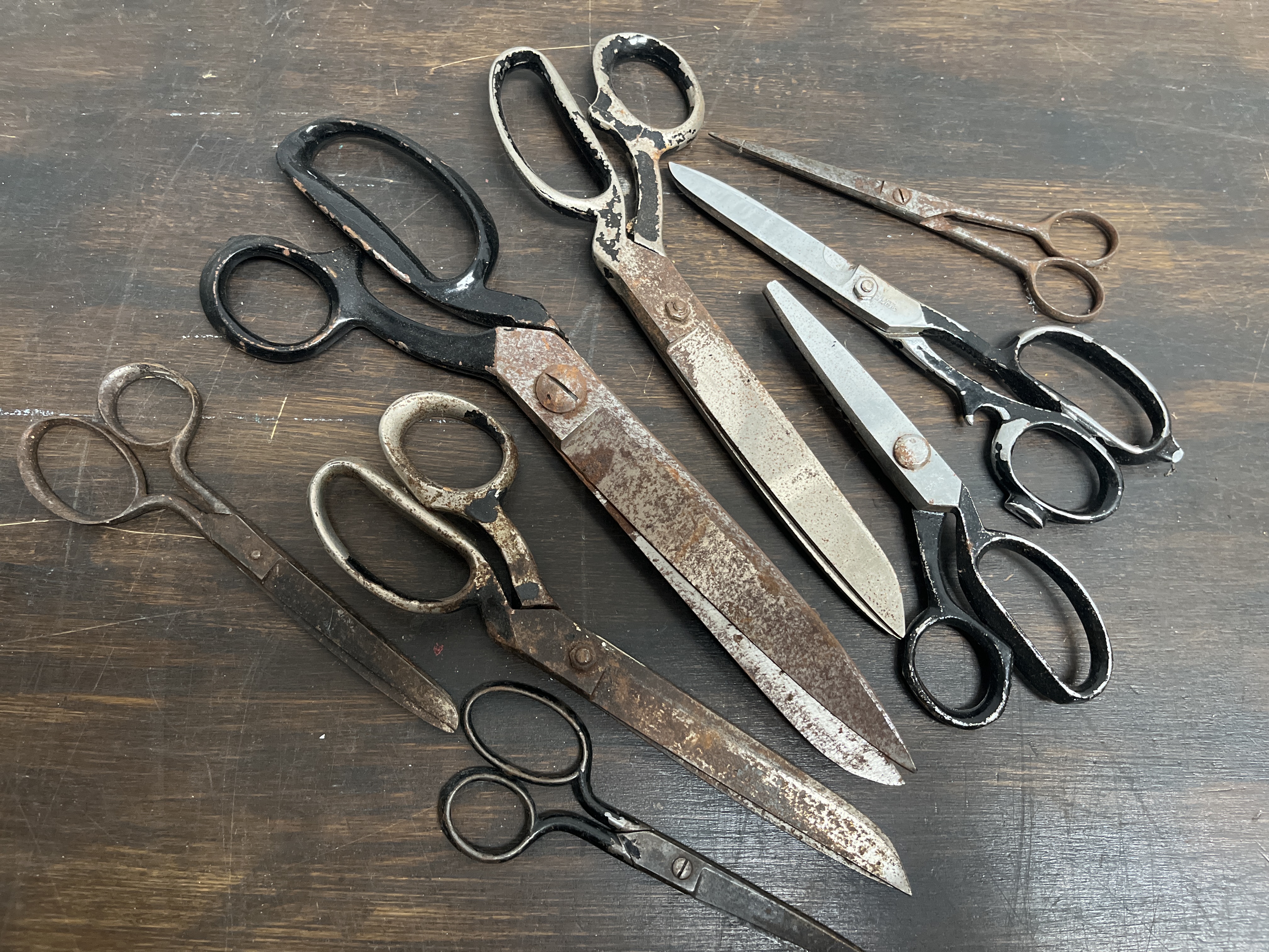 An assortment of vintage and antique metal scissors and tailor’s shears. The collection includes several large-scale industrial shears alongside smaller utility and detail scissors. The items are constructed from steel and iron, with some examples featuring black-painted handles. Faint, partially illegible stamped markings are visible on certain blades near the pivot points. The grouping contains various forms, including heavy-duty shears with offset handles and smaller, pointed utility scissors.