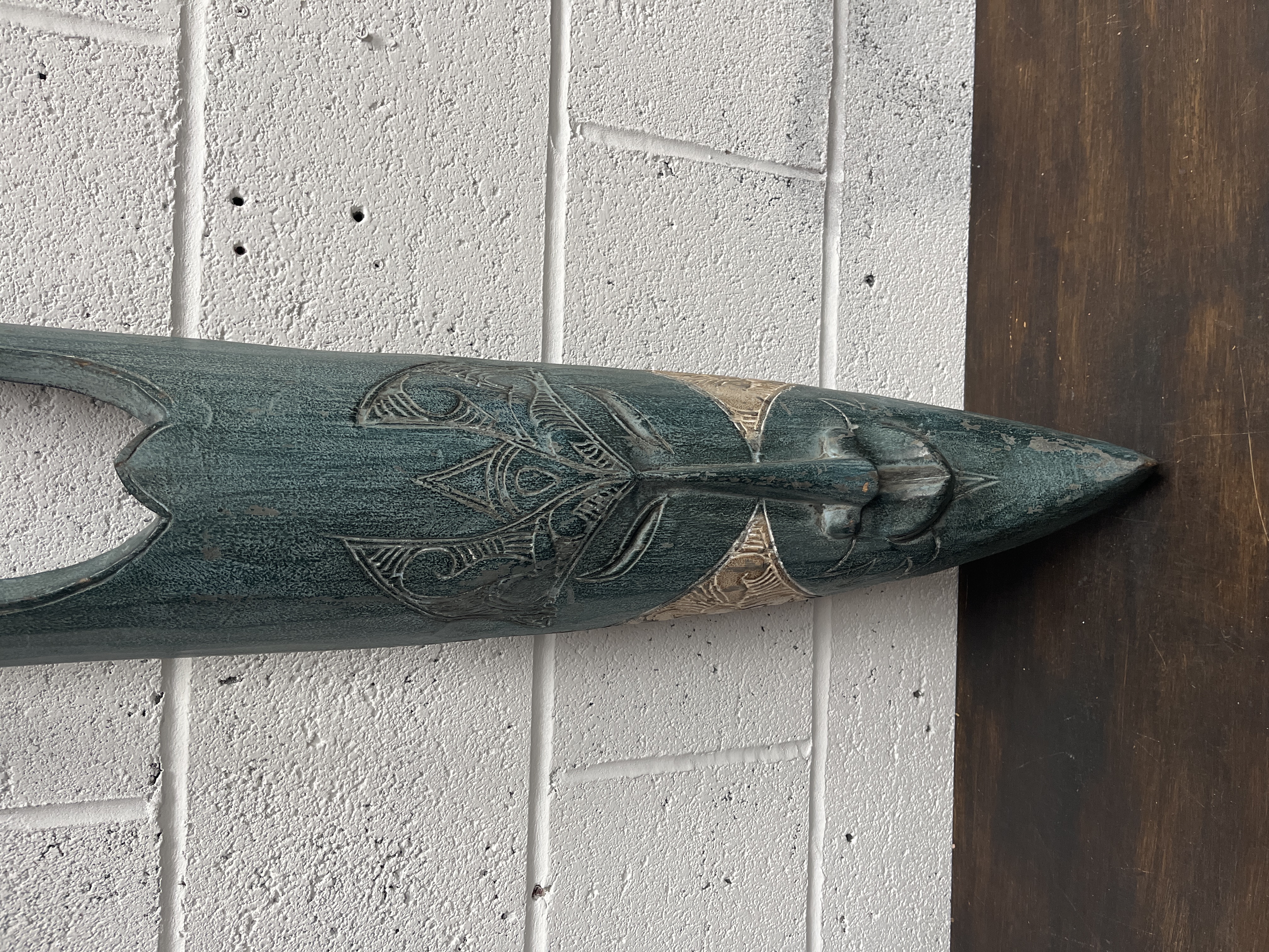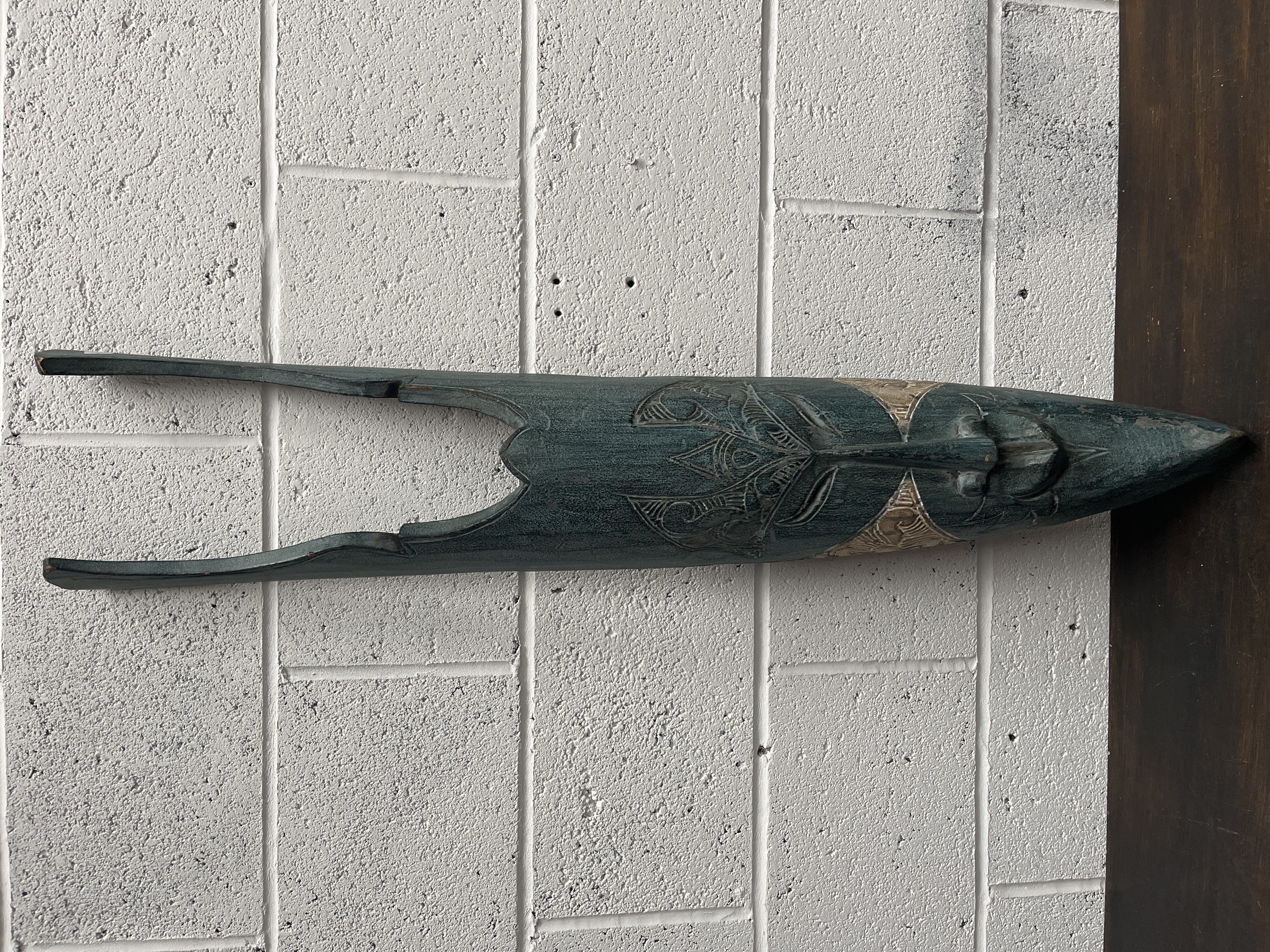 A large, elongated hand-carved wooden wall mask, measuring 39 inches by 7 inches, designed in a contemporary style inspired by traditional African and Tiki motifs. The object features a stylized face with a prominent, narrow nose and small mouth, integrated into a slender, tapered form that terminates in two long, parallel prongs. The surface is primarily finished in a weathered teal tone, accented by bands of lighter wood displaying intricate, symmetrical geometric and curvilinear carvings. The piece is constructed from a single block of wood and is intended for wall-mounted display.