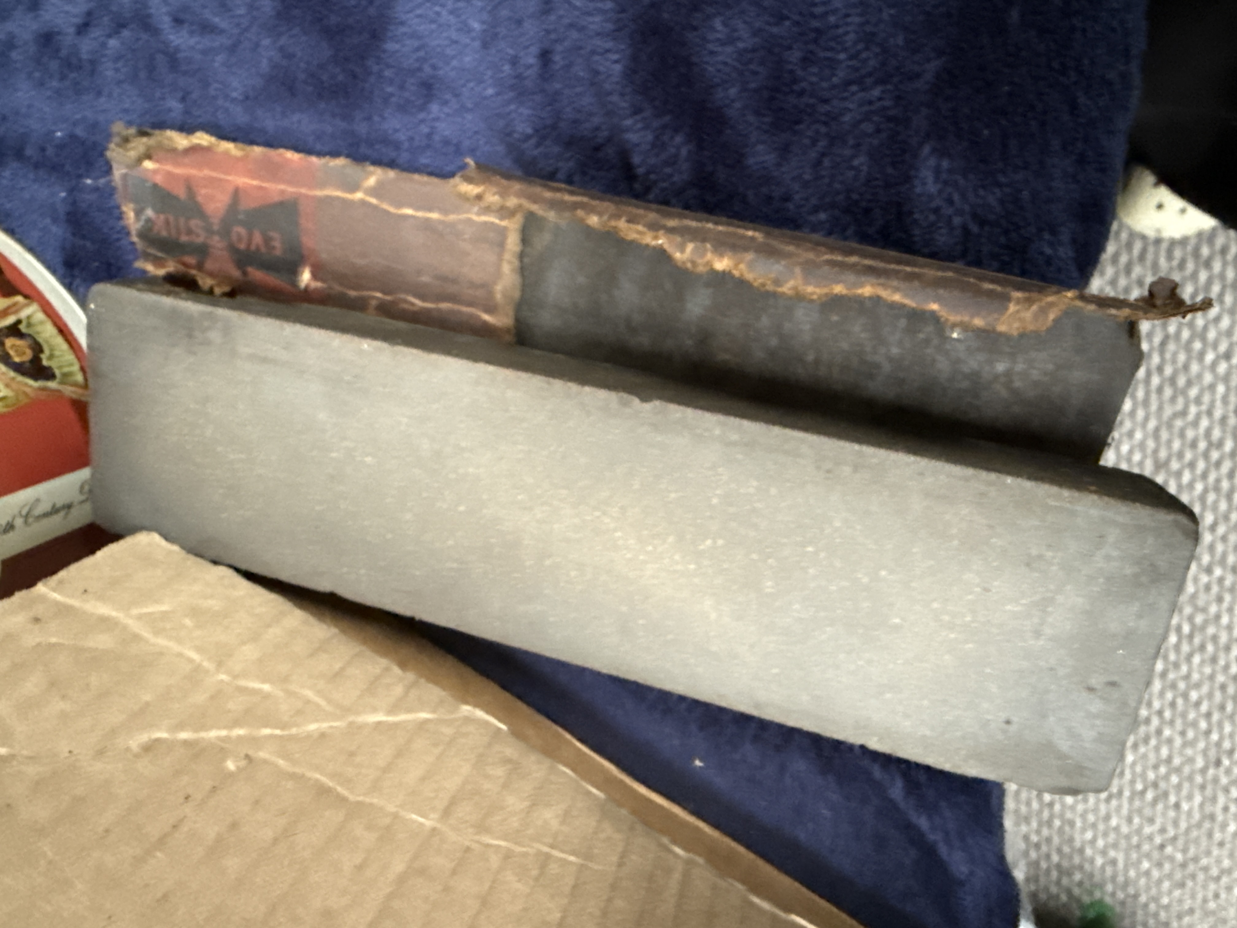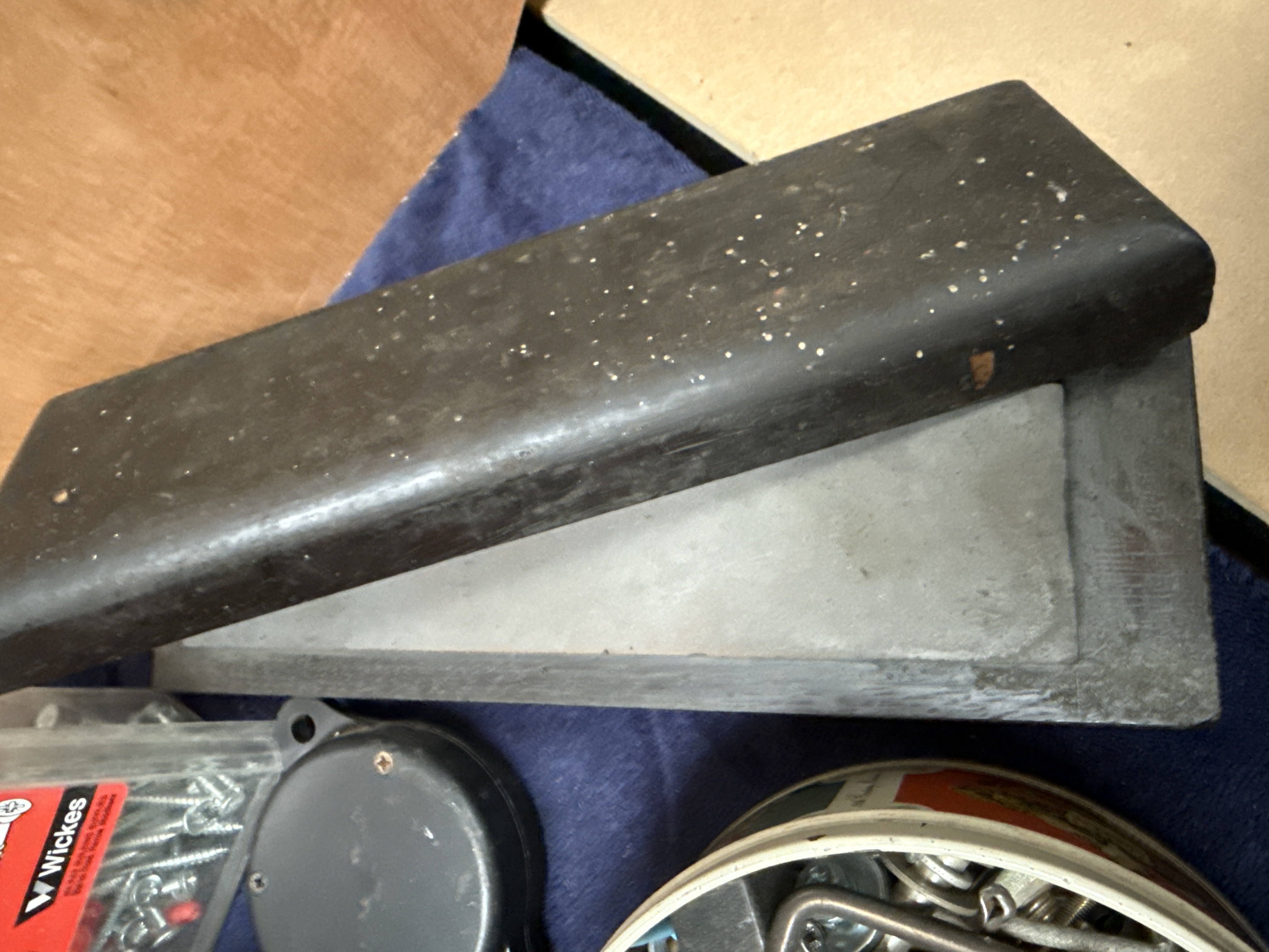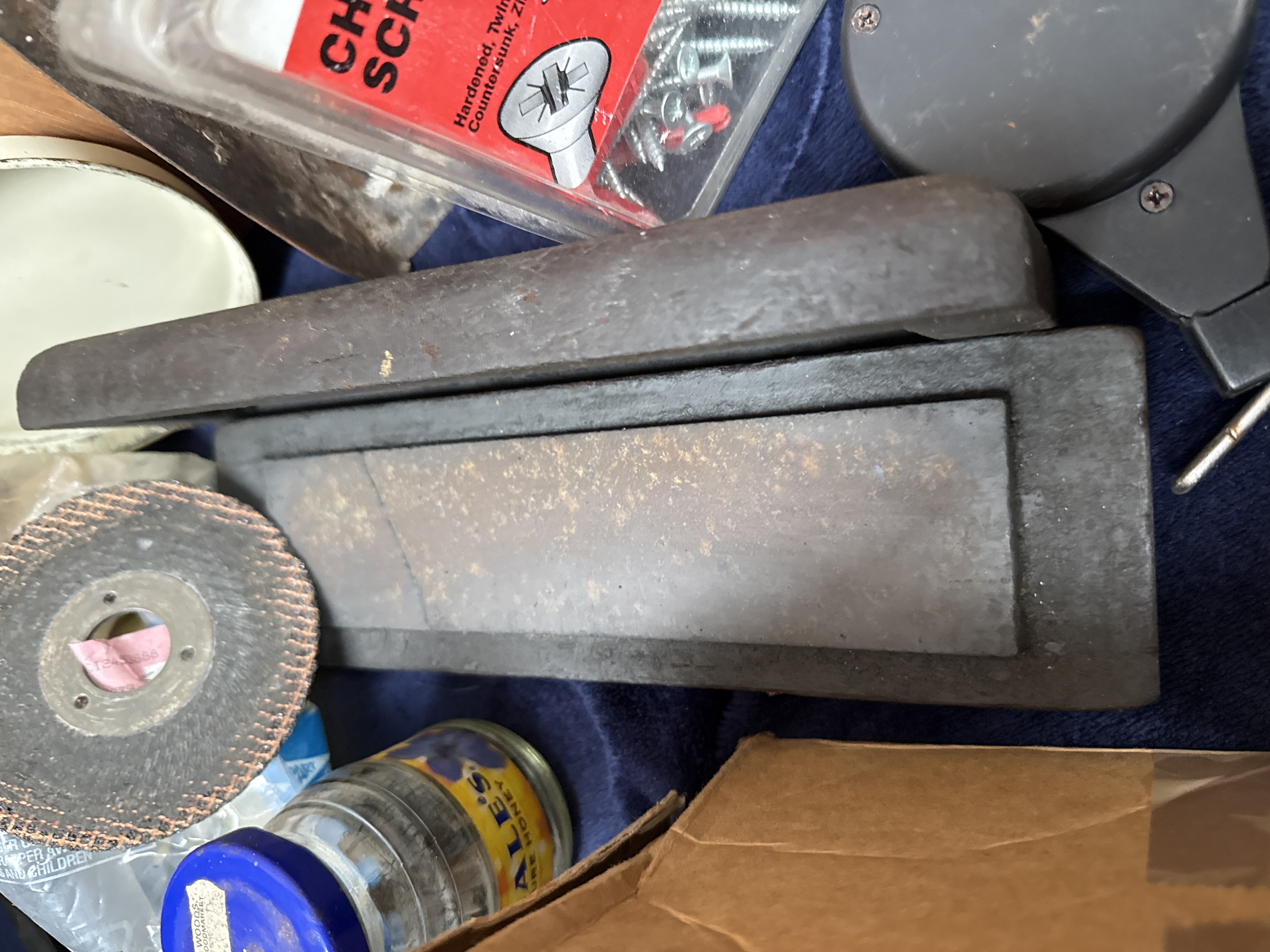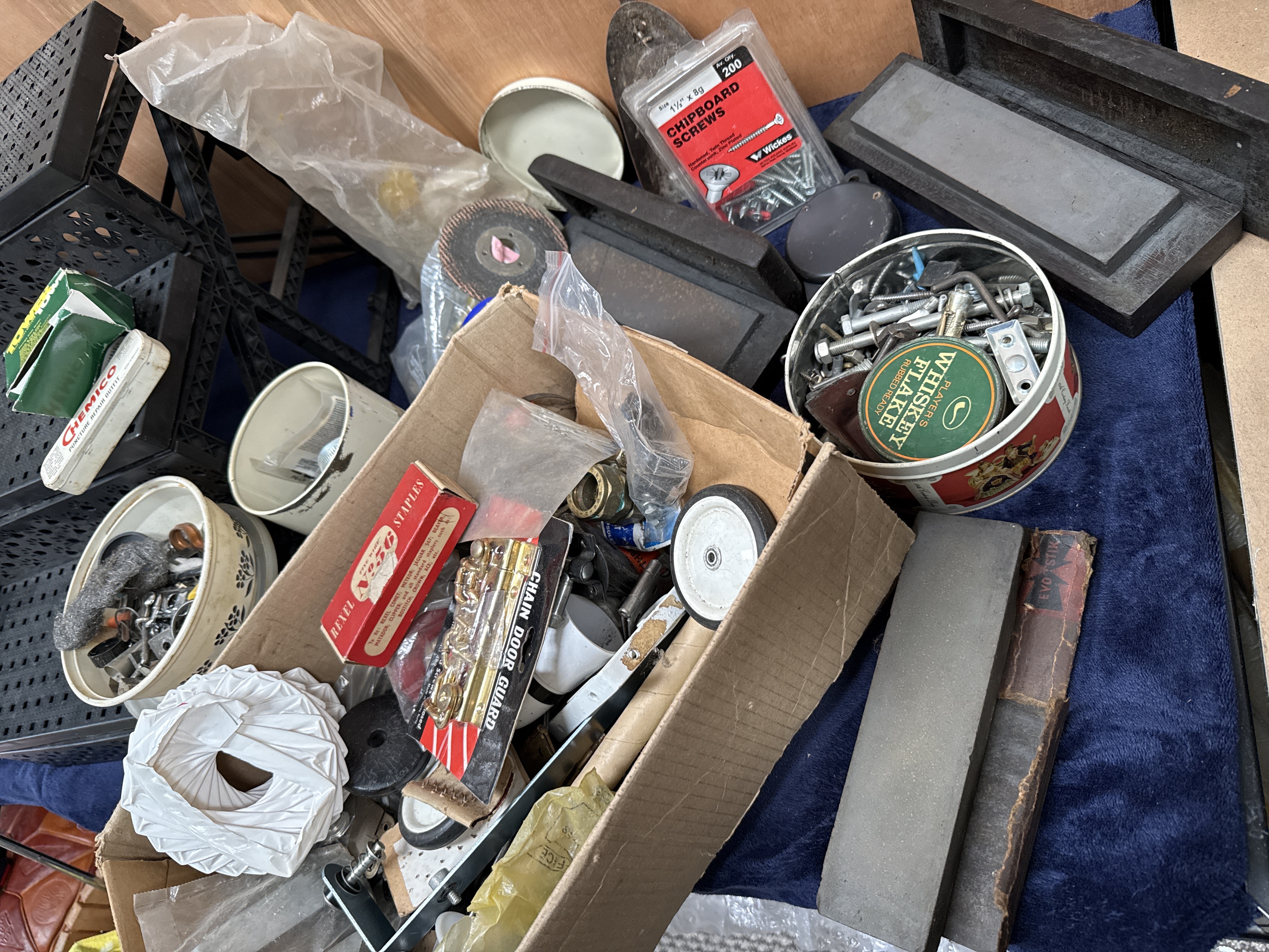 A collection of vintage and contemporary workshop tools and hardware. The lot includes several sharpening stones, with some examples housed in fitted wooden cases. Fasteners and components comprise a box of Rexel staples, a packaged chain door guard, and a container of Wickes chipboard screws. Notable vintage containers include a repurposed Player’s Whiskey Flake tobacco tin and a Chemico puncture repair outfit. Also present are multiple ceramic bowls and a cardboard box containing various metal parts, grinding discs, and small mechanical components. The items are constructed from various materials including steel, stone, wood, ceramic, and plastic.