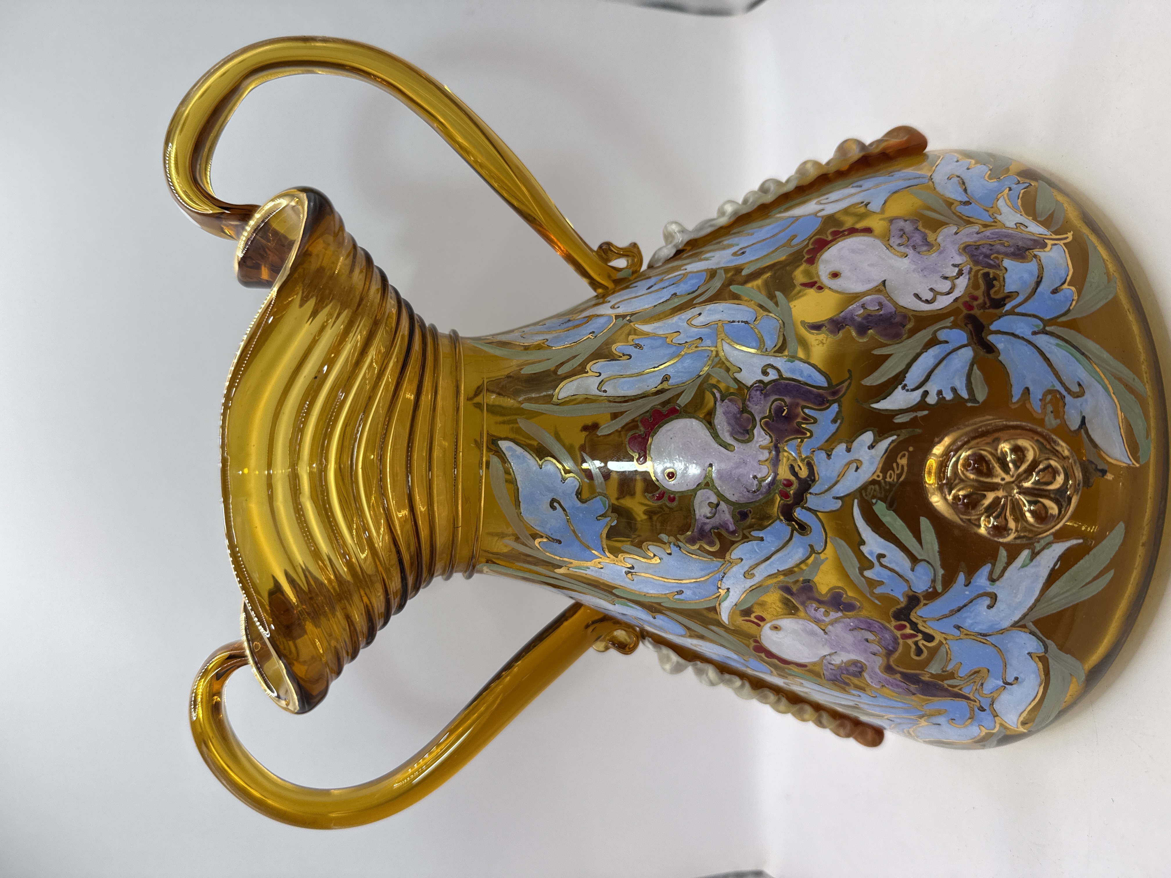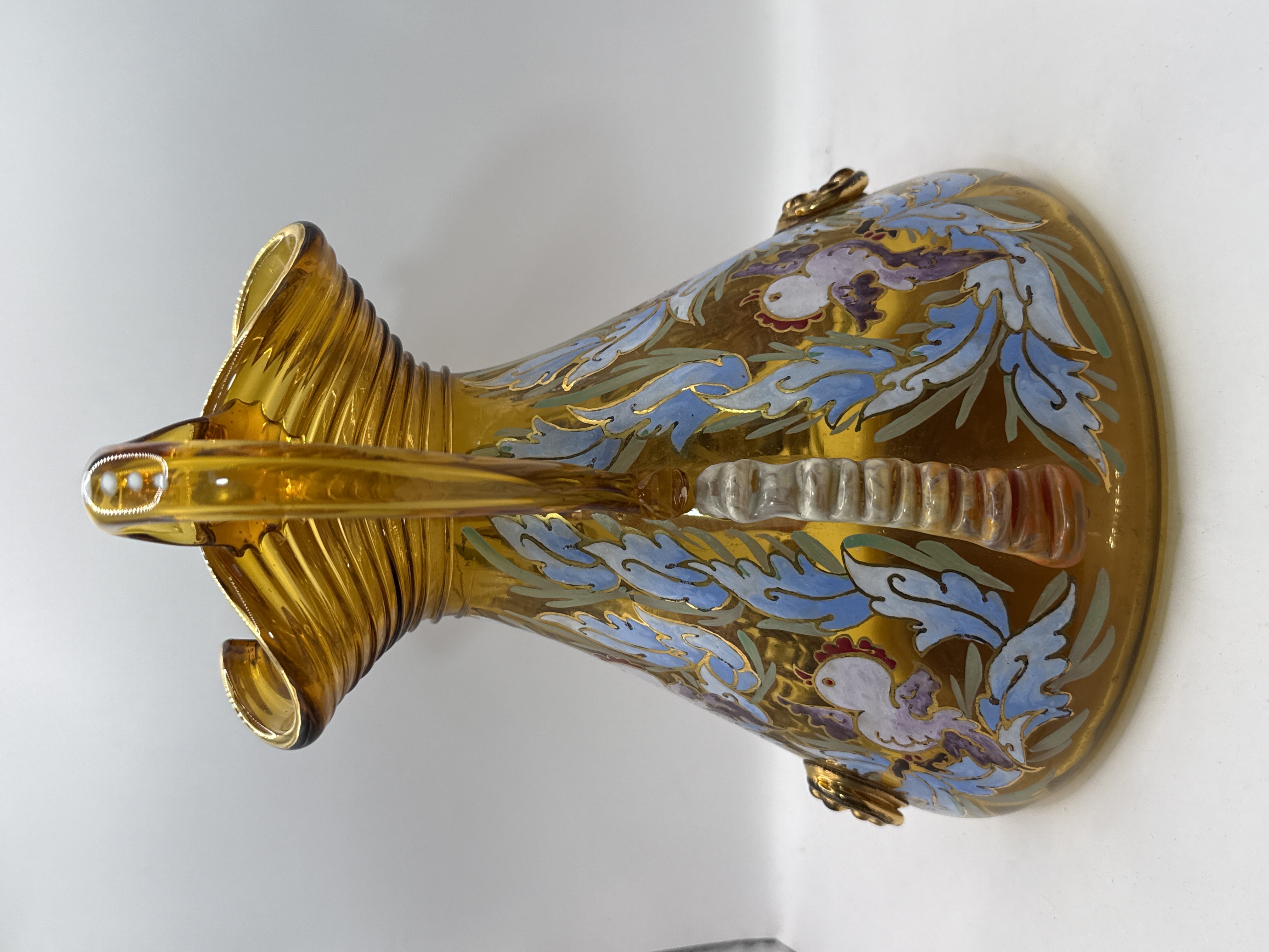 This Art Nouveau style ewer is crafted from amber-coloured glass and stands at 8.5 inches in height. The vessel features a ribbed, ruffled rim and two applied handles. The body is decorated with hand-painted enamel depicting roosters amongst scrolling floral foliage in light blue, lavender, and white, further embellished with gold accents. The piece includes applied glass details, such as a textured ridge on the sides and a circular prunt with a moulded floral design. A hand-painted signature, which reads E. Gallé, is visible in gold enamel on the side. The craftsmanship and decorative motifs are characteristic of late 19th or early 20th-century Bohemian glass, resembling the work of Moser.