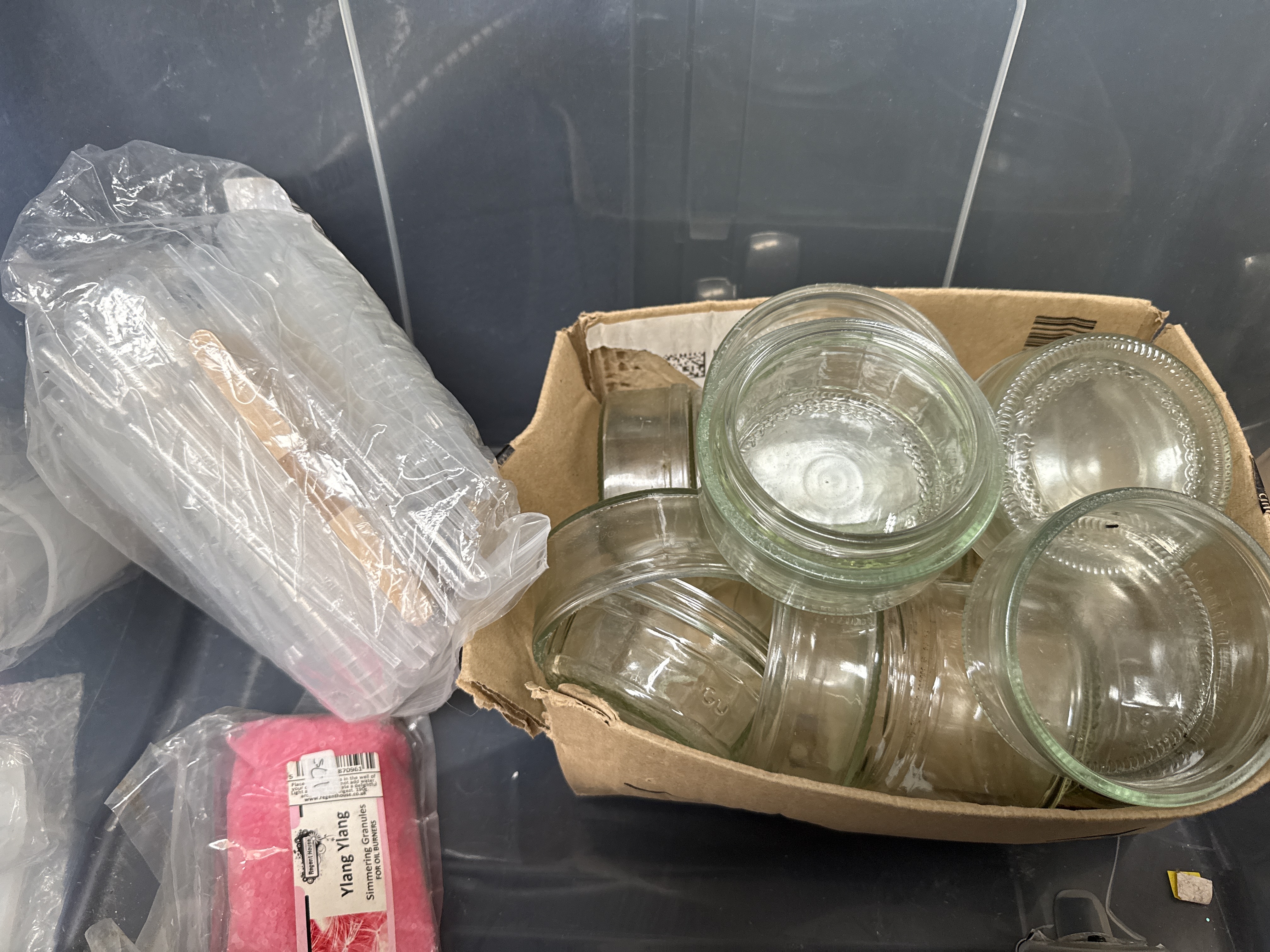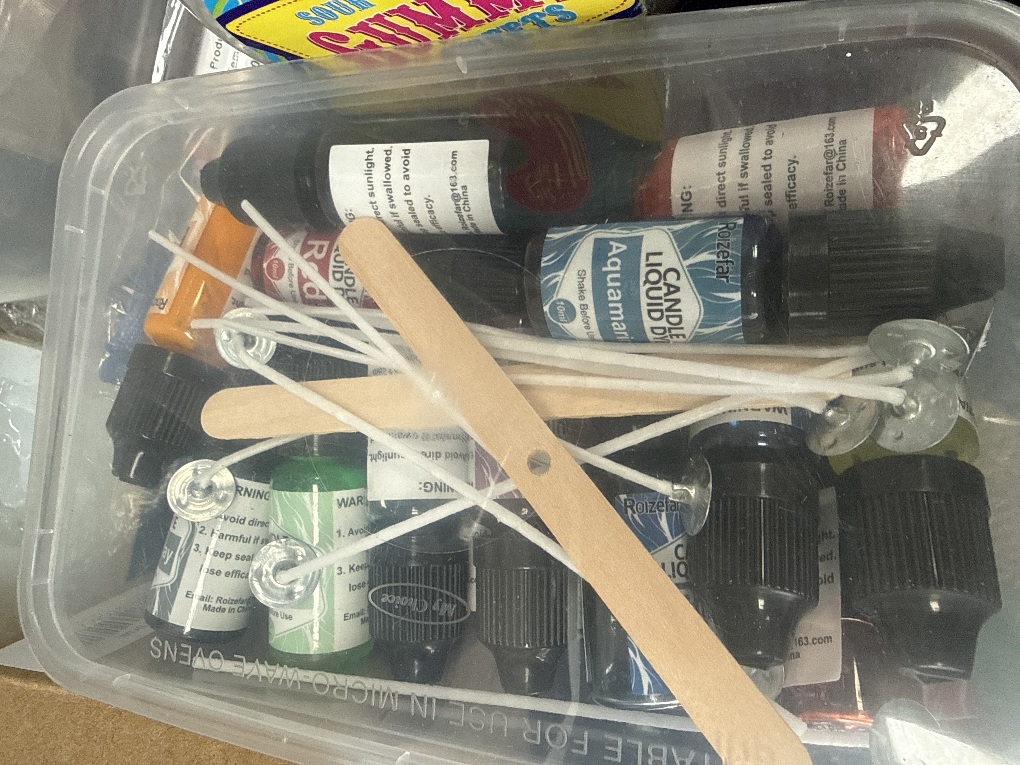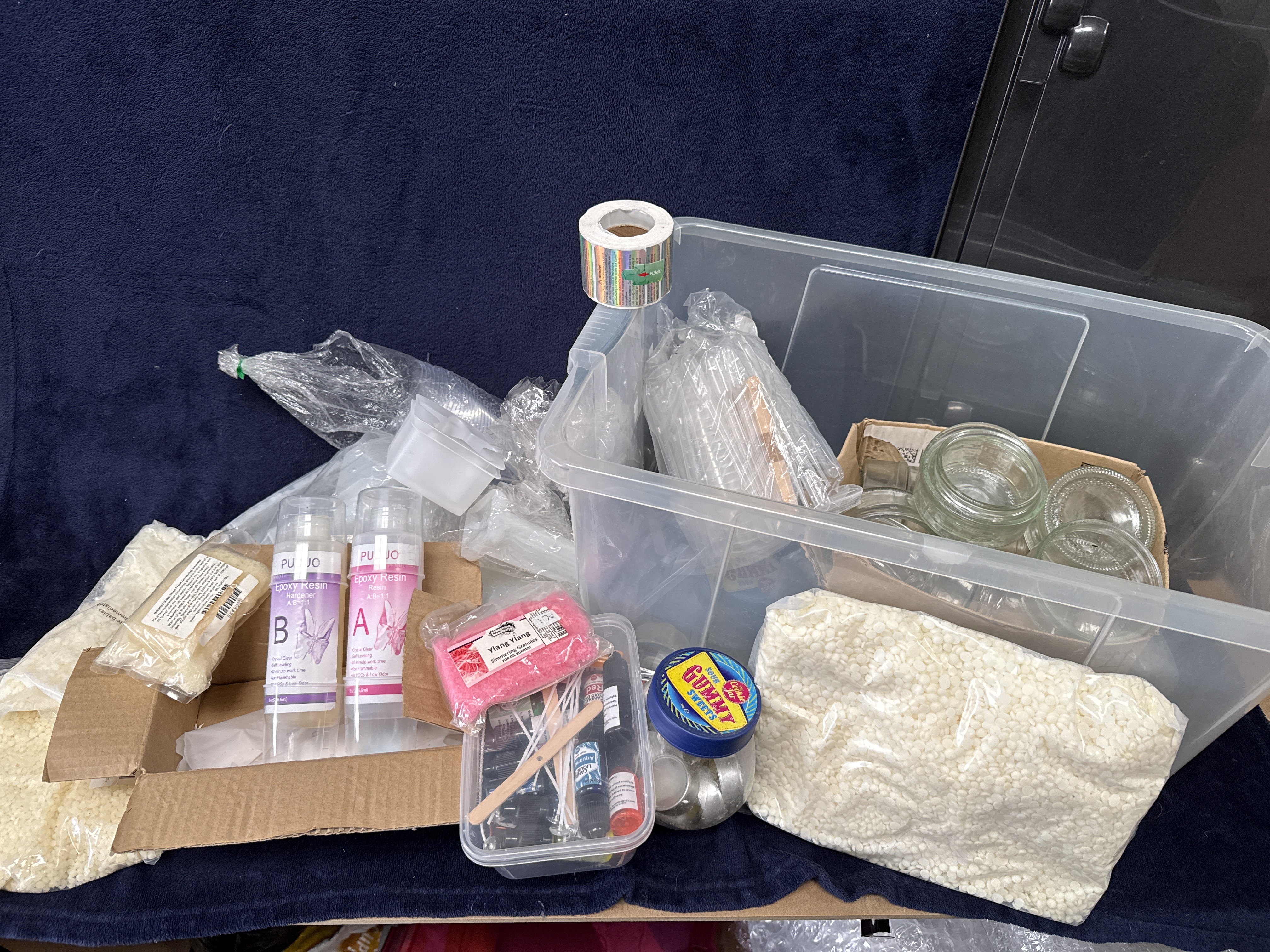 An assortment of craft materials and equipment for candle production and resin casting. The collection includes two 8oz bottles of Puduo Epoxy Resin (Part A and Part B), multiple bags of white wax pellets, and several small glass jars. The lot also contains several bottles of Roizefar candle liquid dye in various colours, candle wicks with metal tabs, wooden stirrers, and scented simmering granules. Technical apparatus includes a digital probe thermometer in its original packaging, various silicone moulds, plastic measuring cups, and pipettes. The wax melt contents and associated materials are housed within a clear plastic storage bin.