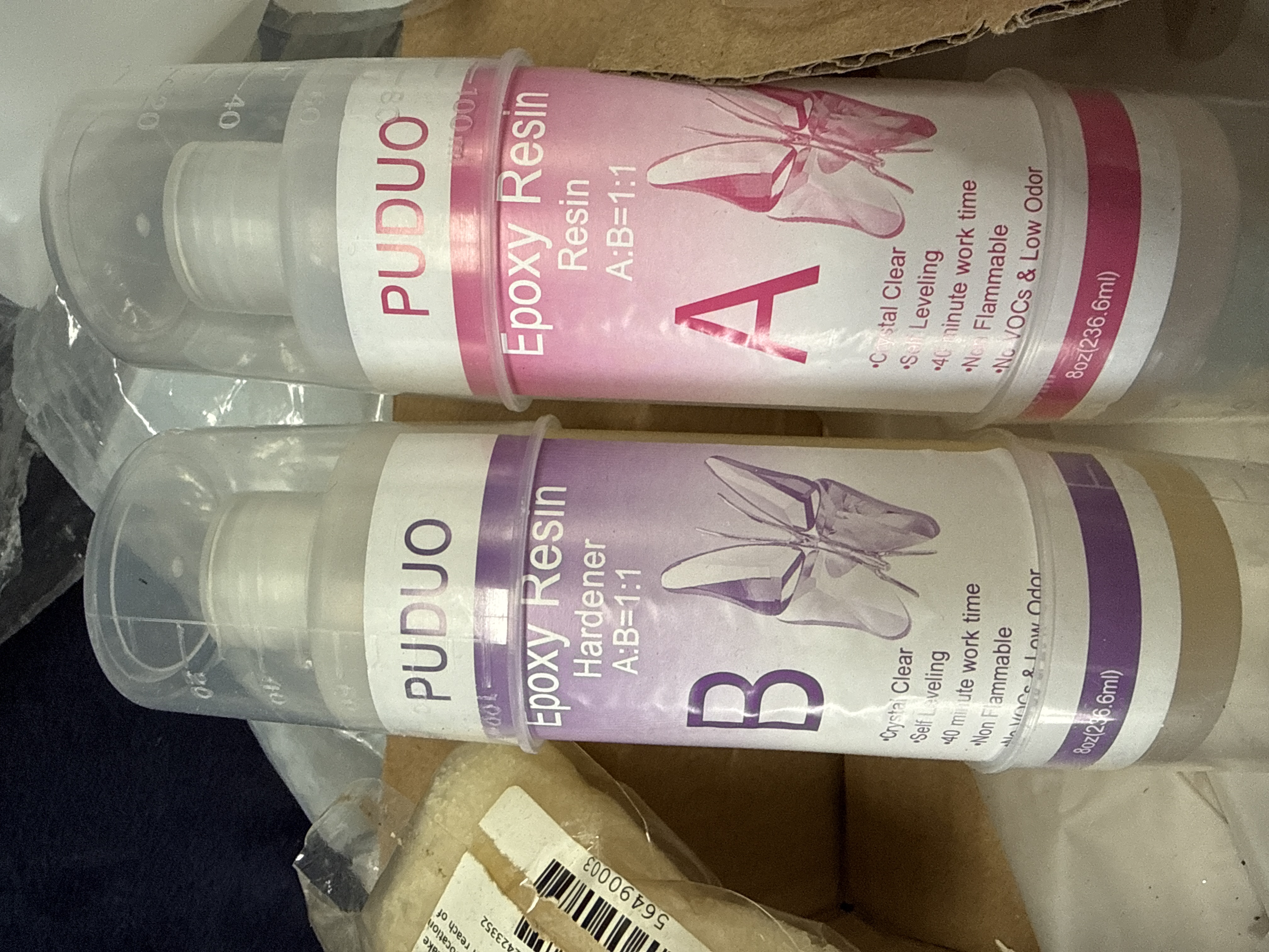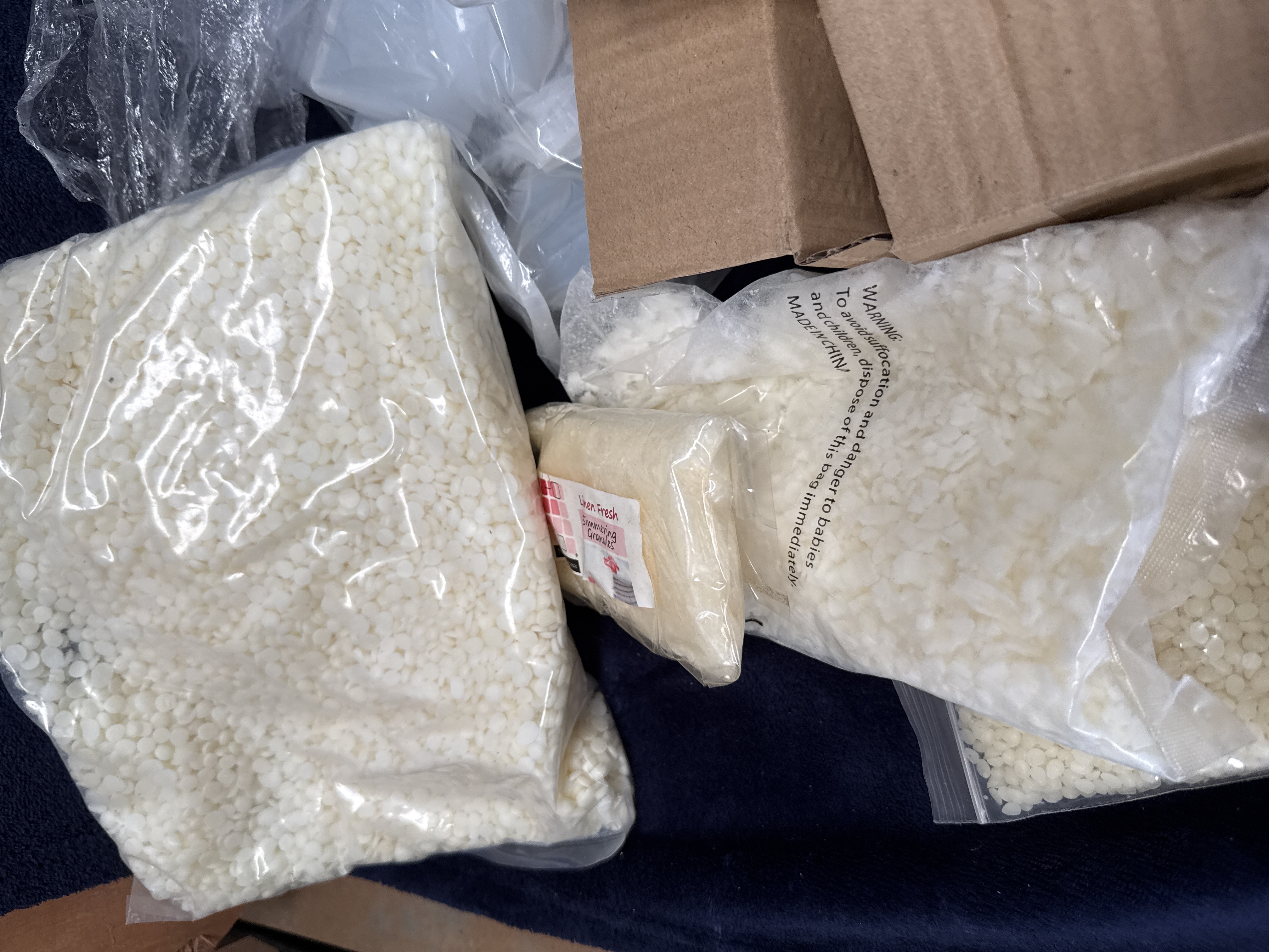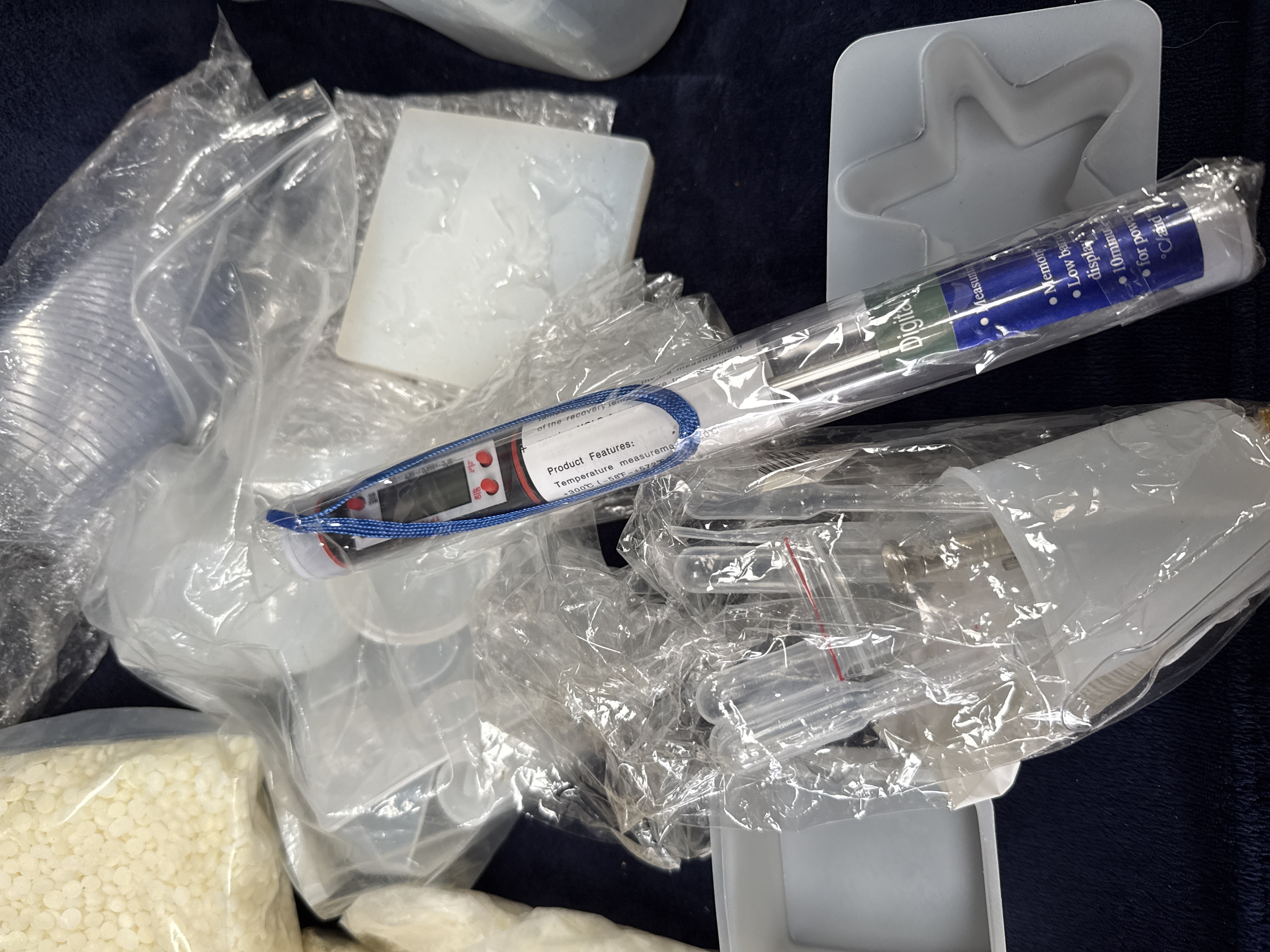 An assortment of craft materials and equipment for candle production and resin casting. The collection includes two 8oz bottles of Puduo Epoxy Resin (Part A and Part B), multiple bags of white wax pellets, and several small glass jars. The lot also contains several bottles of Roizefar candle liquid dye in various colours, candle wicks with metal tabs, wooden stirrers, and scented simmering granules. Technical apparatus includes a digital probe thermometer in its original packaging, various silicone moulds, plastic measuring cups, and pipettes. The wax melt contents and associated materials are housed within a clear plastic storage bin.