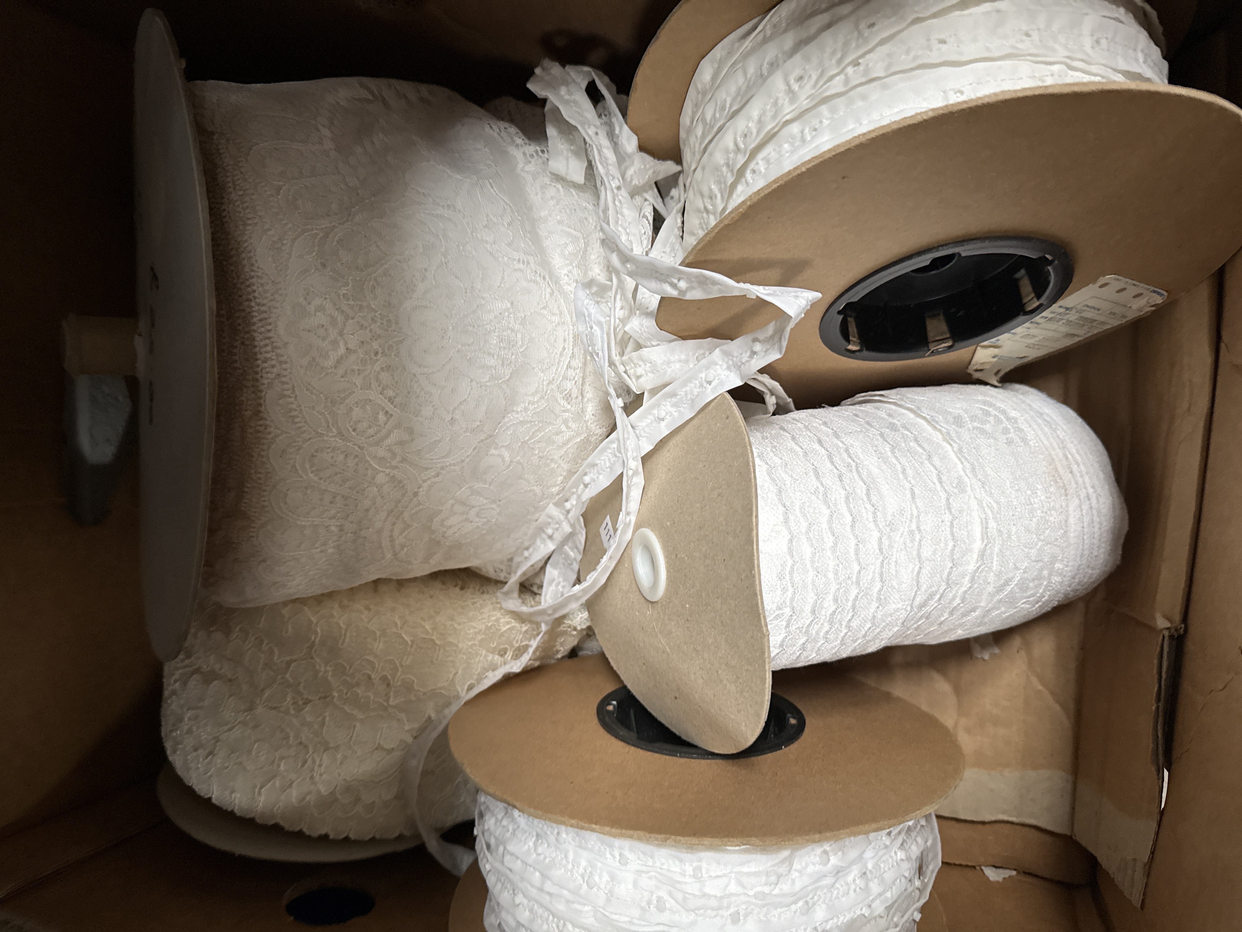 An assortment of white and off-white lace and eyelet embroidery trims. The collection features various widths and patterns, including intricate floral lace and broderie anglaise style eyelet designs. The trims are wound onto a variety of cardboard and plastic spools of differing diameters. One large cardboard spool end displays handwritten notations including £25.00 and 6, while another spool retains a partial commercial paper label.
