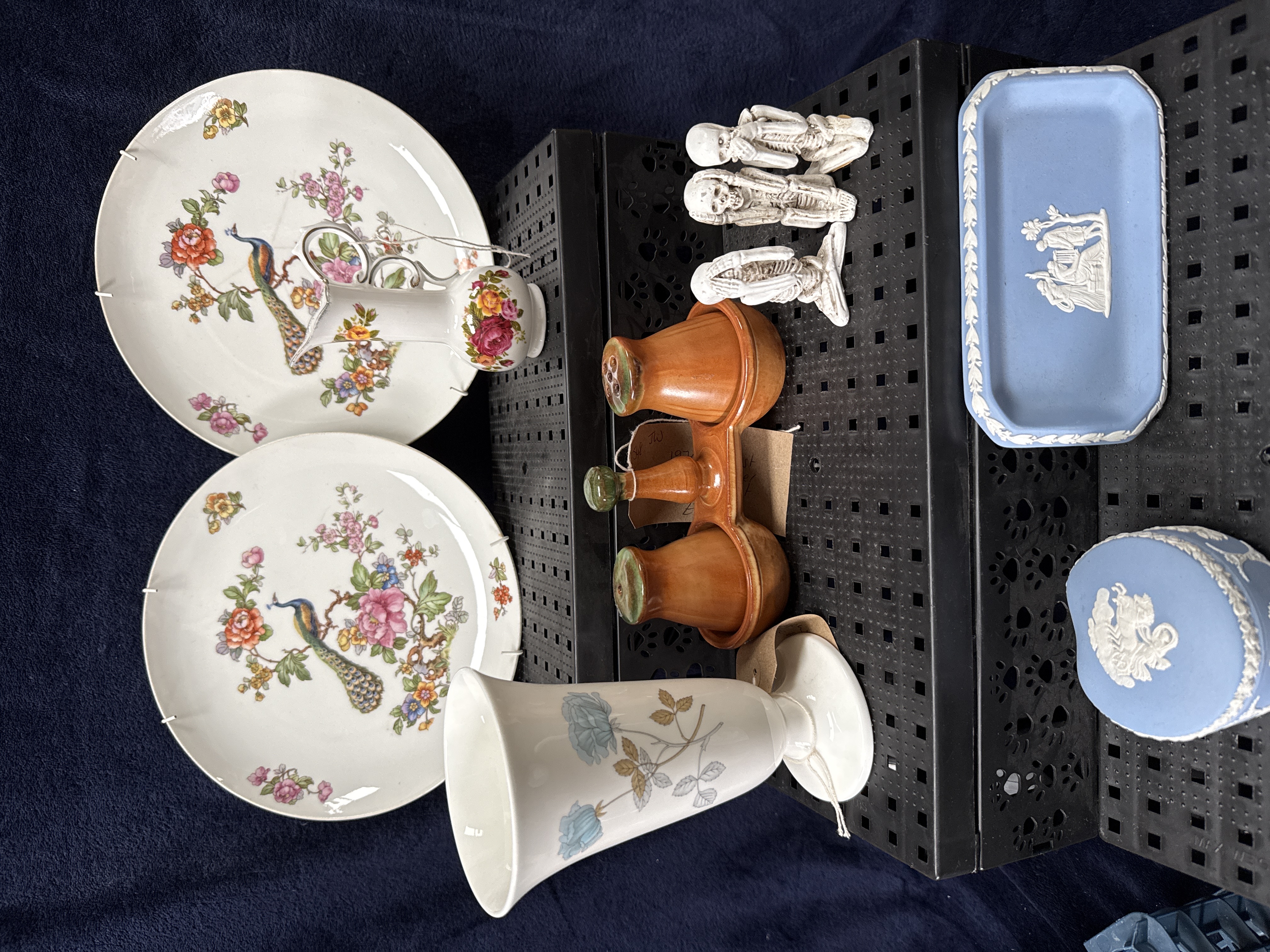 A varied collection of decorative ceramics and porcelain. The group includes two pieces of blue jasperware by Wedgwood, comprising a rectangular tray and a circular lidded box, both featuring white classical relief decorations. Also included are two porcelain plates and a matching small creamer, each decorated with polychrome floral and peacock motifs. The lot further contains a white porcelain vase with blue rose designs, a brown-glazed earthenware condiment set on a stand, and three small white skeleton figurines. Several items feature attached wire display hangers or paper cataloguing tags.