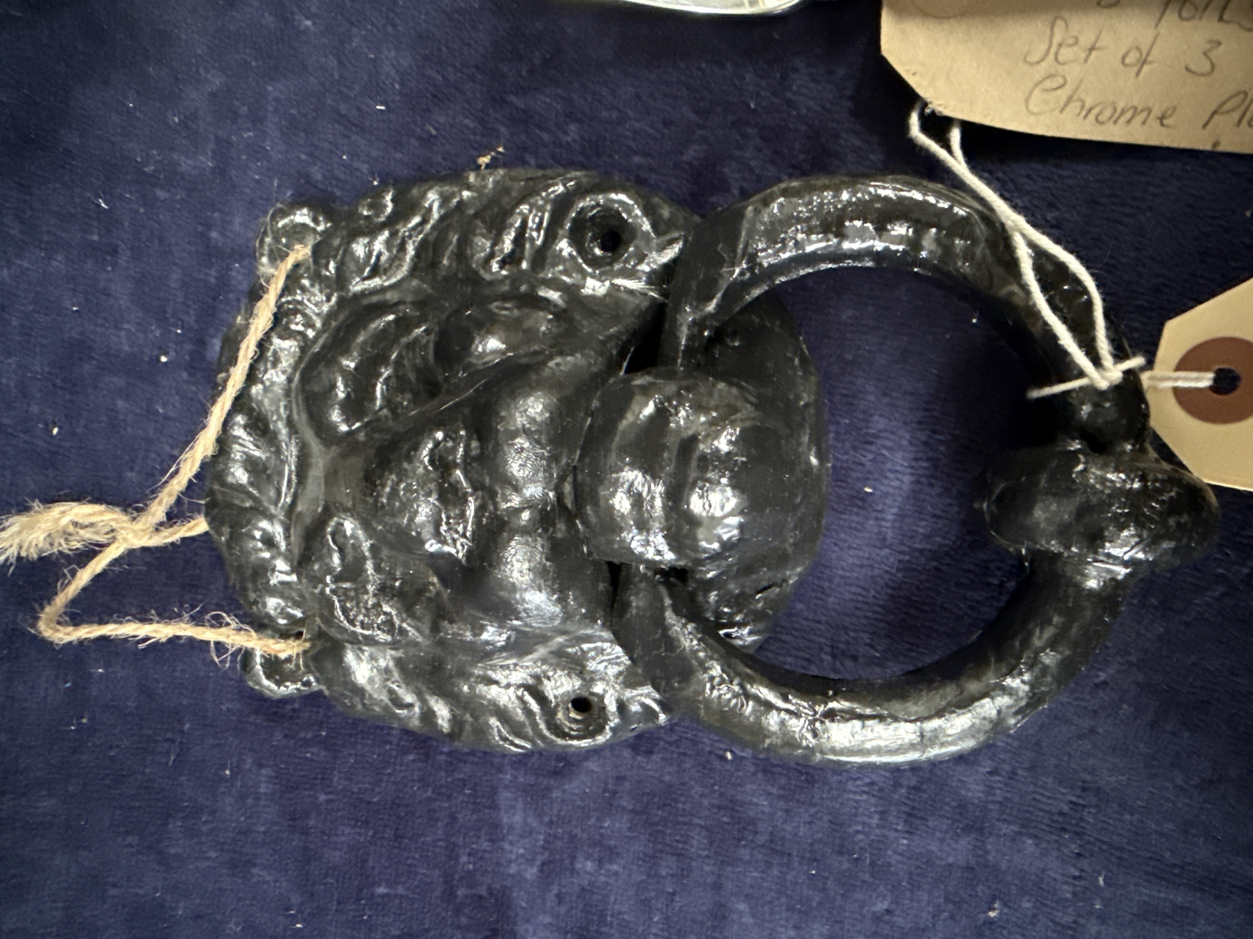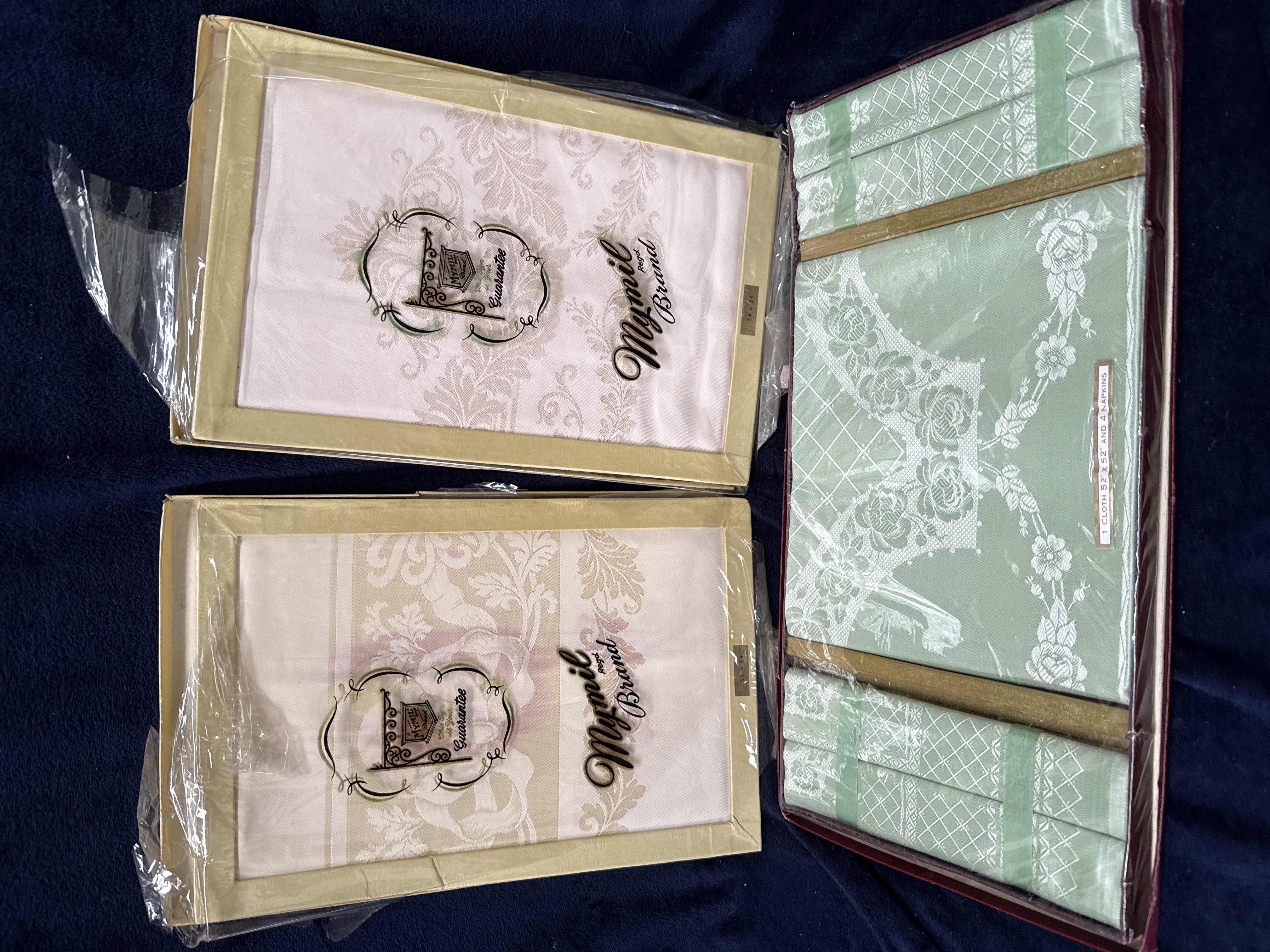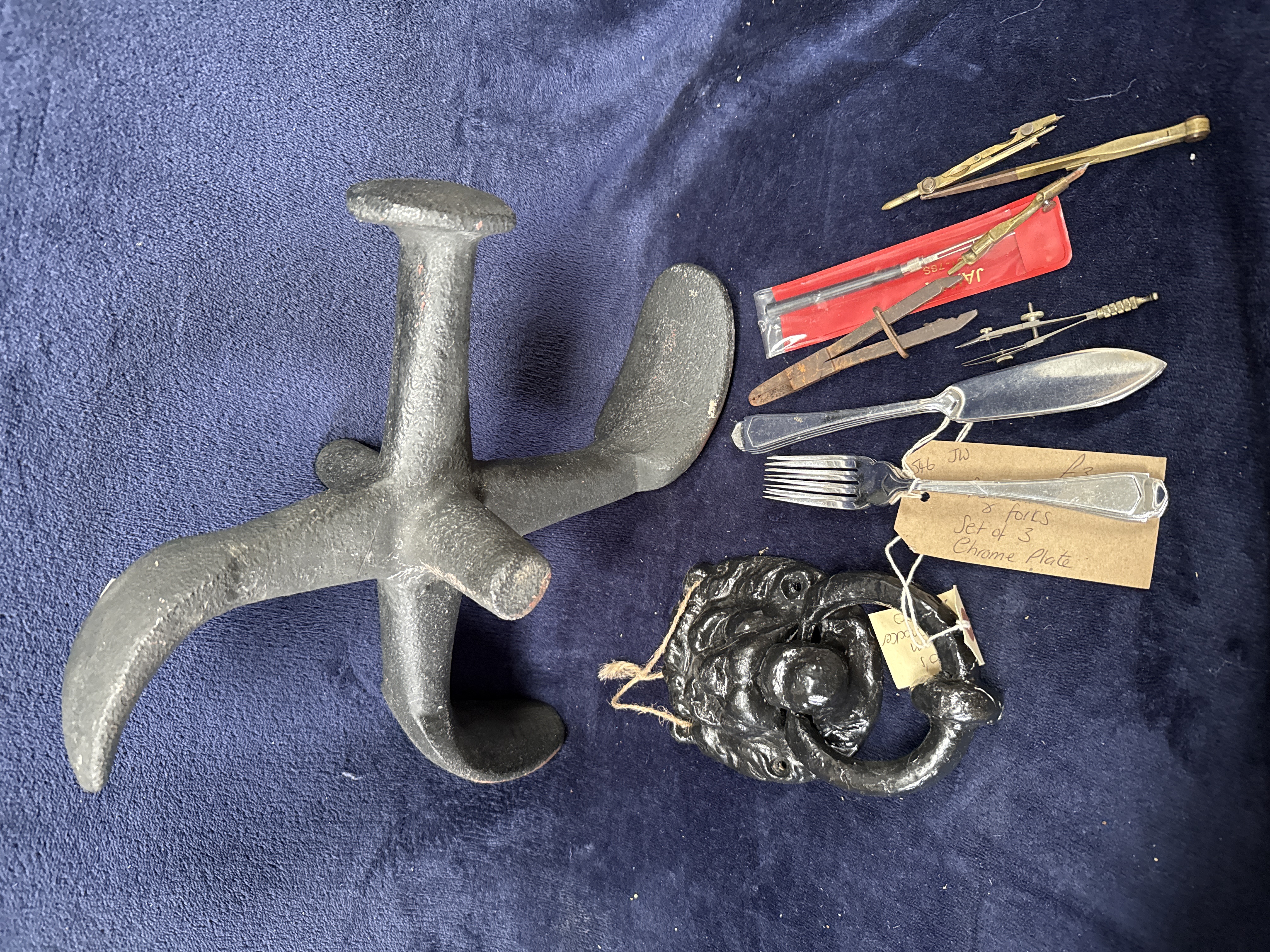 A collection of household and utilitarian items comprising several boxed sets of vintage damask table linens by Mymil Brand. The linens are presented in cream and green colourways, with some featuring original retail packaging and labels. One green set is labelled as containing a cloth measuring 52 inches by 52 inches and four napkins. The lot also includes a cast iron cobbler’s shoe last with multiple arms and a black-painted cast iron door knocker in the form of a lion’s head. Additionally, the collection contains several pieces of chrome-plated flatware and an assortment of brass and metal drafting tools, including compasses and dividers.