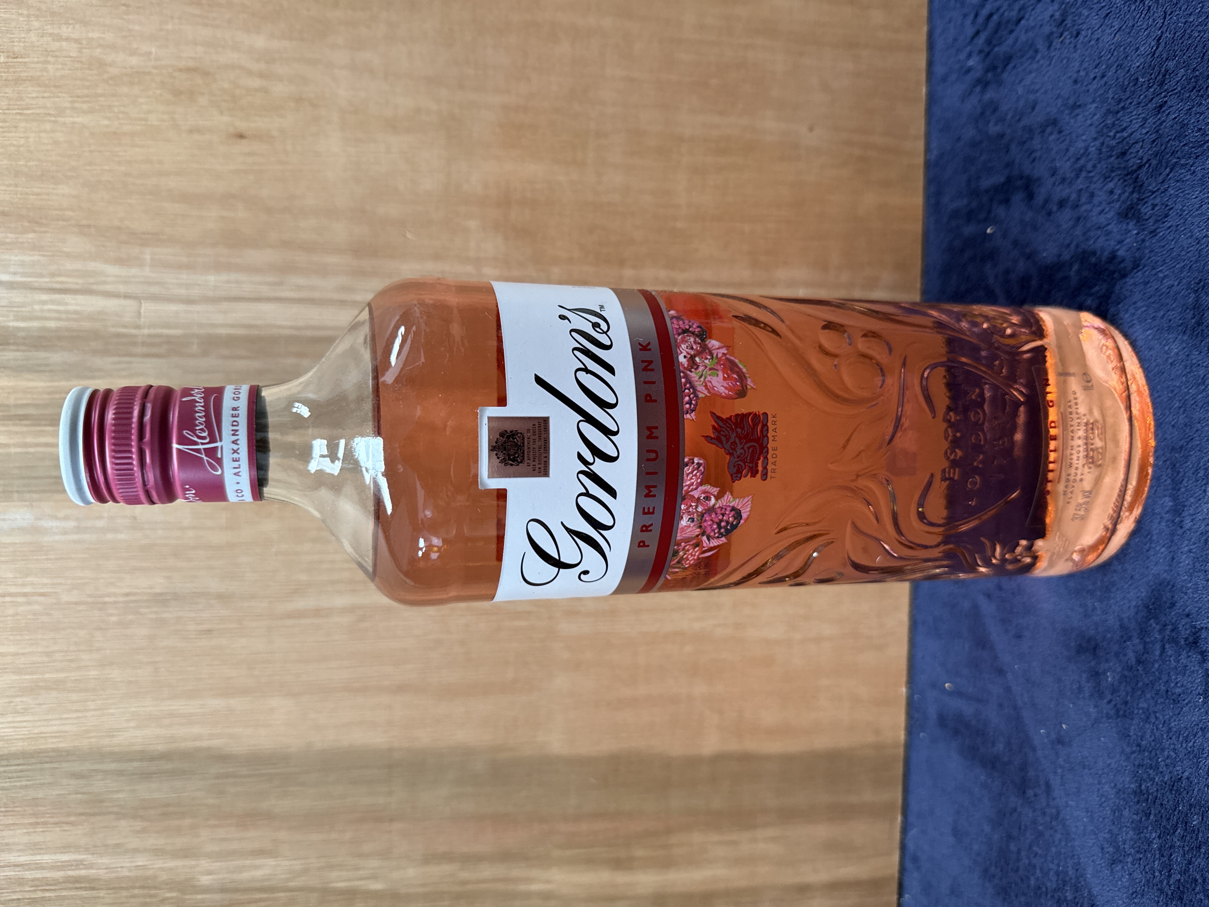 A one-litre bottle of Gordon’s Premium Pink Distilled Gin. The glass bottle features embossed decorative scrollwork and the mark ESTD LONDON 1769. The central label is printed in white and red with the Gordon’s brand name in script, identified as PREMIUM PINK, and includes illustrations of strawberries and raspberries alongside a Royal Warrant crest. The bottle is sealed with a magenta-coloured metal screw cap bearing the name Alexander Gordon & Co. The label specifies an alcohol content of 37.5% vol.