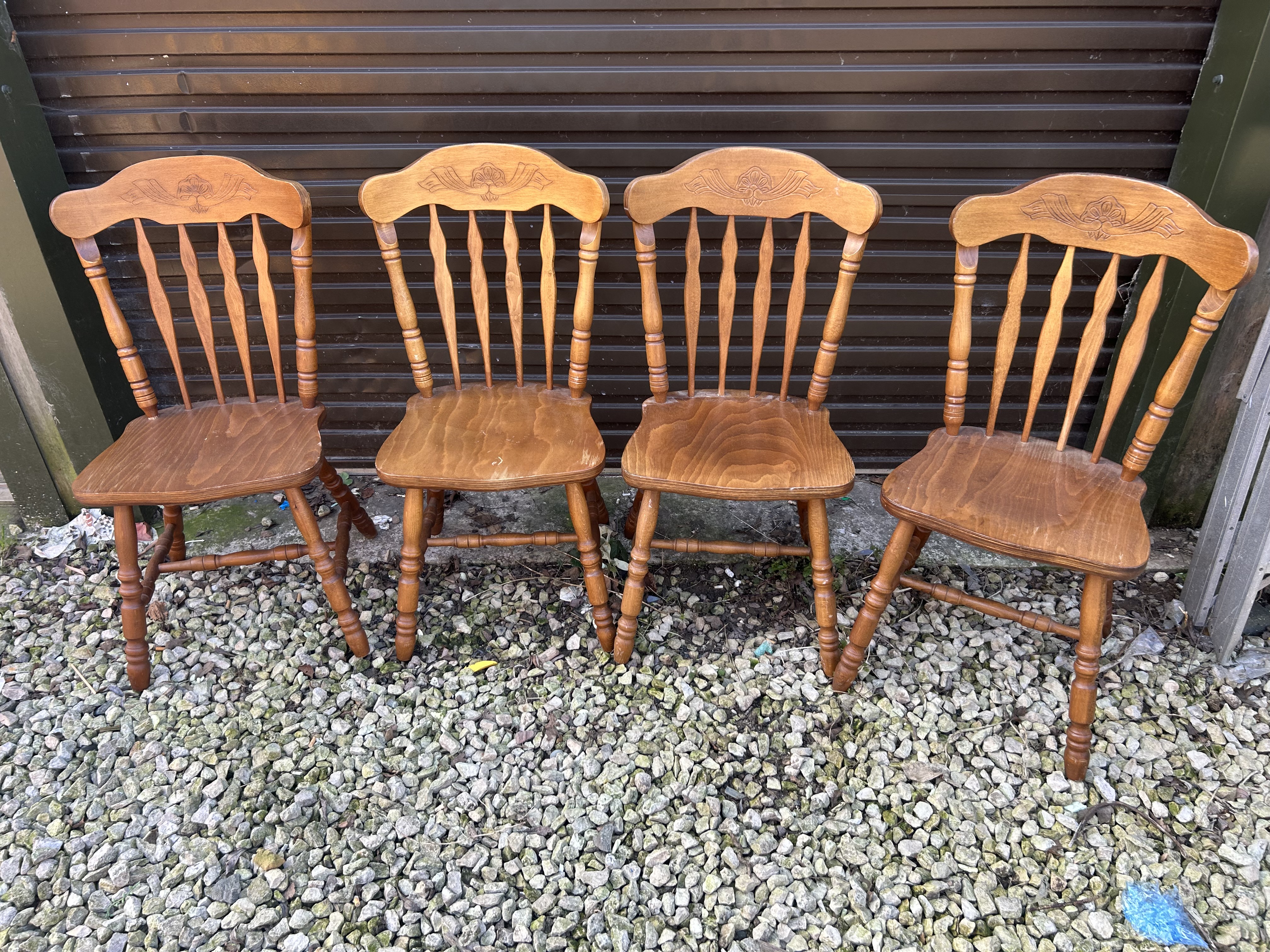 A set of stained wood dining chairs in the Colonial style, attributed to the Ethan Allen Heirloom Nutmeg collection. Each chair is constructed with a curved crest rail featuring an incised floral decorative motif. The backrest consists of five turned spindles set into a contoured wooden seat. The chairs are supported by four turned legs connected by an H-pattern stretcher system. The items are finished in a medium-brown wood stain. No maker’s marks or branding are visible on the pieces.