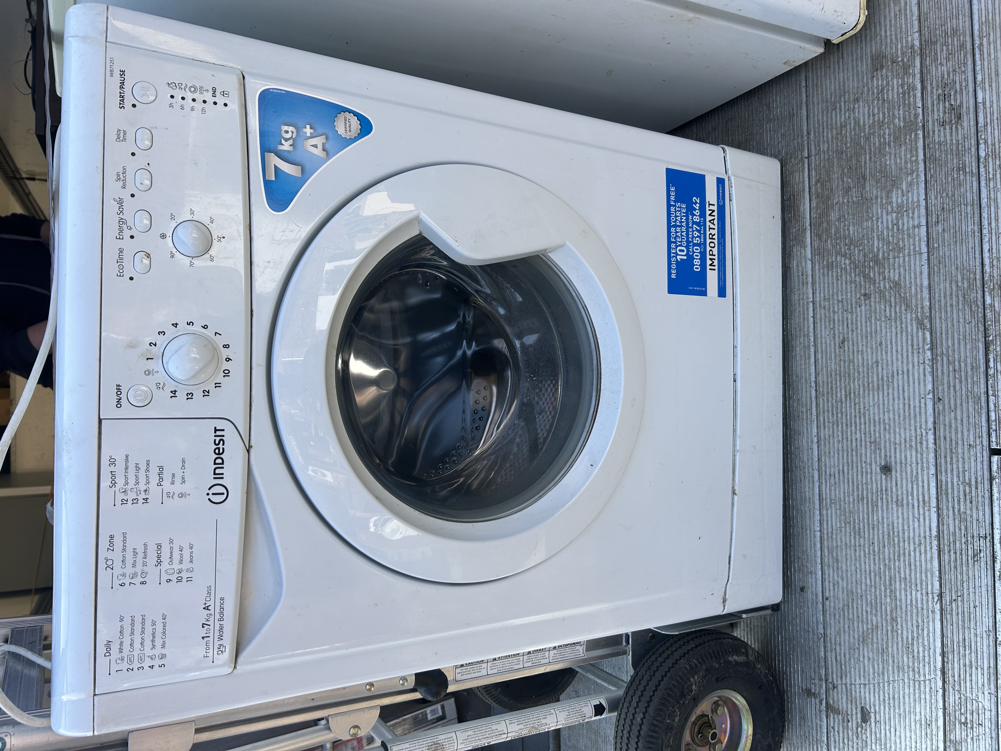 A front-loading Indesit washing machine, model IWB71251, finished in white. The appliance has a 7kg load capacity and an A+ energy rating. The control fascia includes a programme selector dial numbered 1 to 14, a temperature adjustment dial, and various function buttons including EcoTime, Energy Saver, Spin Reduction, and Delay Timer. The front panel displays the Indesit logo and a blue adhesive label regarding a ten-year parts guarantee.