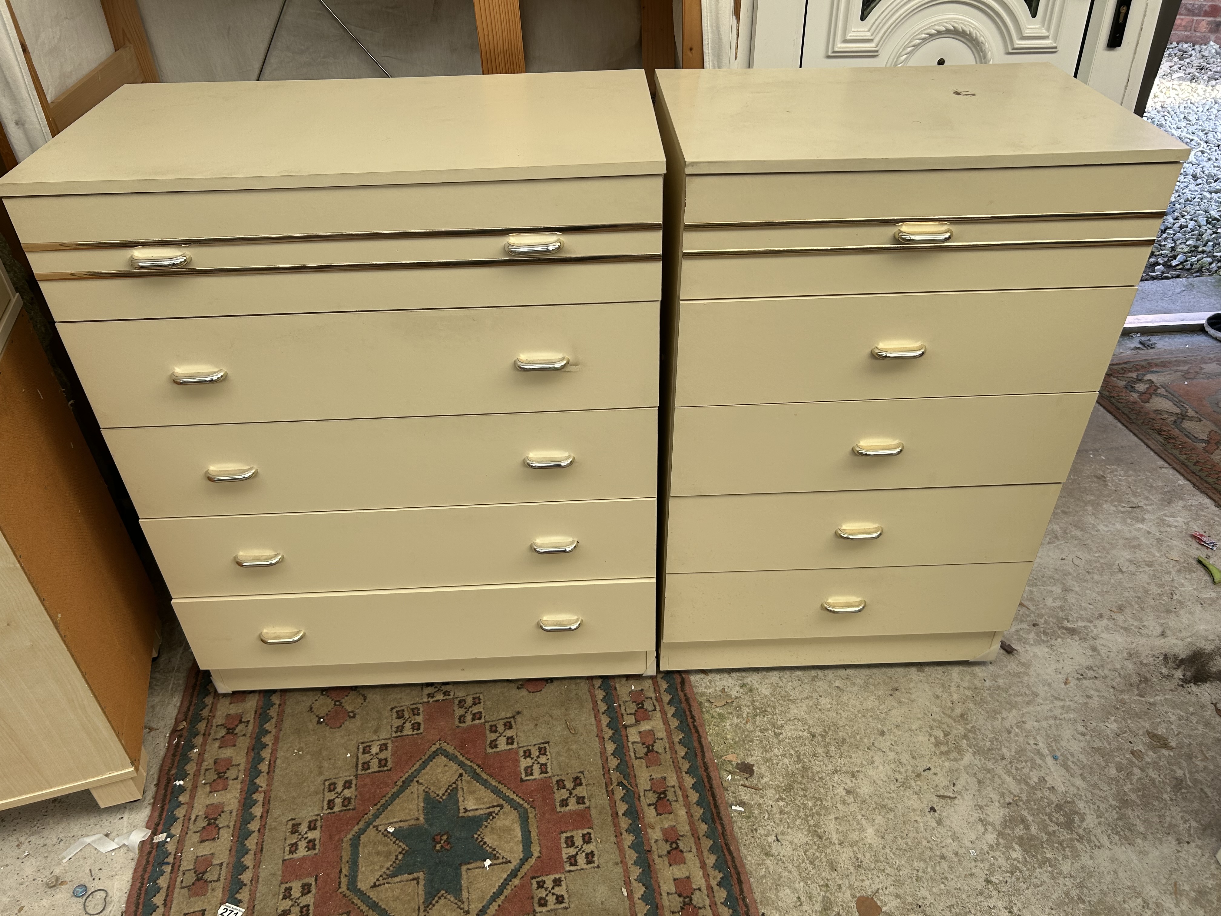 A pair of matching mid-century modern chests of drawers featuring a cream-coloured laminate finish, attributed to Norman Bel Geddes for Simmons. Each unit is configured with five drawers. The uppermost drawer of each chest is detailed with horizontal gold-toned metallic banding and a single central D-handle pull. The remaining four drawers are each fitted with two matching gold-toned D-handle pulls. The units are constructed with a simple recessed plinth base.