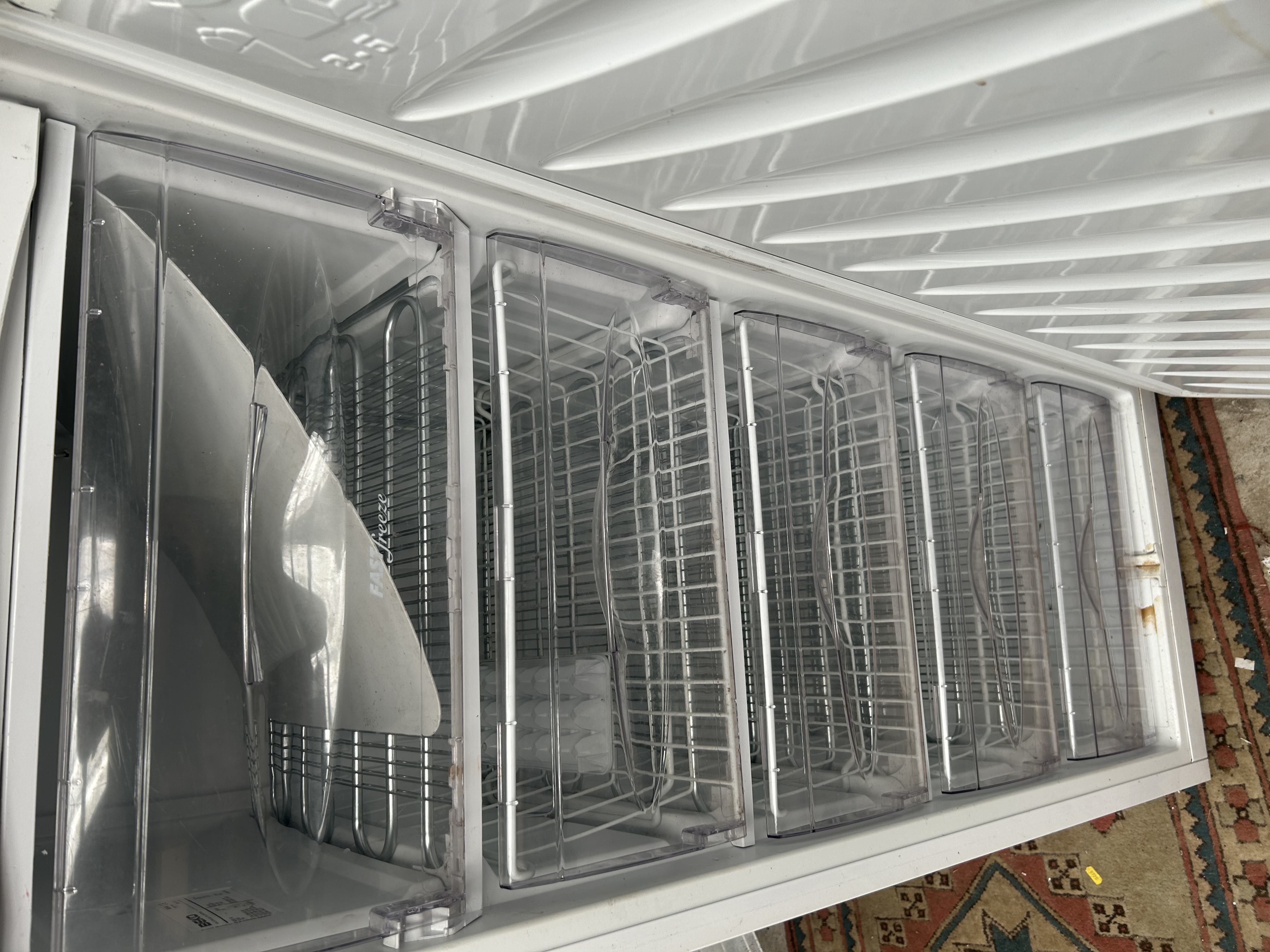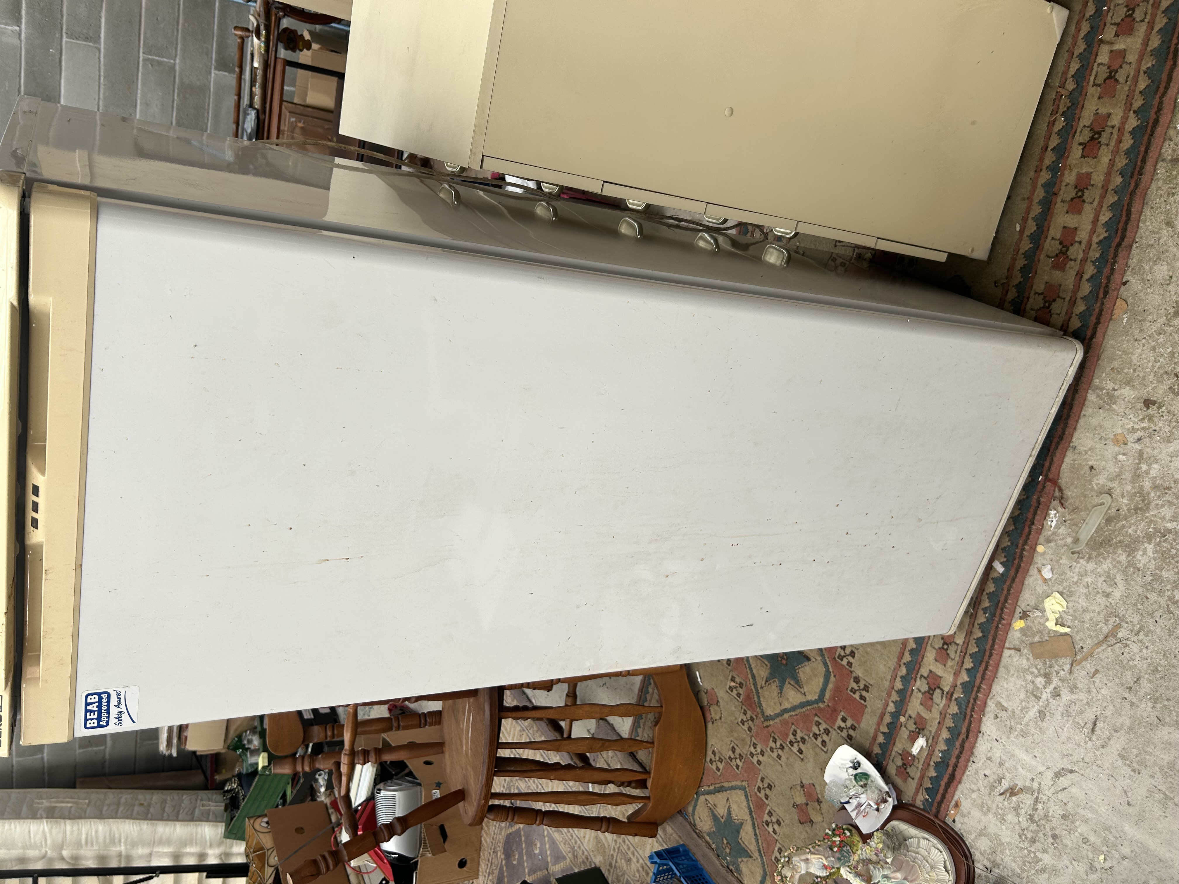 A Beko upright freezer featuring a white exterior finish and a single front-opening door. The appliance is marked with a BEAB Approved Safety Assured sticker on the lower exterior. The interior contains several wire basket storage drawers with clear plastic front panels, including a Fast Freeze compartment. A Beko manufacturer’s label is present on the lower interior wall.