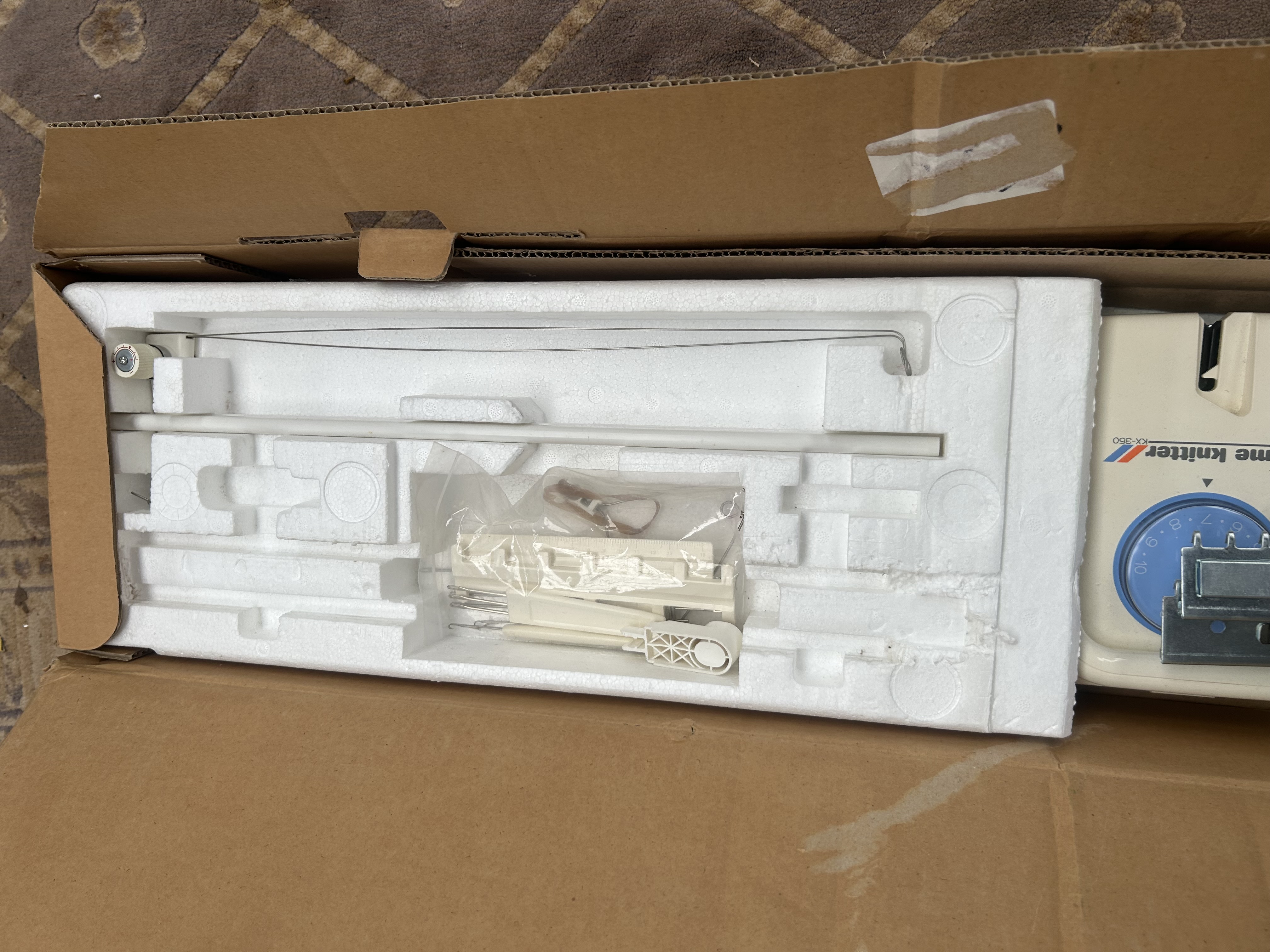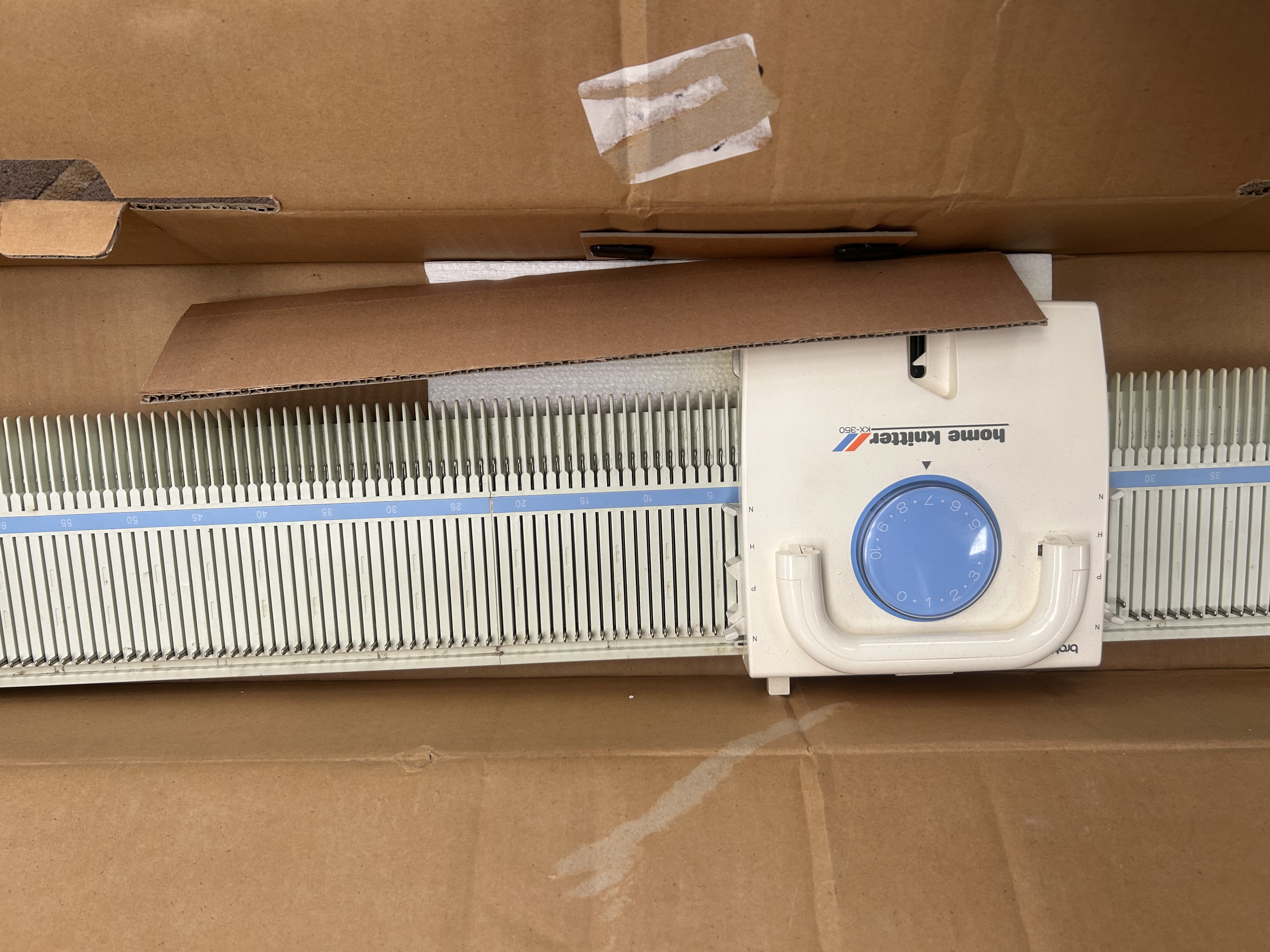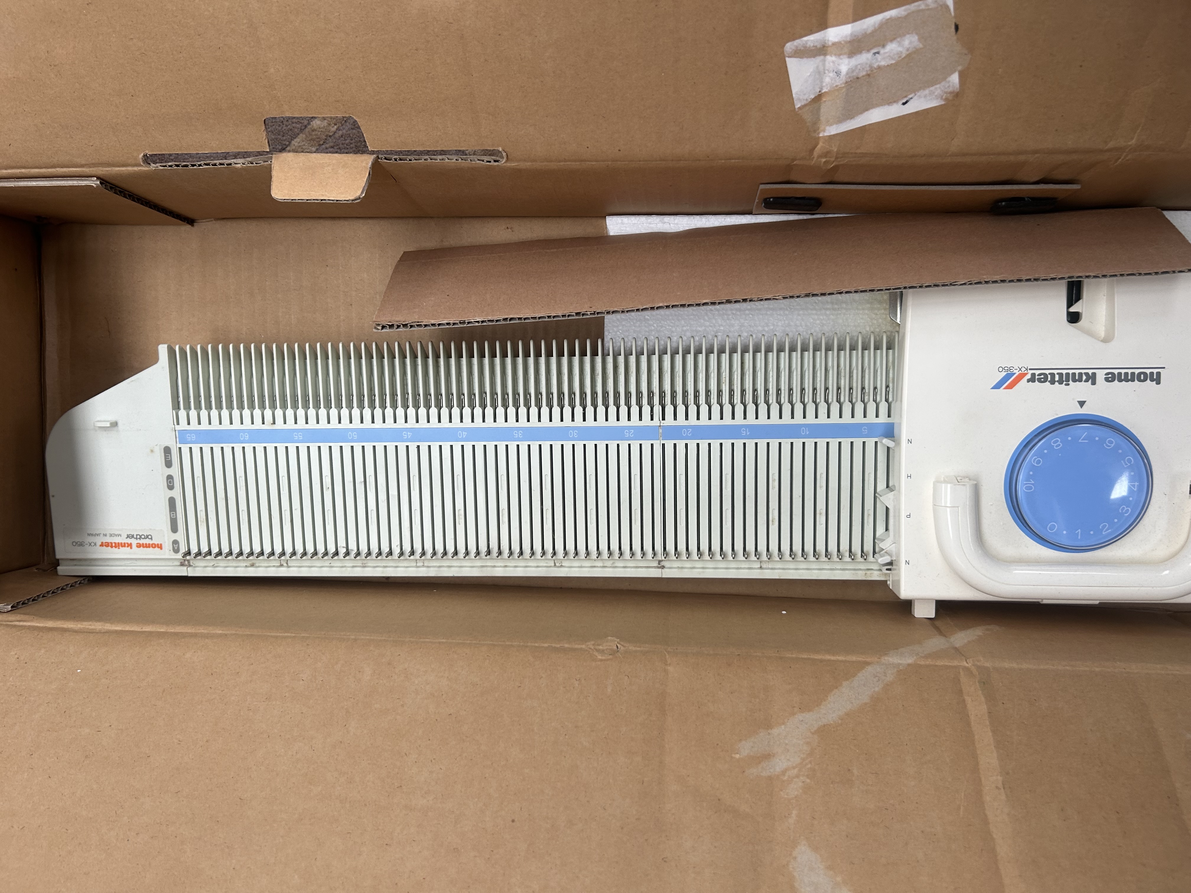 This lot comprises a Brother Home Knitter KX-350 knitting machine, manufactured in Japan. The unit is constructed with an off-white plastic body and features a metal needle bed. The carriage assembly includes a blue tension dial and is marked with the model name. The machine is accompanied by its original cardboard packaging and internal Styrofoam inserts. Included accessories consist of a tension rod, casting-on combs, and a collection of small hand tools, mostly organised within the original inserts. The exterior of the box is printed with the manufacturer name and model number.
