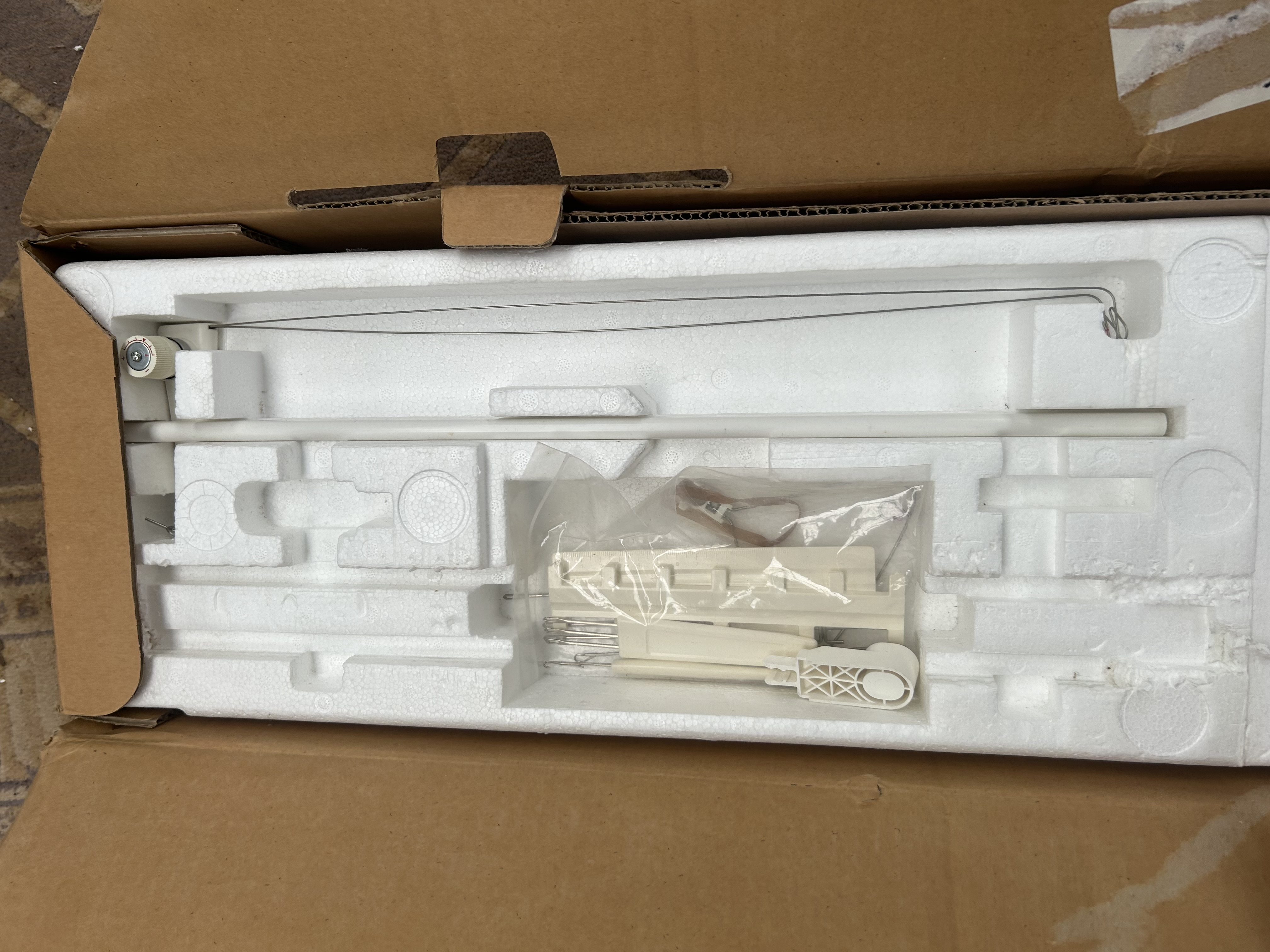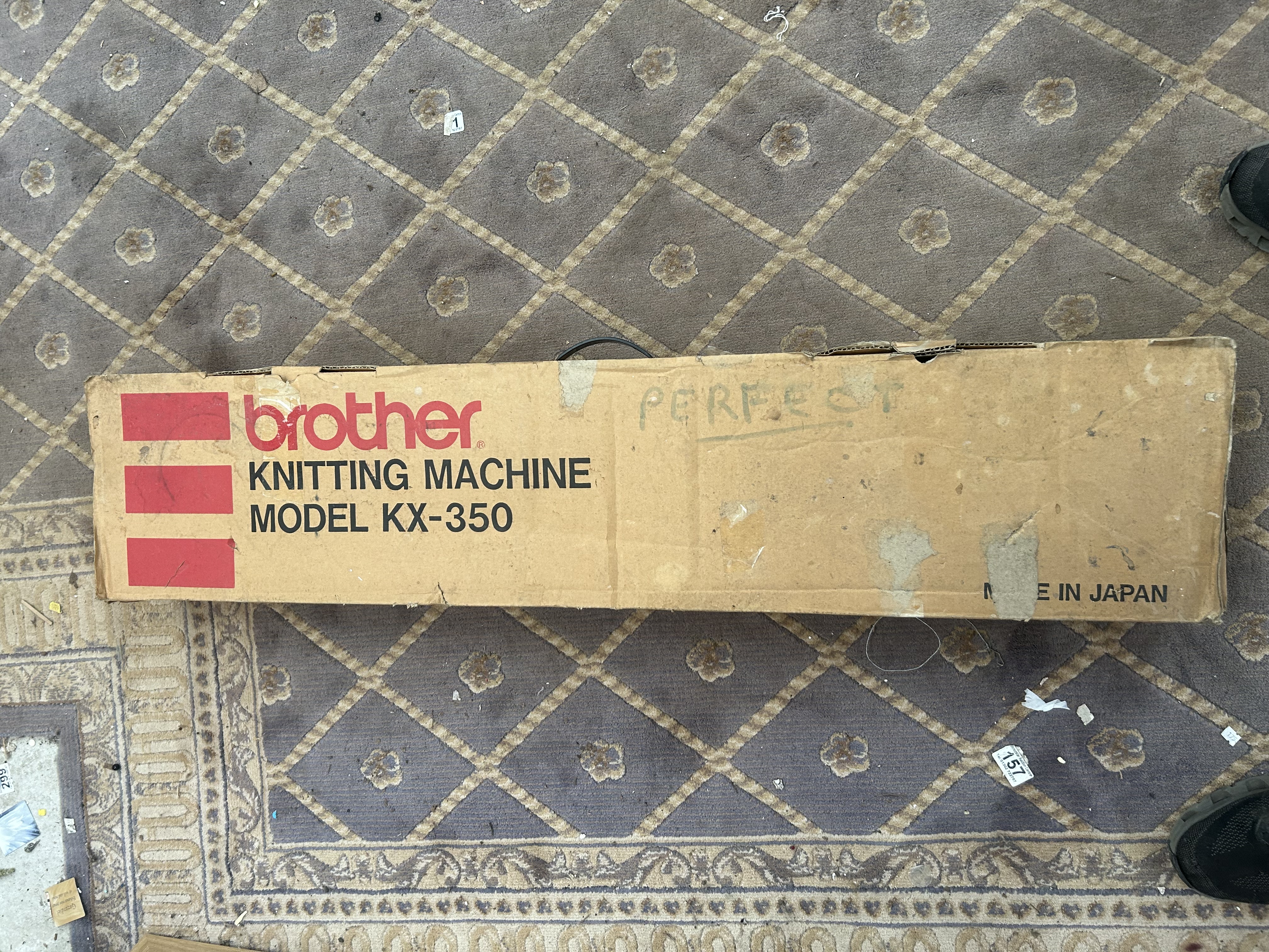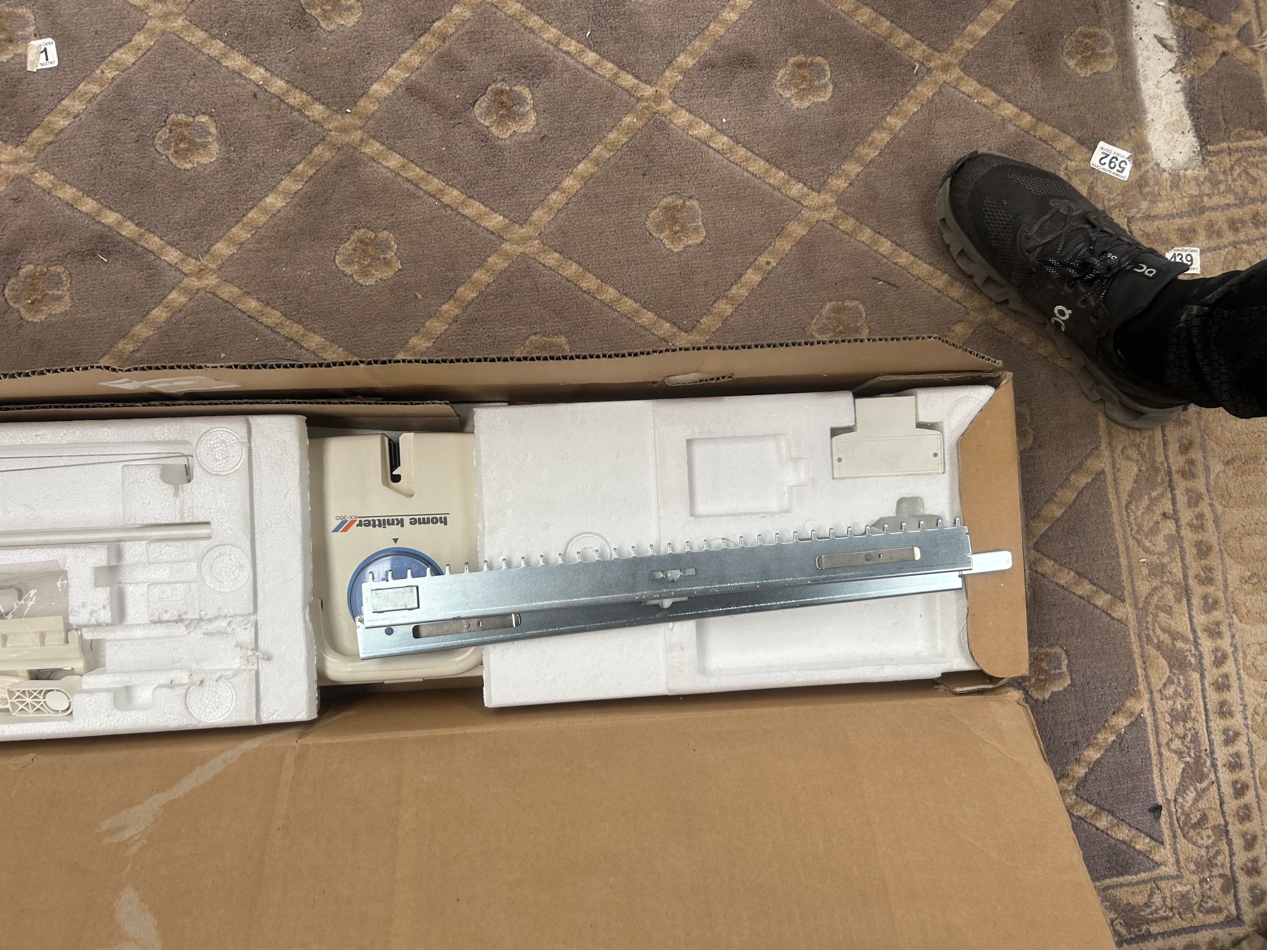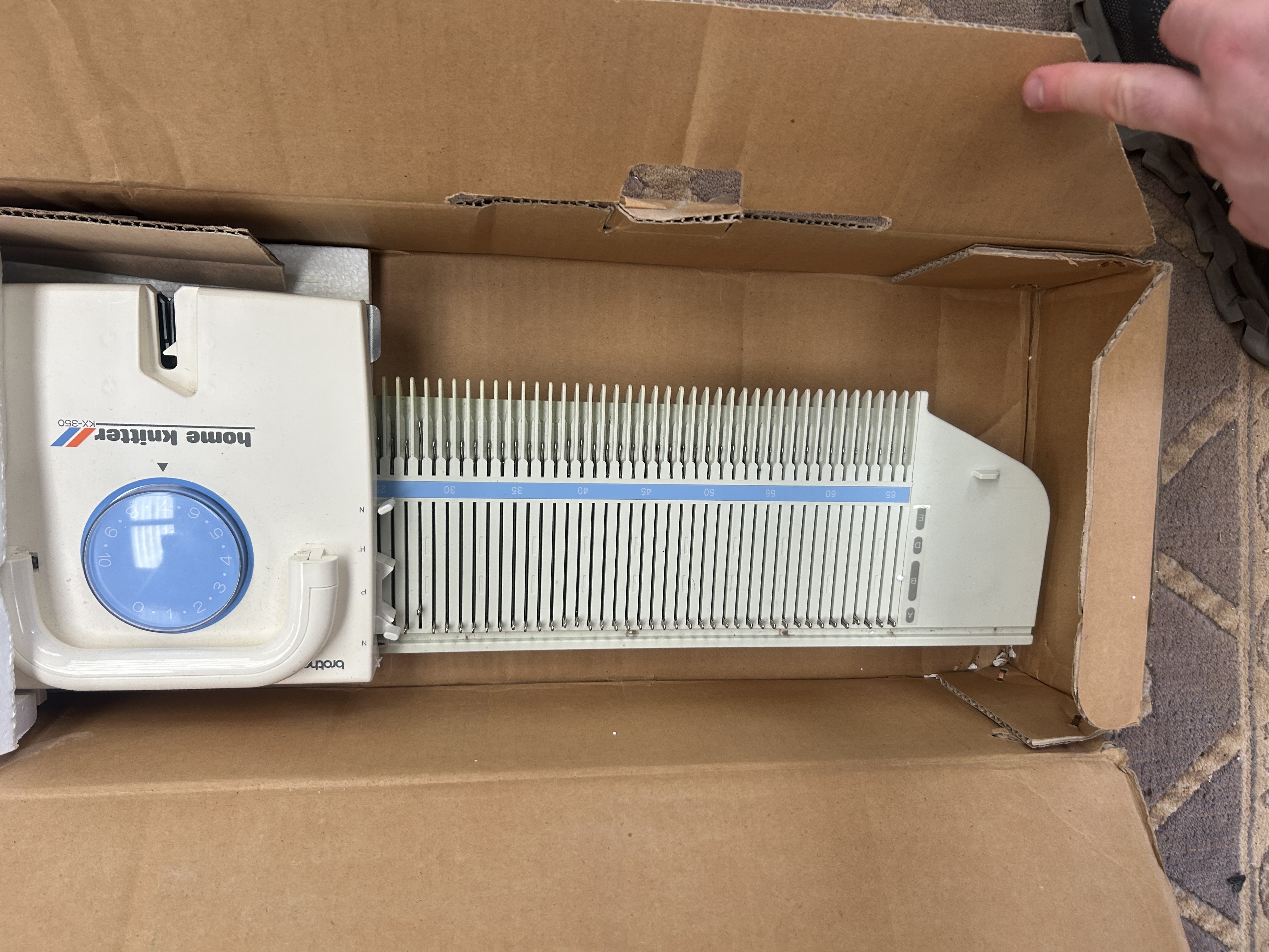 This lot comprises a Brother Home Knitter KX-350 knitting machine, manufactured in Japan. The unit is constructed with an off-white plastic body and features a metal needle bed. The carriage assembly includes a blue tension dial and is marked with the model name. The machine is accompanied by its original cardboard packaging and internal Styrofoam inserts. Included accessories consist of a tension rod, casting-on combs, and a collection of small hand tools, mostly organised within the original inserts. The exterior of the box is printed with the manufacturer name and model number.
