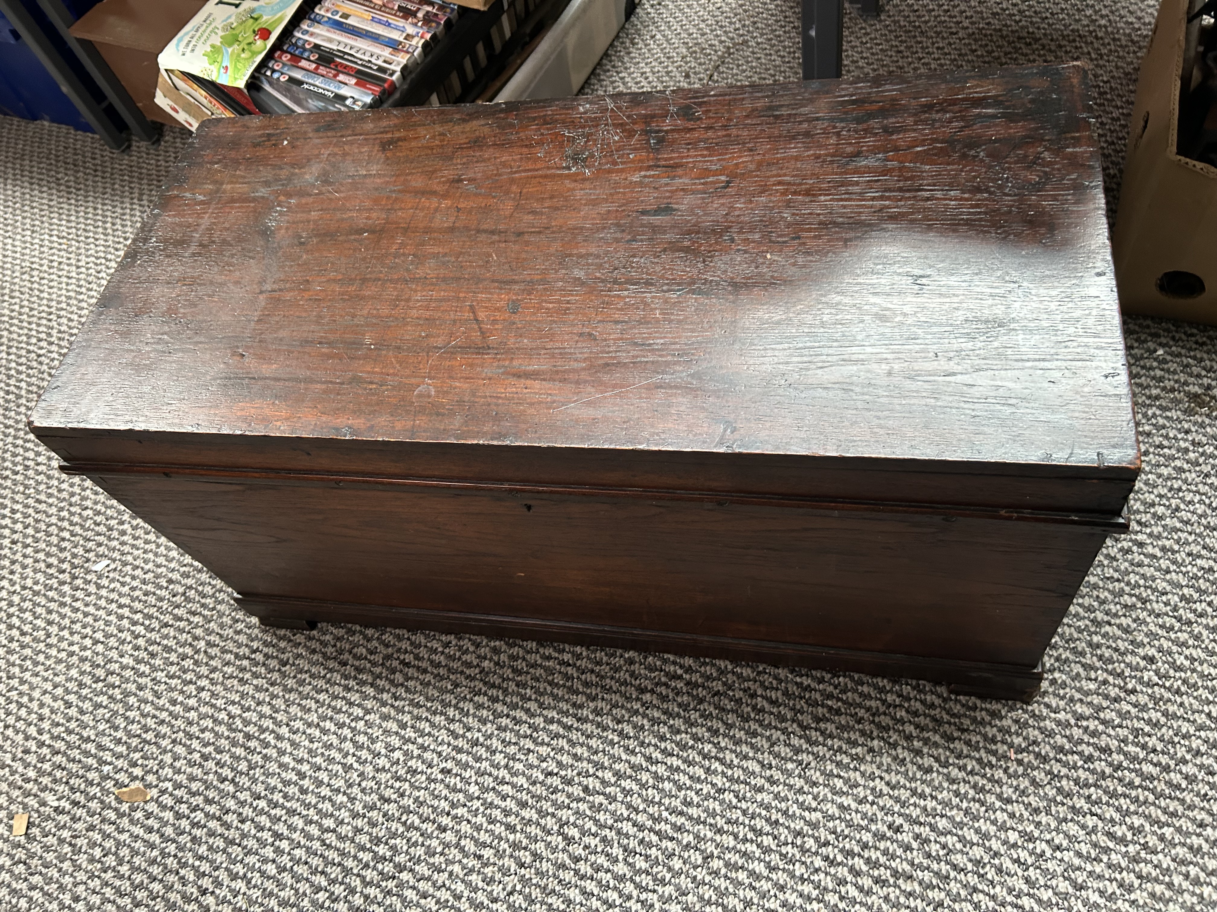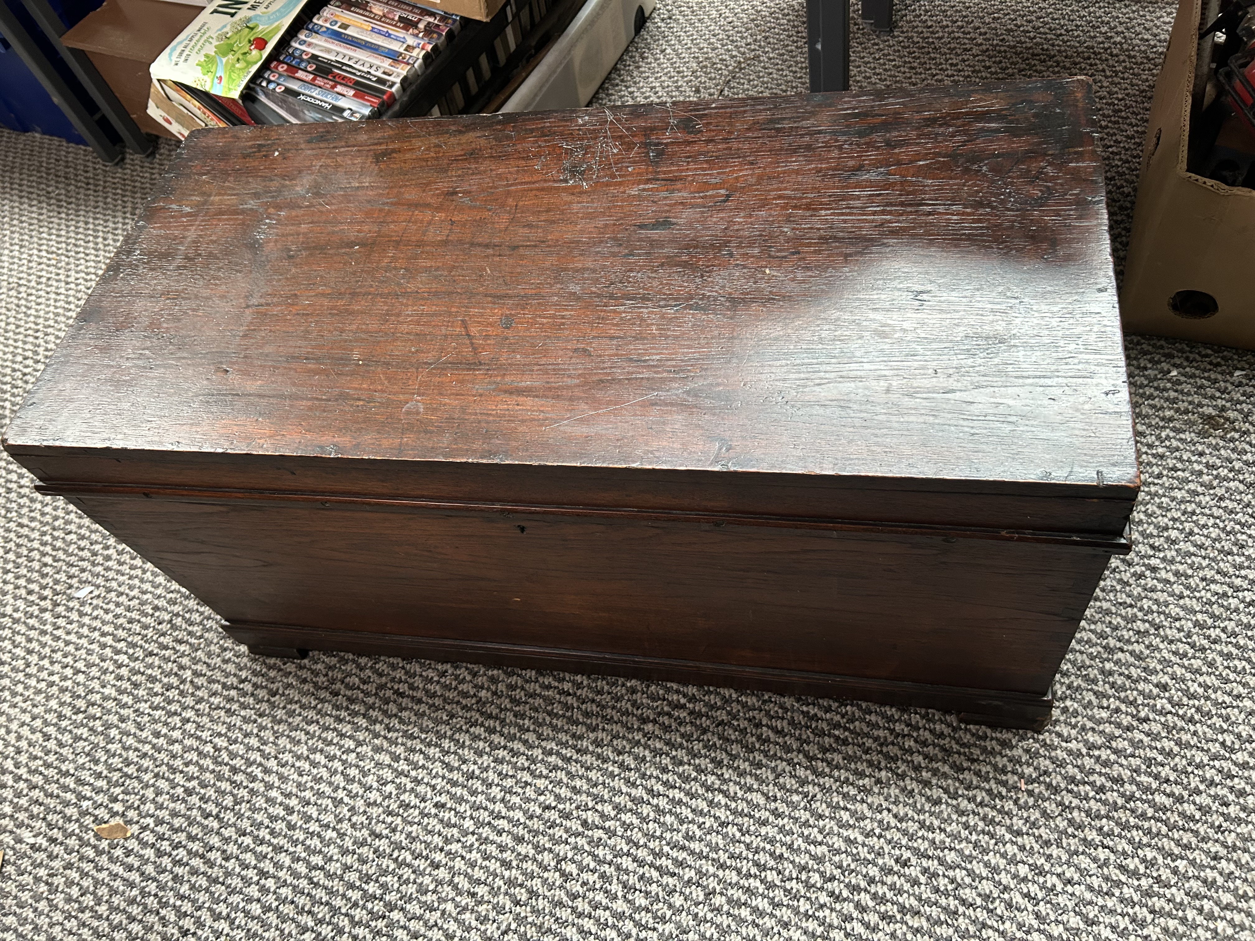 This antique wooden blanket chest is constructed from a dark-stained hardwood, possibly walnut or mahogany. The rectangular form features hand-cut dovetail joinery at the corners and is supported by a plinth base with short bracket feet. The chest includes a hinged lid and a small, central keyhole on the front face. The piece is of a size suitable for use as a coffee table or storage trunk.