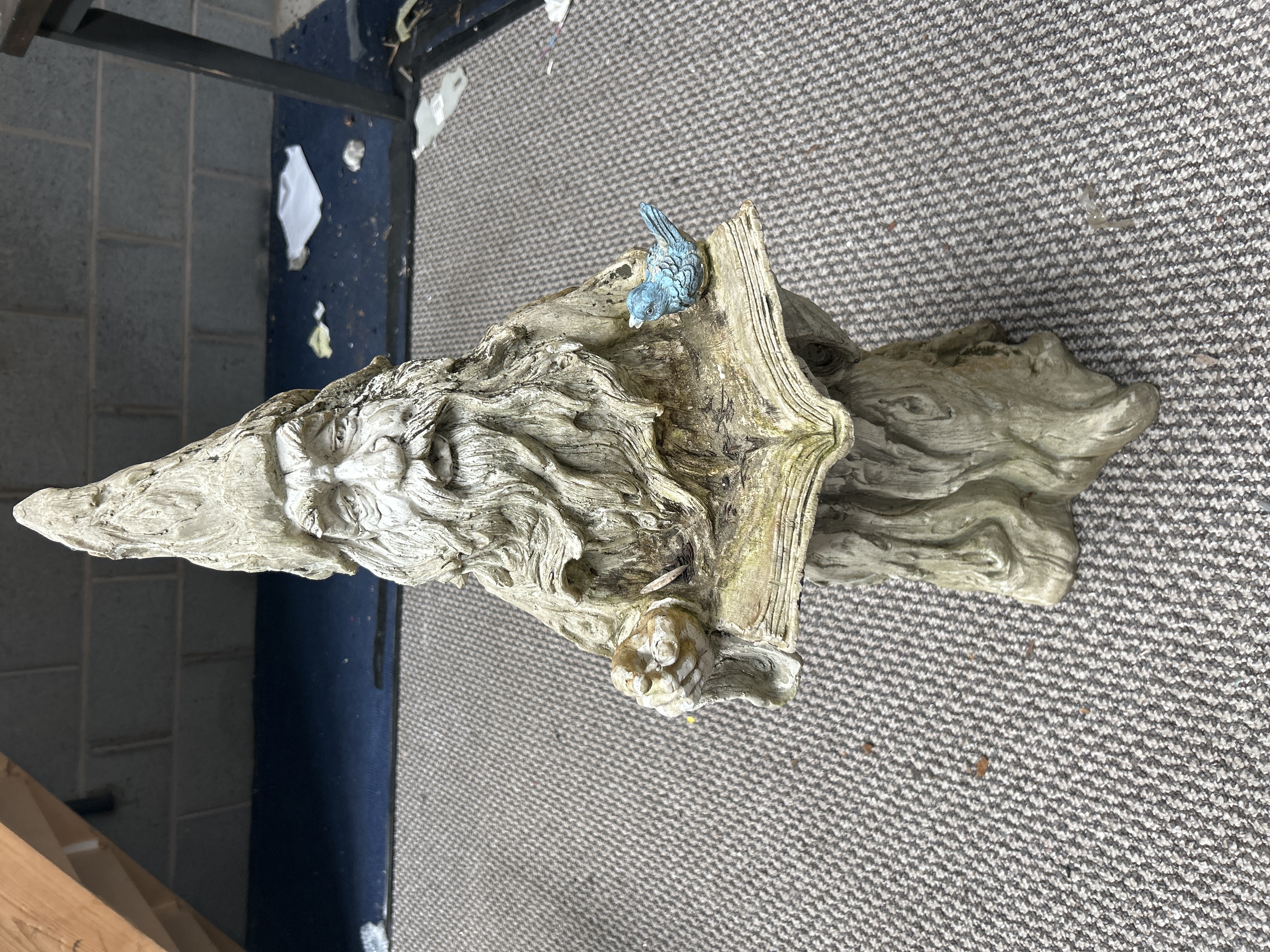 A fantasy-themed garden statue depicting a wizard or sage with a long, flowing beard and a pointed hat. The figure is depicted holding an open book, which serves as a perch for a small, blue-coloured bird. The statue is constructed from cast resin and features a deeply textured surface designed to mimic the appearance of gnarled, weathered wood with a muted, earthy-toned finish.