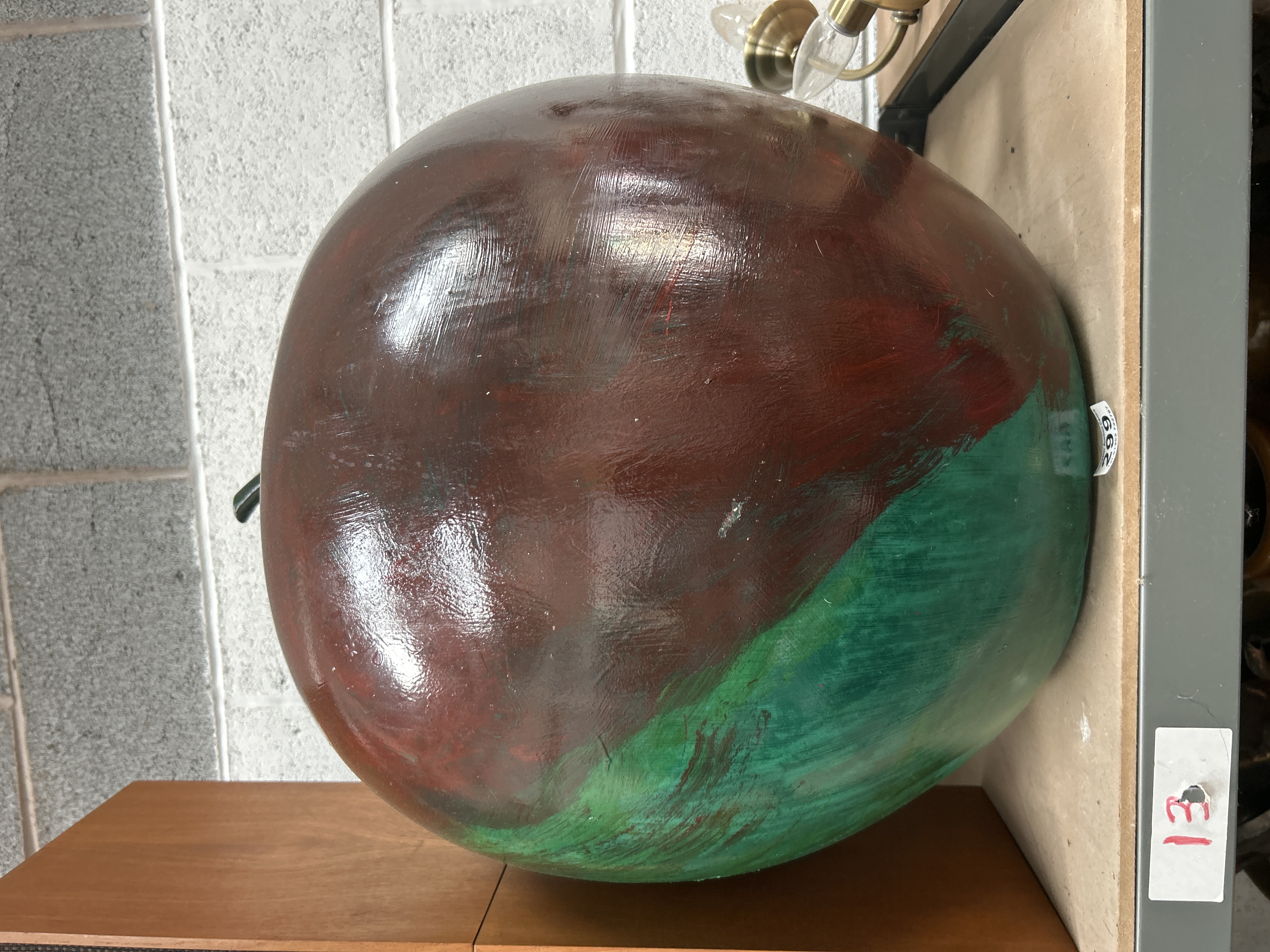 A large-scale decorative sculpture or prop fashioned in the stylised form of an apple. The piece features a globular body with a short stem-like projection. The exterior is finished with a high-gloss paint in variegated tones of deep reddish-brown and green, resembling oxidised copper. The surface shows visible broad brushstrokes. The object is likely constructed from a composite material such as fibreglass or resin. Two identification labels are present on the side: a printed sticker numbered 299 and a white tag with a handwritten 13 in red.