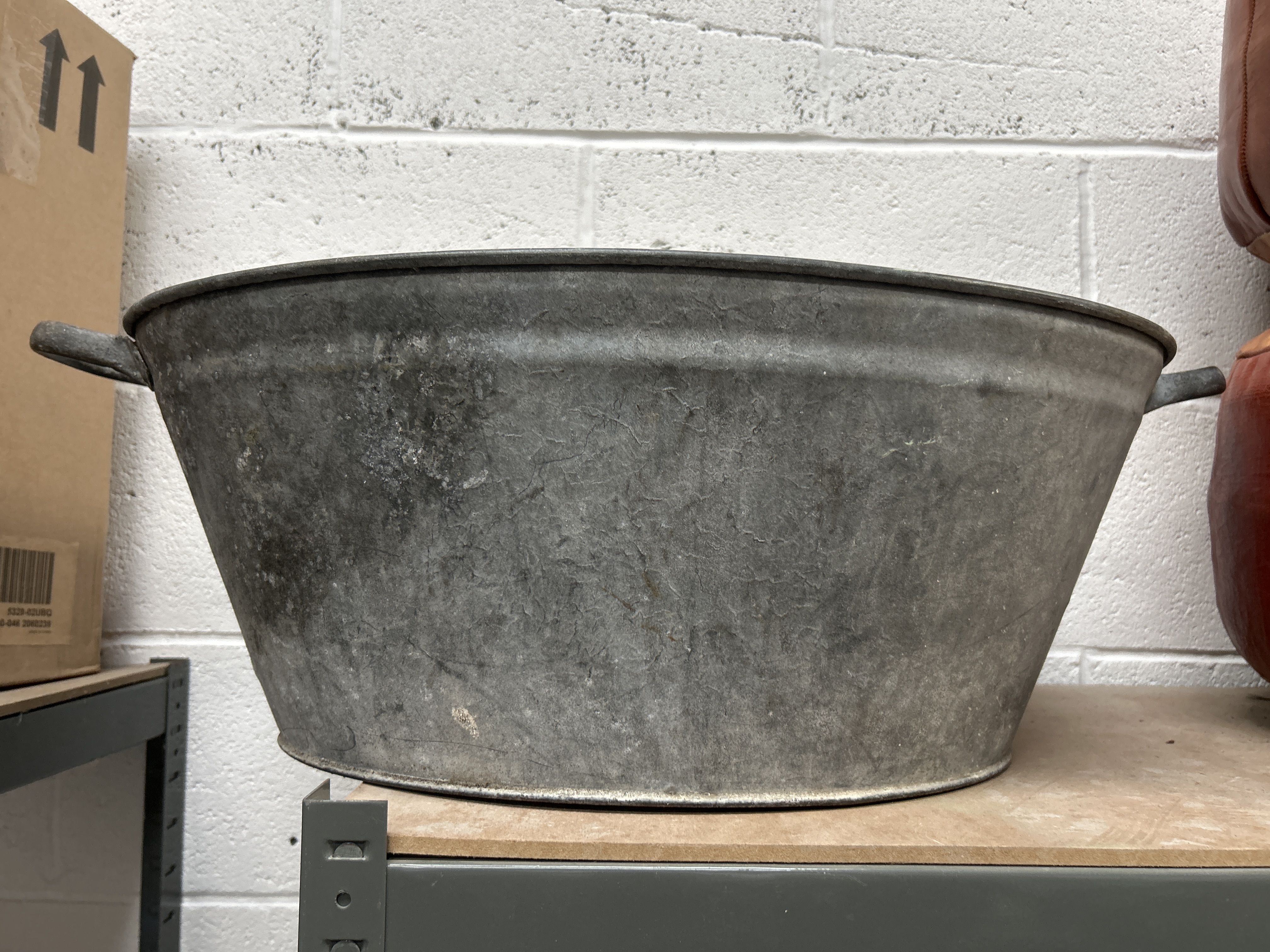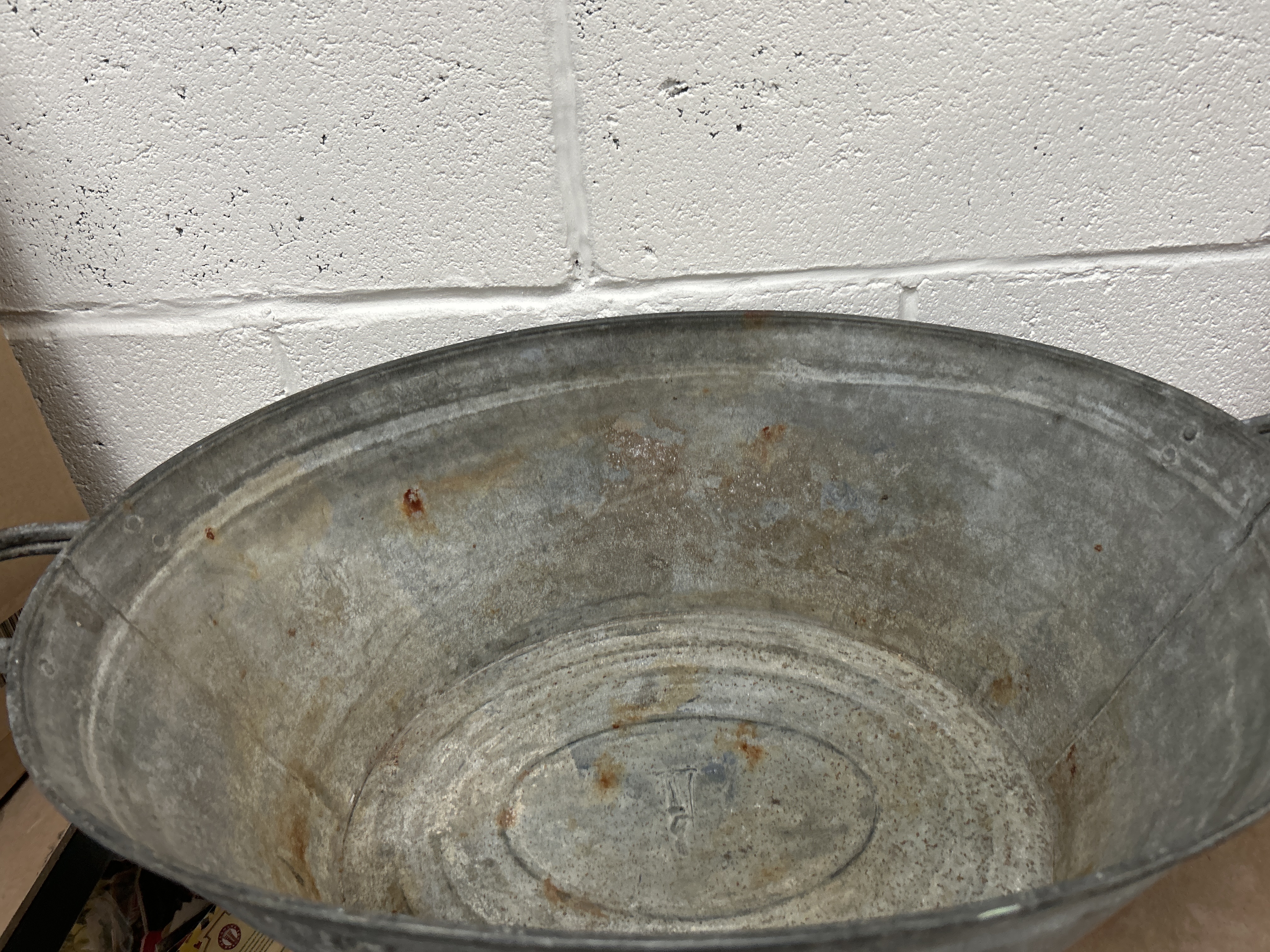 A vintage galvanised steel wash tub of oval form, featuring a tapered body and a reinforced rolled rim. The vessel is fitted with two integral loop handles at the narrow ends. The interior base displays an indistinct embossed mark. The construction shows a seamed body and base typical of utilitarian metalware.