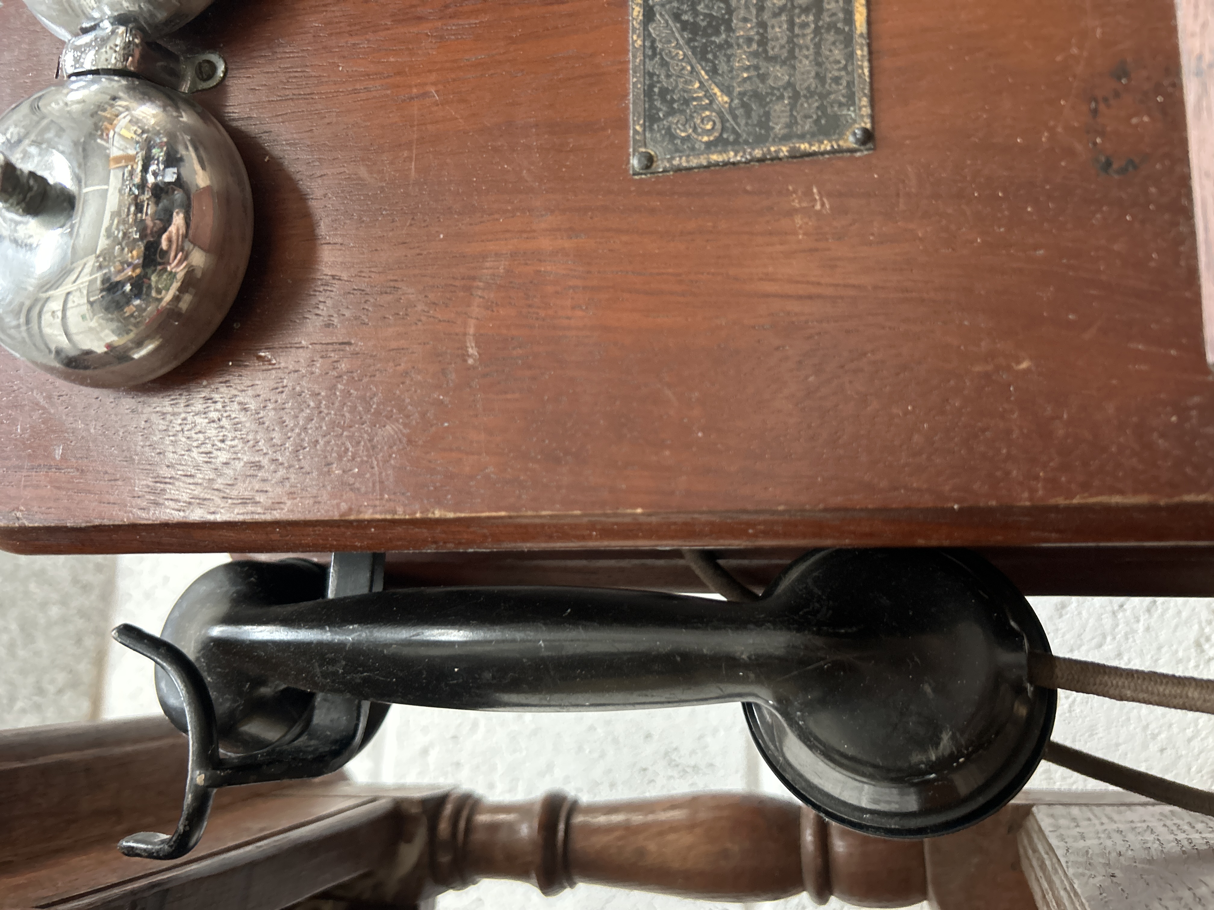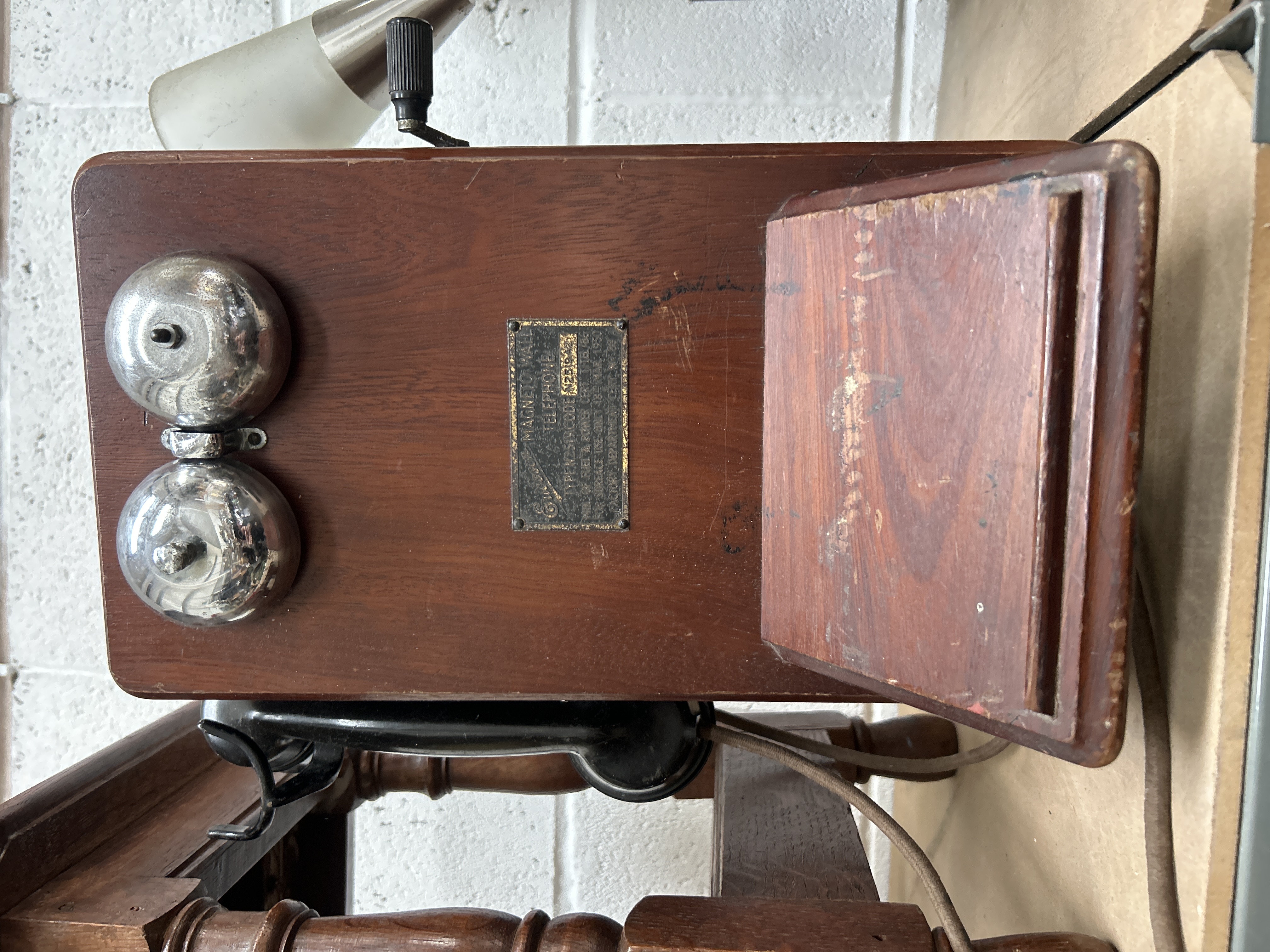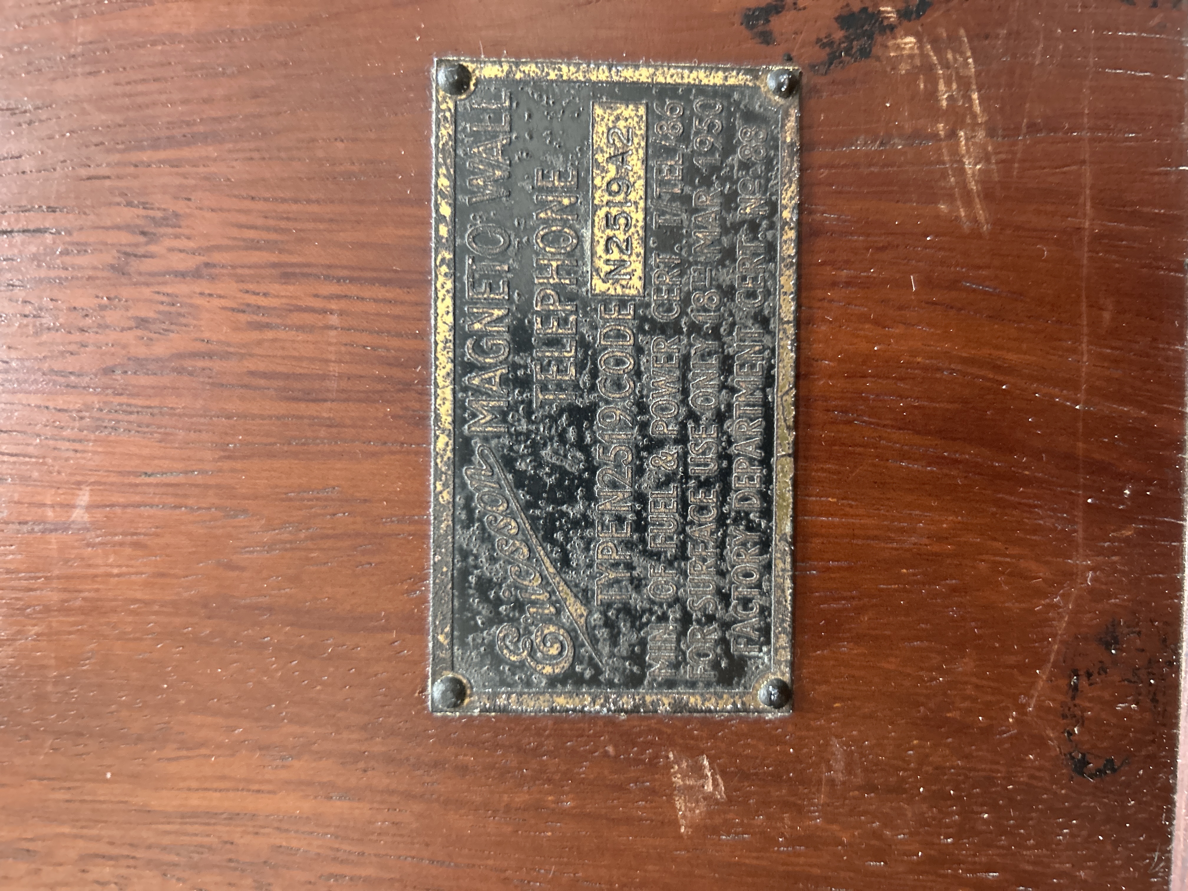 An Ericsson magneto wall-mounted telephone featuring a dark wood cabinet with an integrated writing slope and a side-mounted hand crank. The front of the unit is fitted with two polished metal bells and a black-finished identification plaque with embossed text. The plaque identifies the instrument as an Ericsson Magneto Wall Telephone, Type N2519, Code N2519A2. It features certifications from the Ministry of Fuel and Power (Cert. T/TEL/86) and the Factory Department (Cert. No. 88), specified for surface use only and dated 18 March 1950. A black handset is suspended from a metal switch hook on the side and remains attached by a cloth-covered cord.