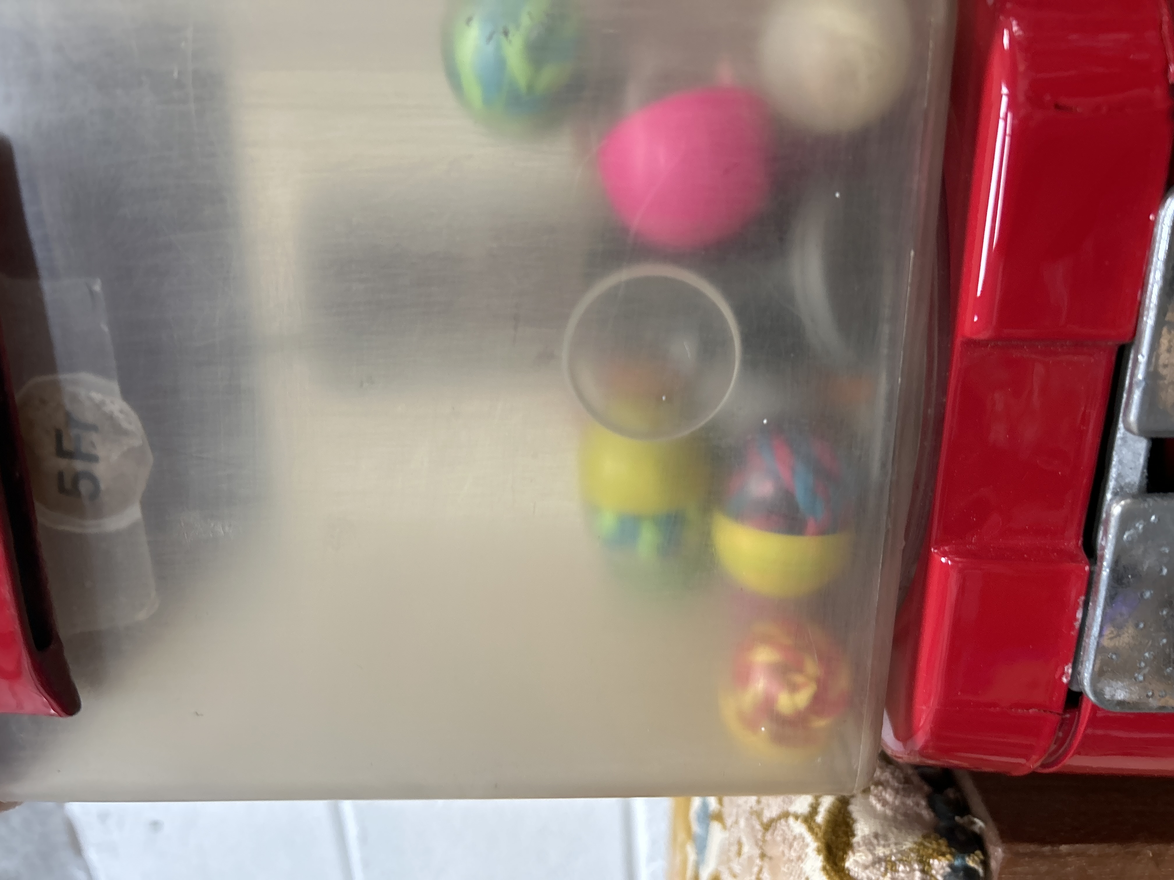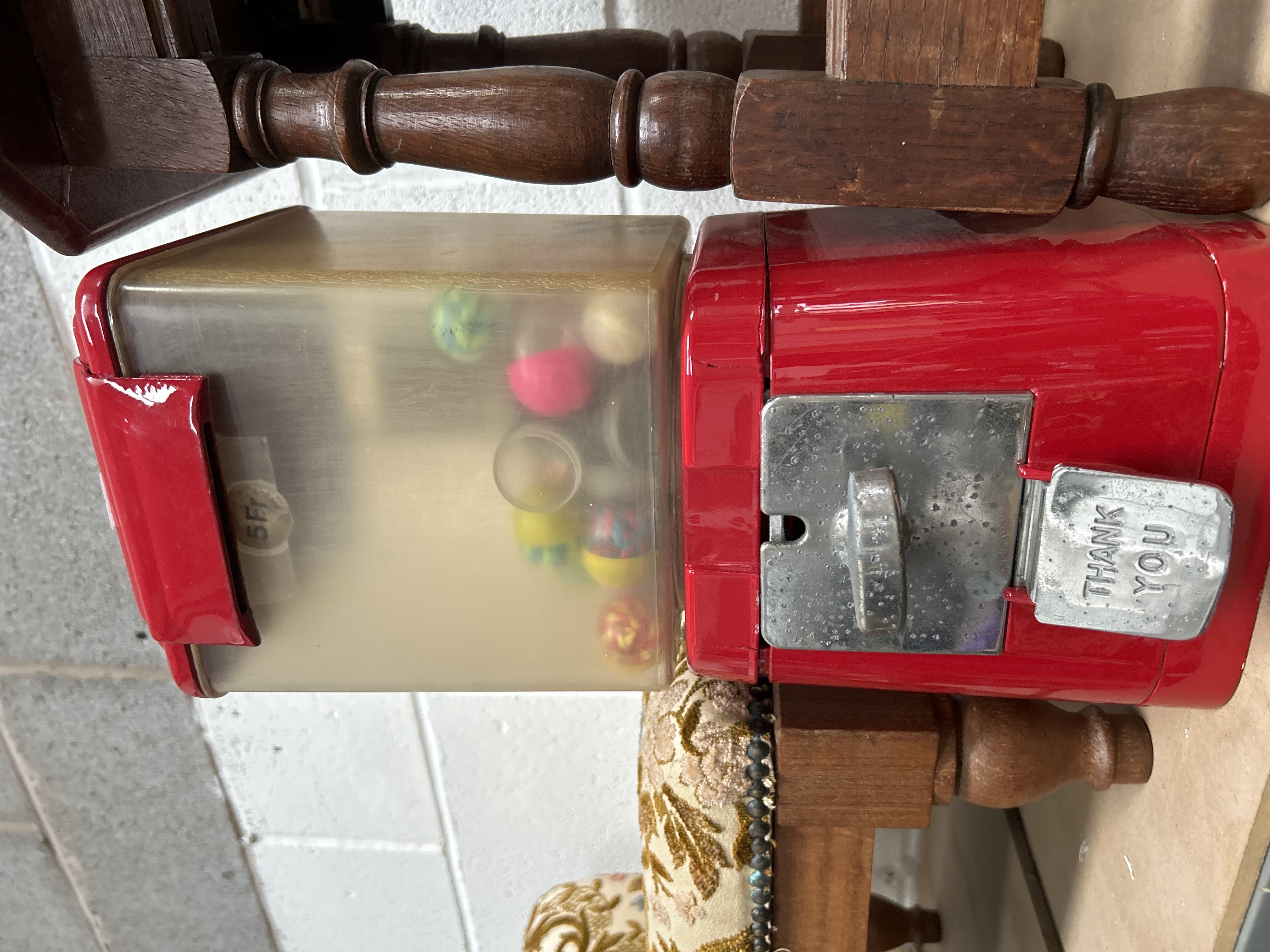 A vintage coin-operated vending machine in the style of the Acorn models produced by the Oak Manufacturing Company. The unit features a red-painted metal housing and a square-form clear plastic product compartment. It is equipped with a chrome-finished coin-operated turning mechanism and a dispenser flap embossed with the text THANK YOU. A sticker on the side of the plastic container displays 5 Fr, indicating a price in Francs. The storage unit contains several colourful toy capsules and balls.