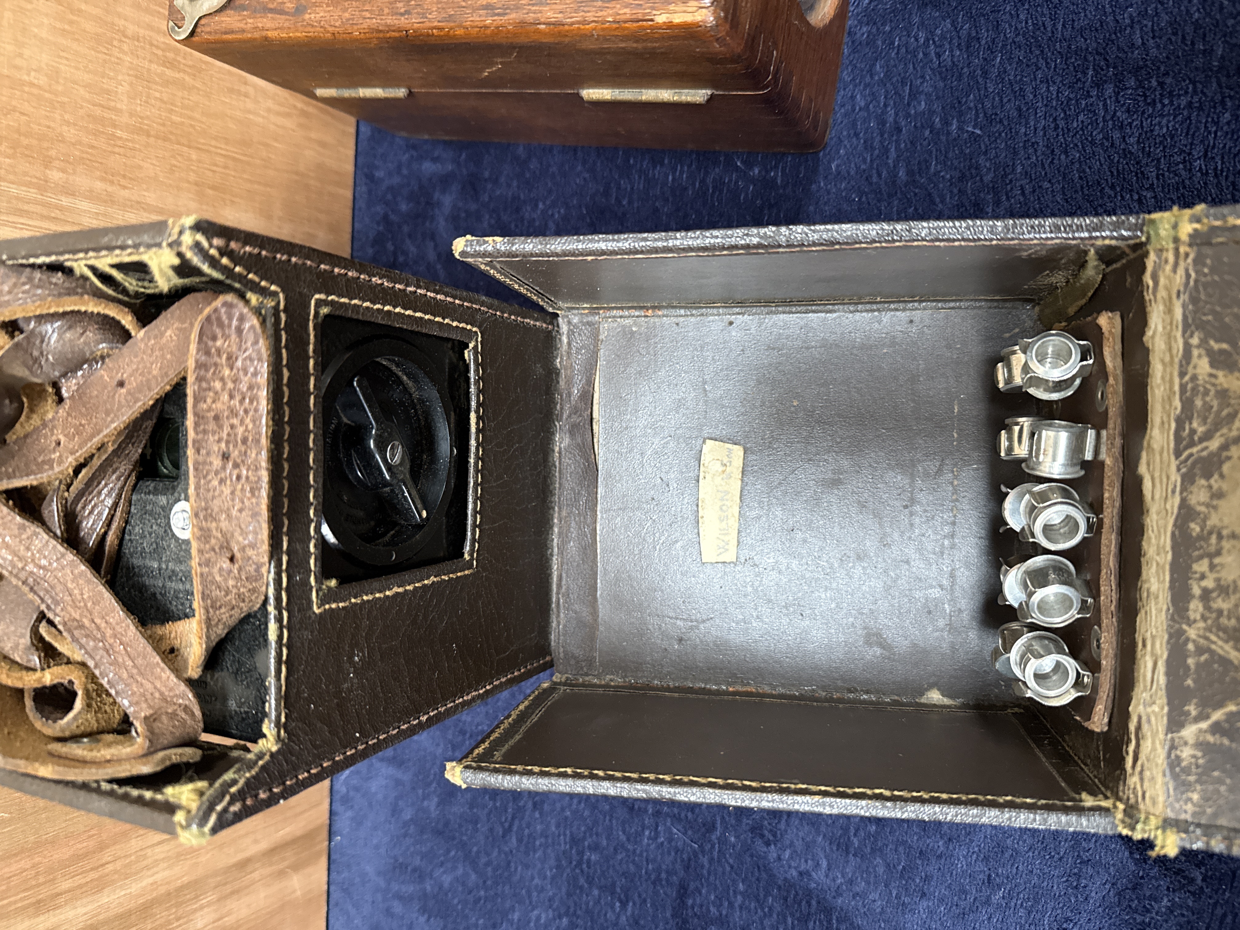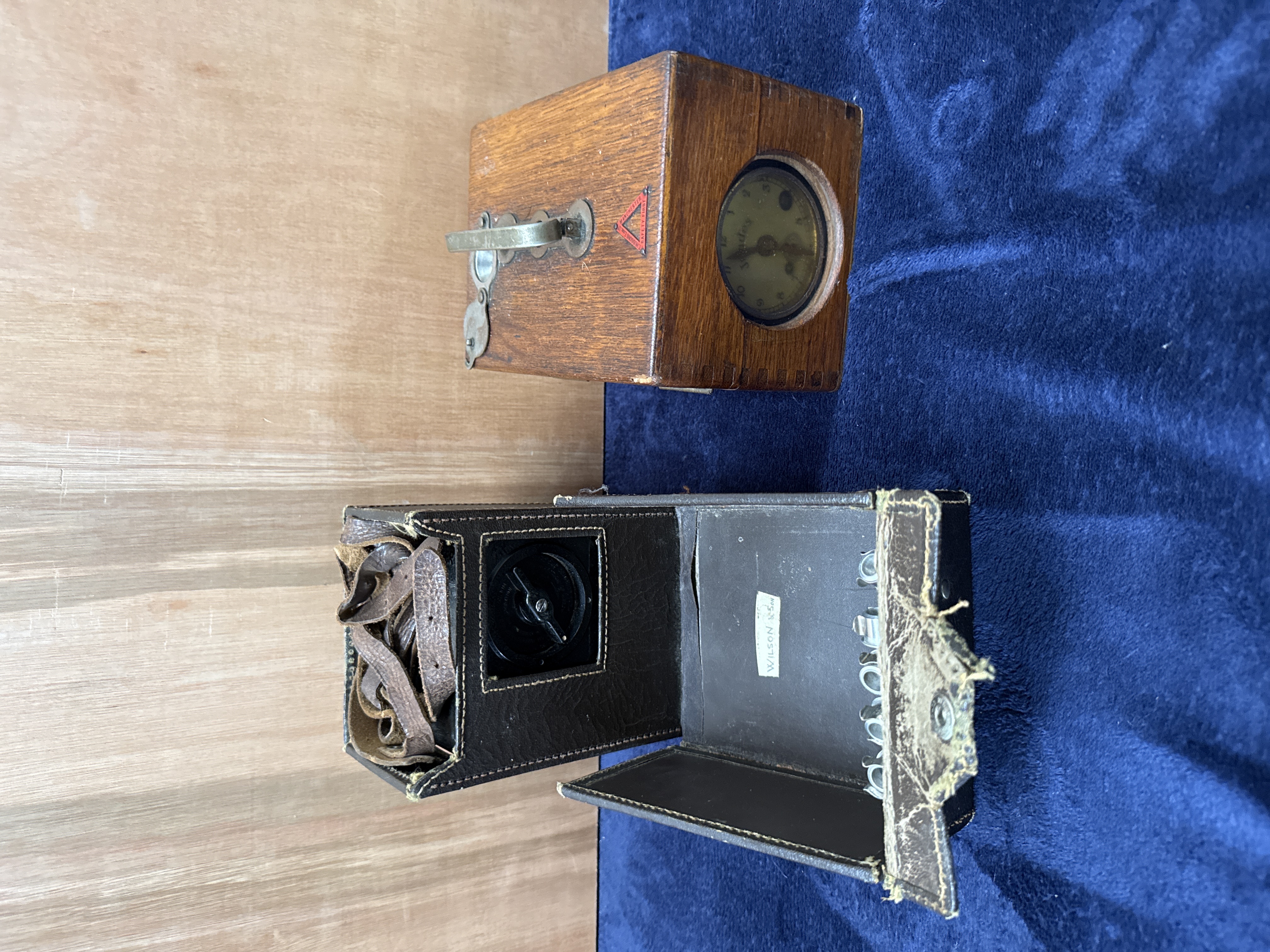 A collection of two early 20th-century recording devices designed for security and watchman patrols. The first device is housed in a rectangular oak case of dovetail construction, featuring a heavy metal carrying handle and a red triangular safety label inscribed SAFETY FIRST / MANCHESTER / T. HUDSONS EXOR LTD. A clock face is visible through a glass aperture on the side of the case, marked with the name Judes. The second device is contained within a dark brown leather carrying case with an integrated shoulder strap. The interior reveals a black mechanical component and five metal station keys held in individual clips. A small paper label adhered to the inside of the lid is handwritten with the name WILSON.