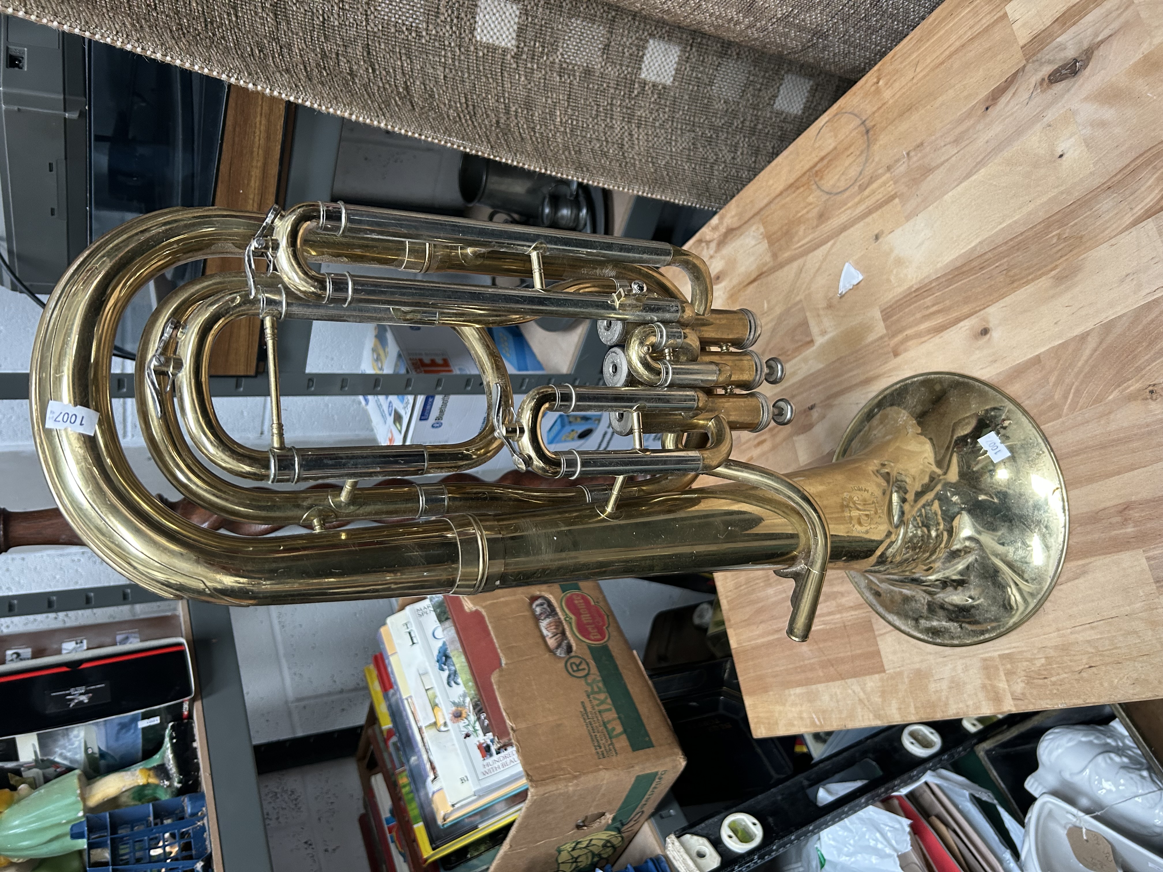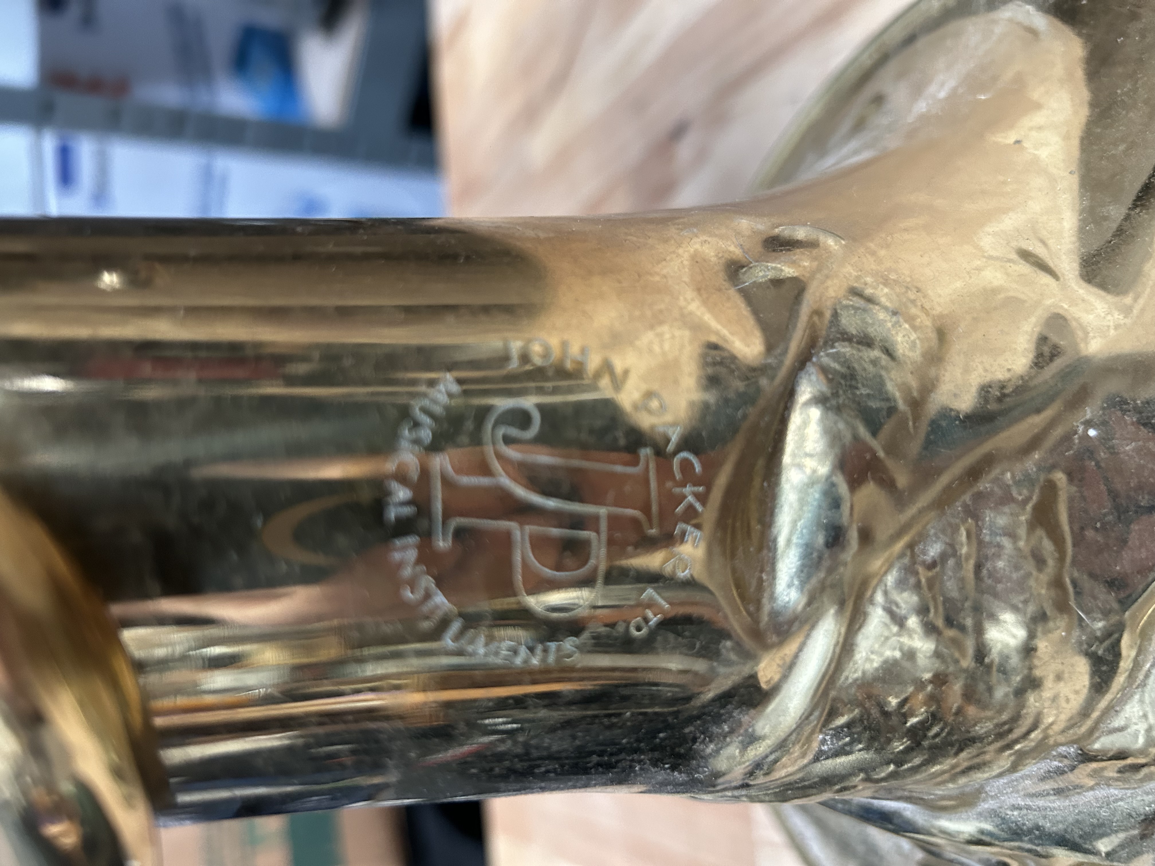 A brass wind instrument by John Packer Ltd constructed from yellow brass with nickel-silver tuning slides and valve sections. The instrument features four top-action piston valves and is engraved on the bell with the manufacturer mark, JOHN PACKER LTD. MUSICAL INSTRUMENTS, alongside the JP logo. The instrument is designed as a compact euphonium or tenor tuba. Several numerical inventory tags are adhered to the exterior tubing.