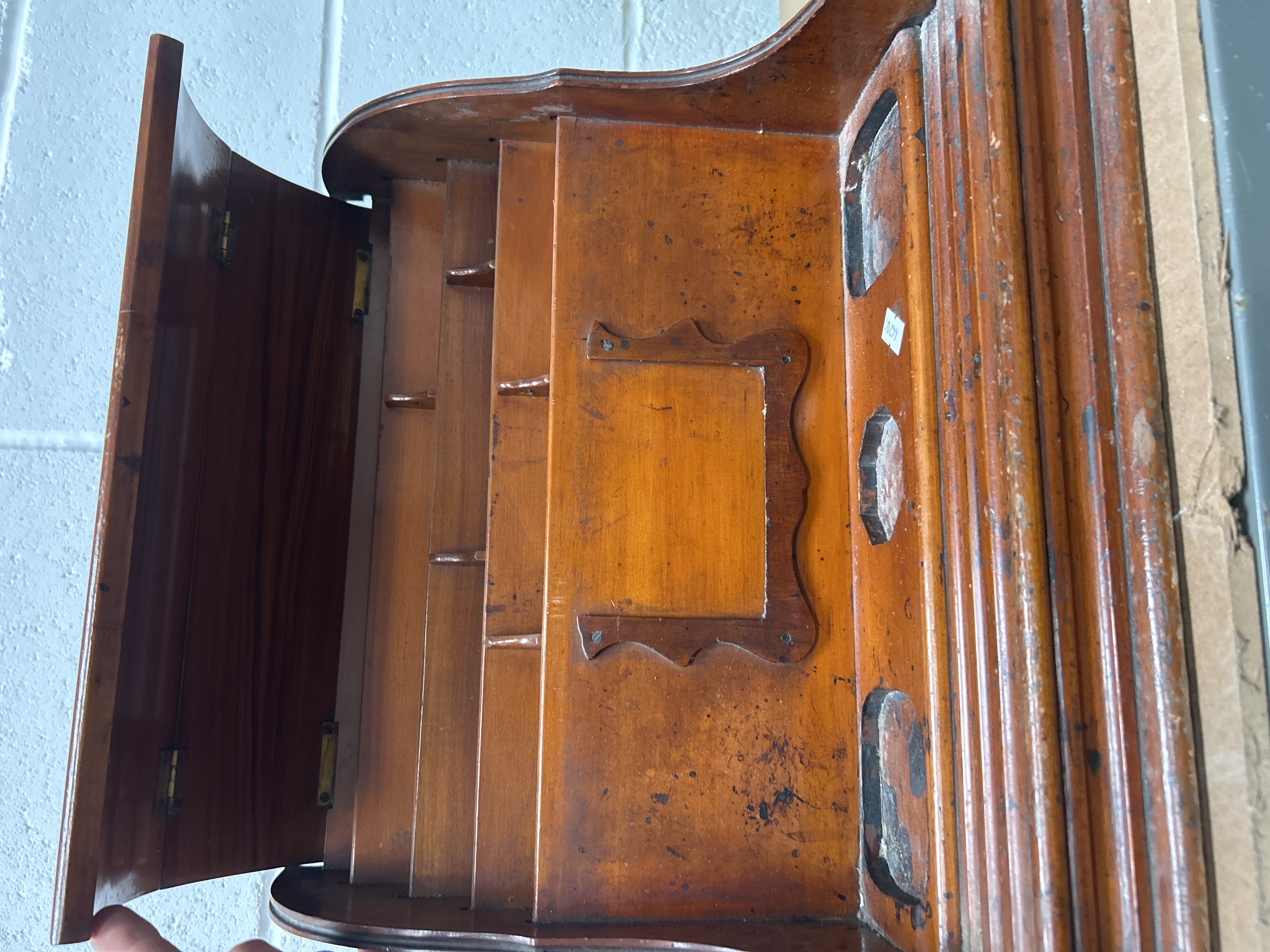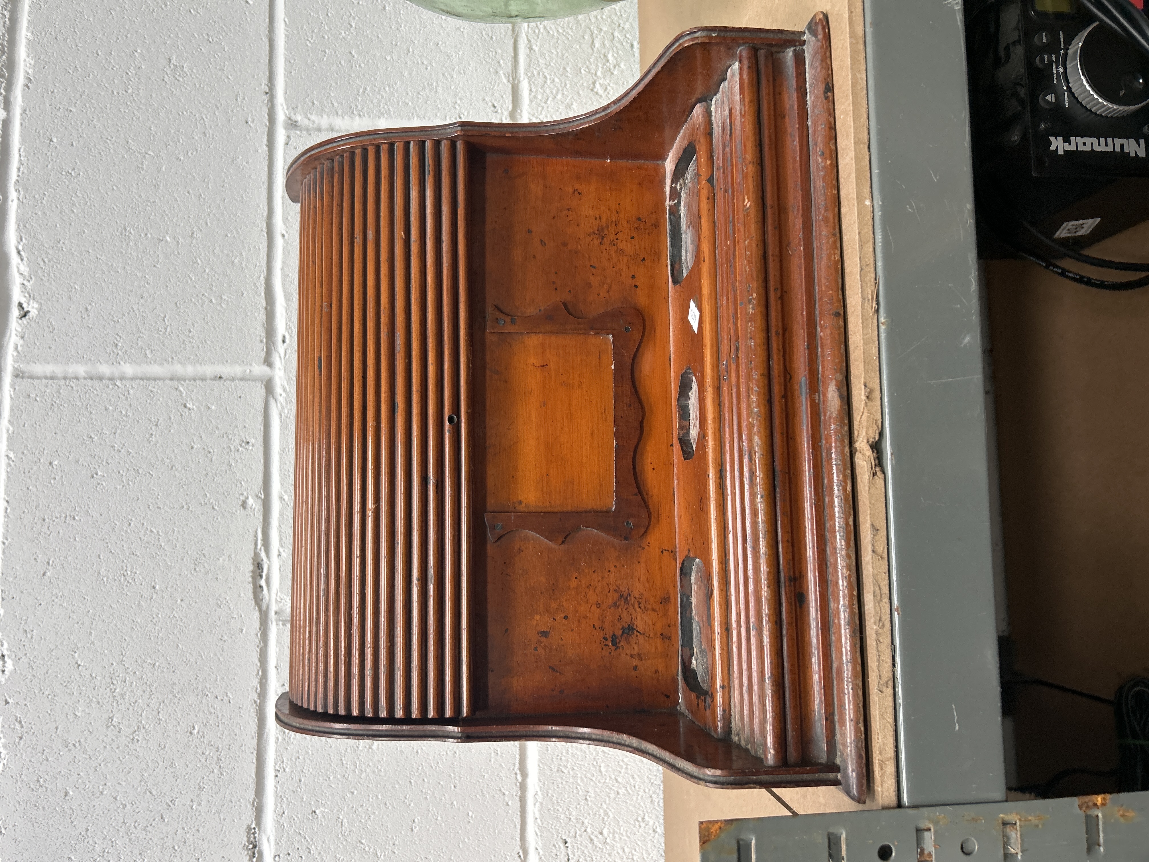 A late 19th-century tabletop stationery bureau constructed from oak. The piece features a tambour roll-top front which retracts to reveal a tiered interior containing multiple compartments and slots for document storage. The upper section is fitted with three recessed circular wells for inkwells and a central decorative scalloped wooden frame. The construction incorporates brass hinges to the internal fittings.