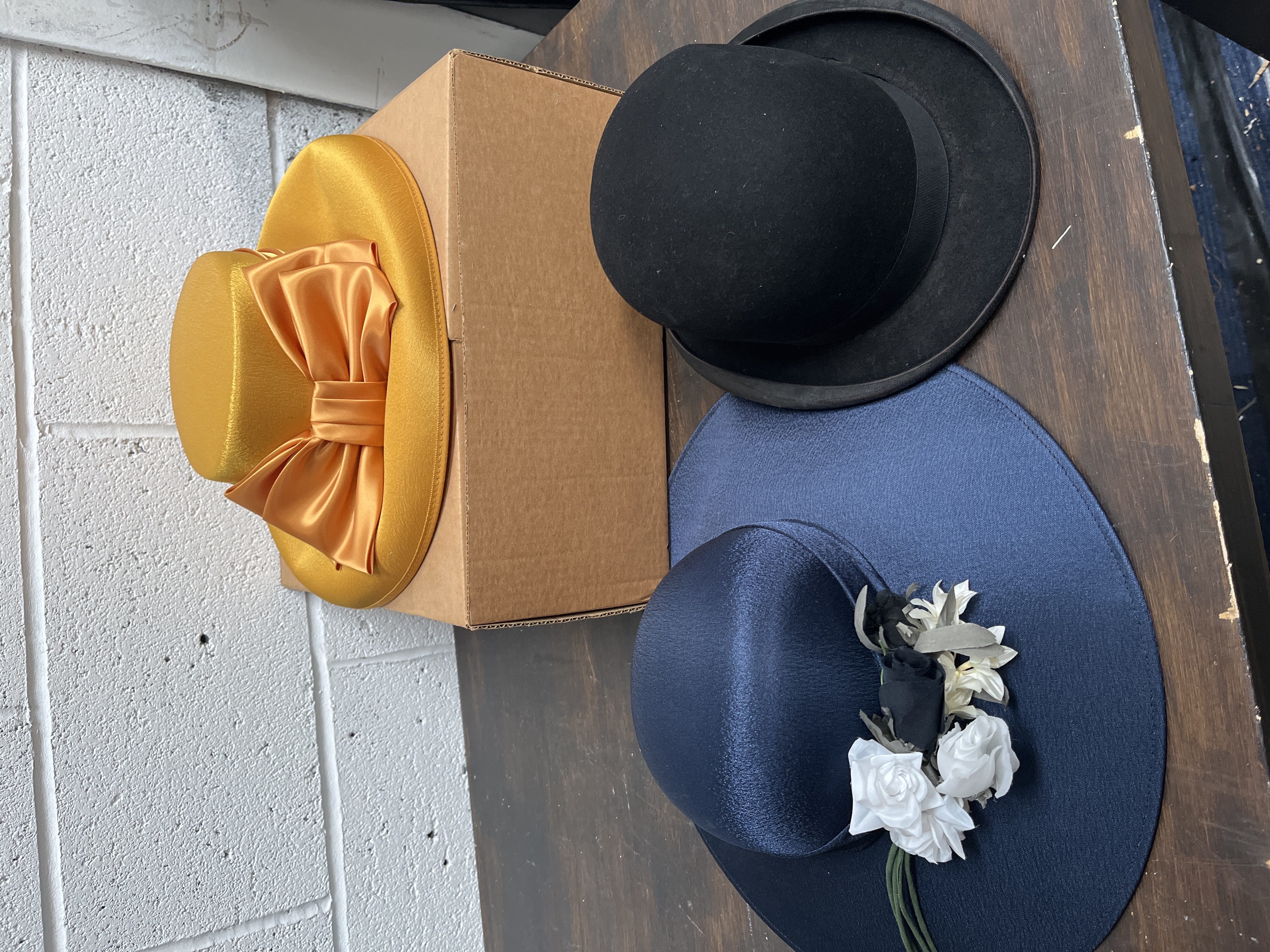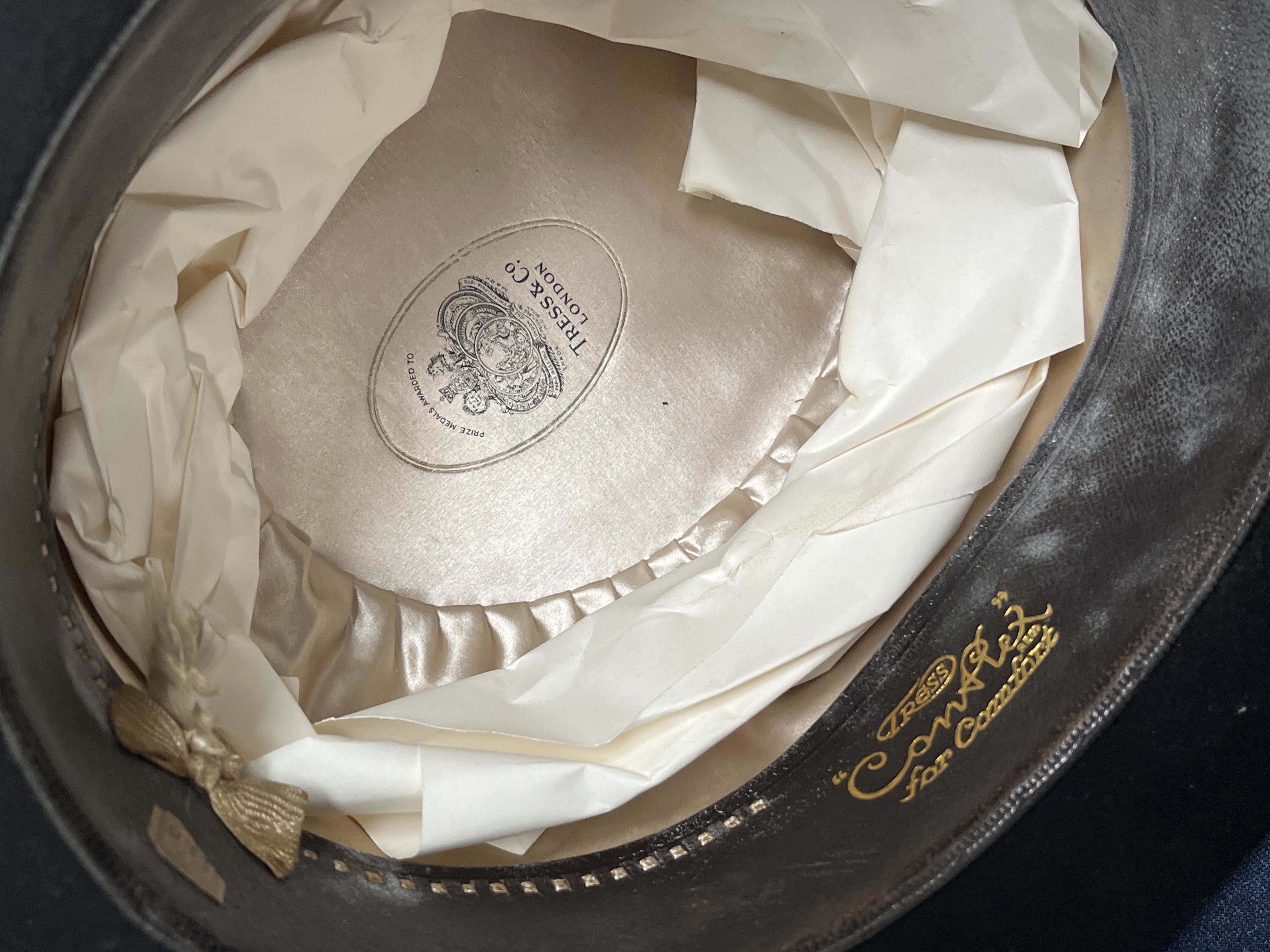 A trio of hats comprising a gentleman’s bowler and two ladies’ formal hats. The bowler hat is constructed of black felt with a matching ribbon band. The interior features a champagne-coloured silk lining marked Tress & Co. London and a leather sweatband stamped in gold with Tress Con-flex for Comfort. The ladies’ headwear includes a wide-brimmed navy blue hat in a satin-like fabric adorned with black and white fabric roses. The collection also includes an ochre-coloured pillbox-style fascinator hat featuring a large matching bow, fashioned from a satin-like fabric.