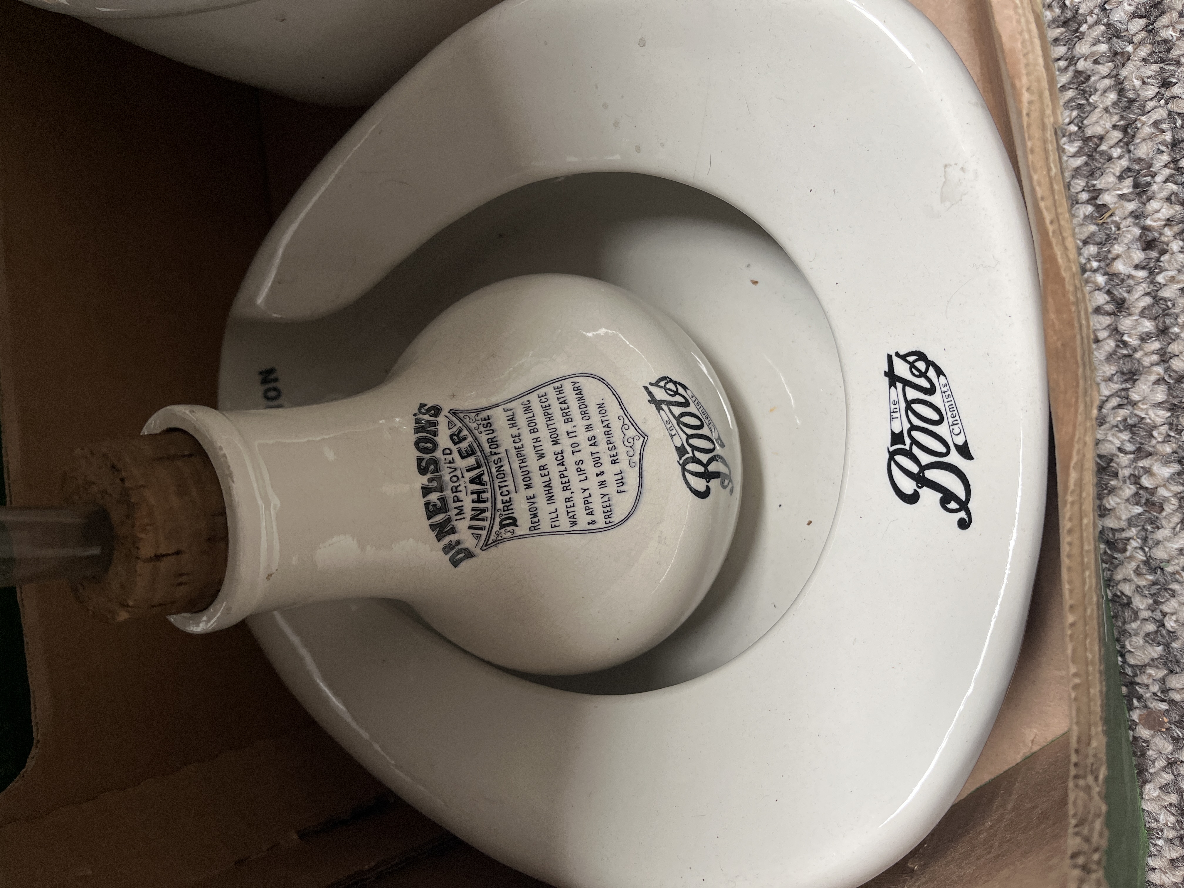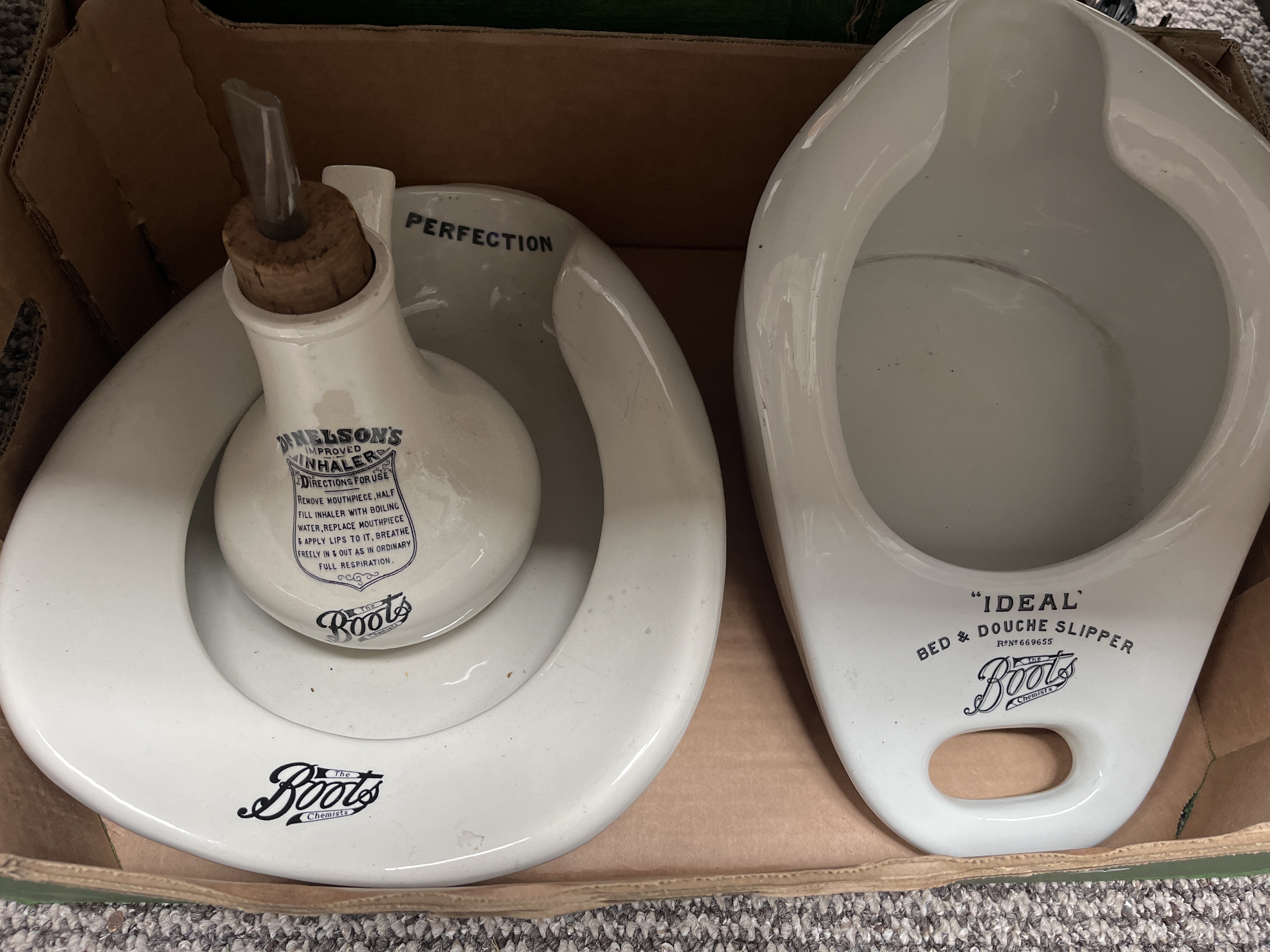 A trio of white glazed porcelain medical items produced for The Boots Chemists. The group comprises a Dr Nelson’s Improved Inhaler, an Ideal Bed and Douche Slipper, and a Perfection bedpan. The inhaler is of bulbous form with a flared neck, featuring black transfer-printed instructions for use and The Boots Chemists branding; it retains a cork stopper and glass mouthpiece. The Ideal Bed and Douche Slipper bedpan is marked with registration number 669655 and the company logo. The Perfection bedpan is an open-style vessel with corresponding transfer-printed labels. All items feature early 20th-century typography and functional labelling.