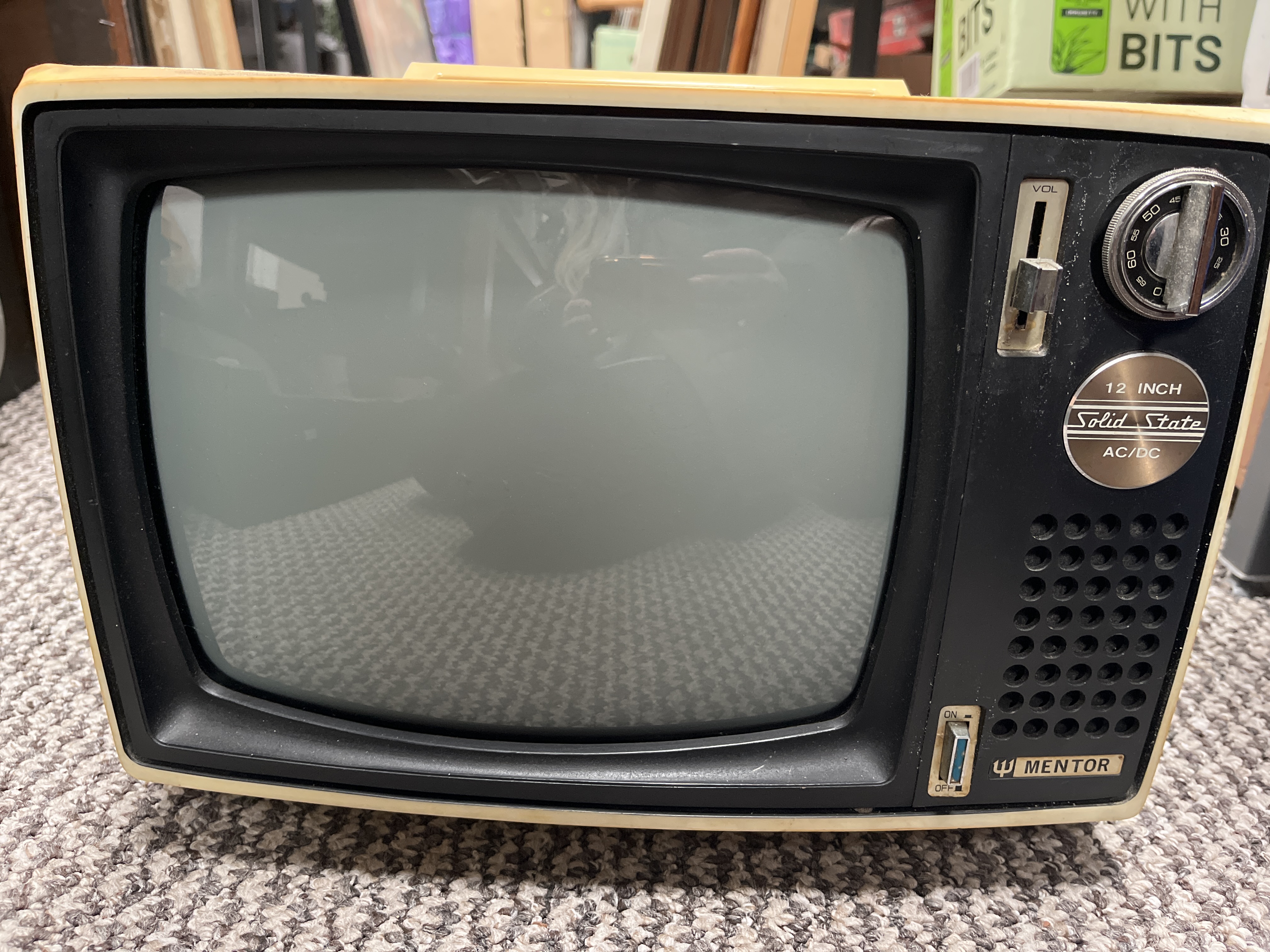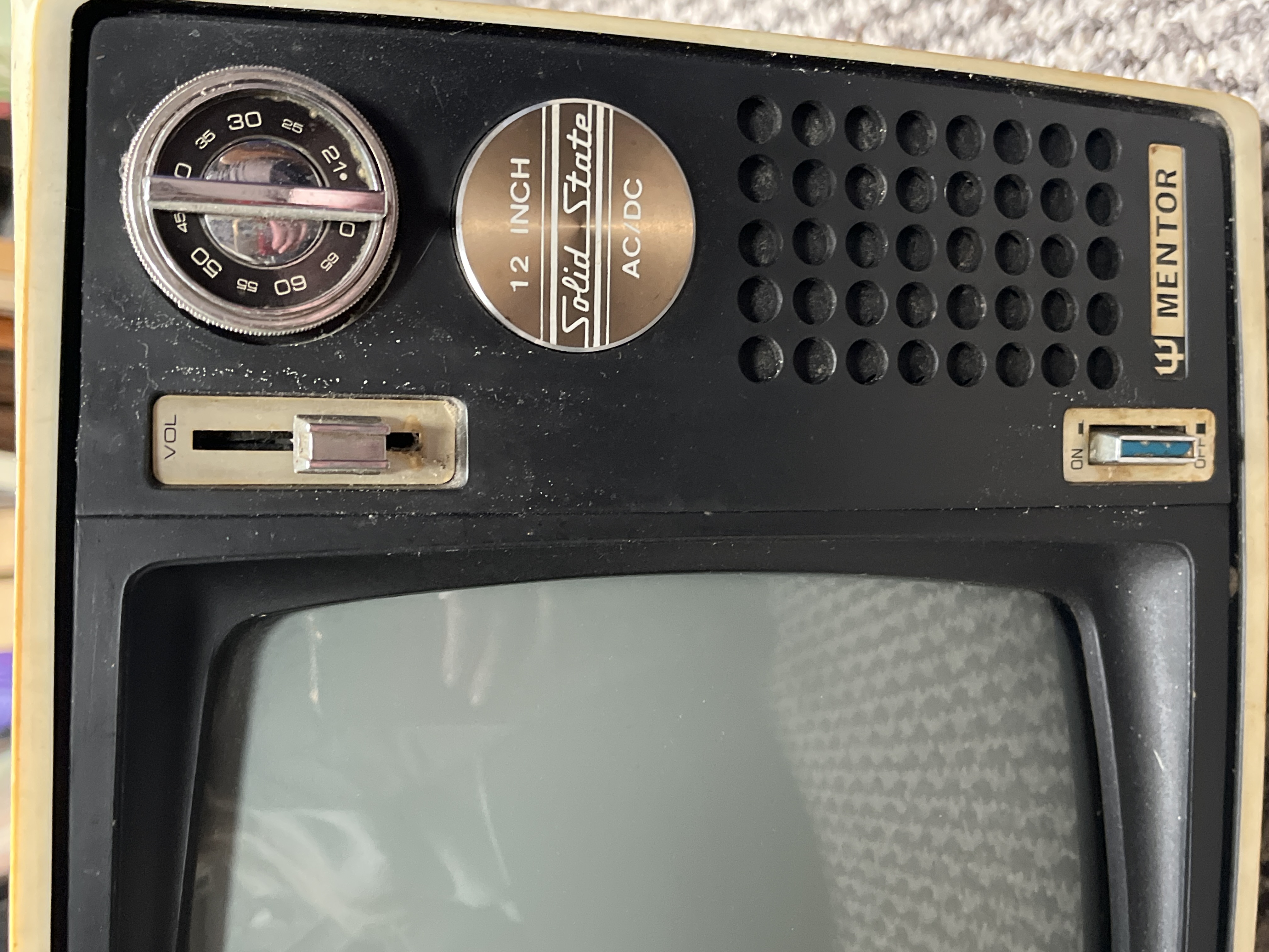 A vintage Mentor 12-inch portable solid state television featuring a two-tone cream and black plastic casing. The front interface is configured with a vertical sliding volume control, a circular channel tuning dial, and a toggle on/off switch. The unit displays a circular metallic-finish emblem inscribed 12 INCH Solid State AC/DC. A nameplate to the lower right identifies the maker as Mentor accompanied by a trident logo. The fascia includes a perforated speaker grille.