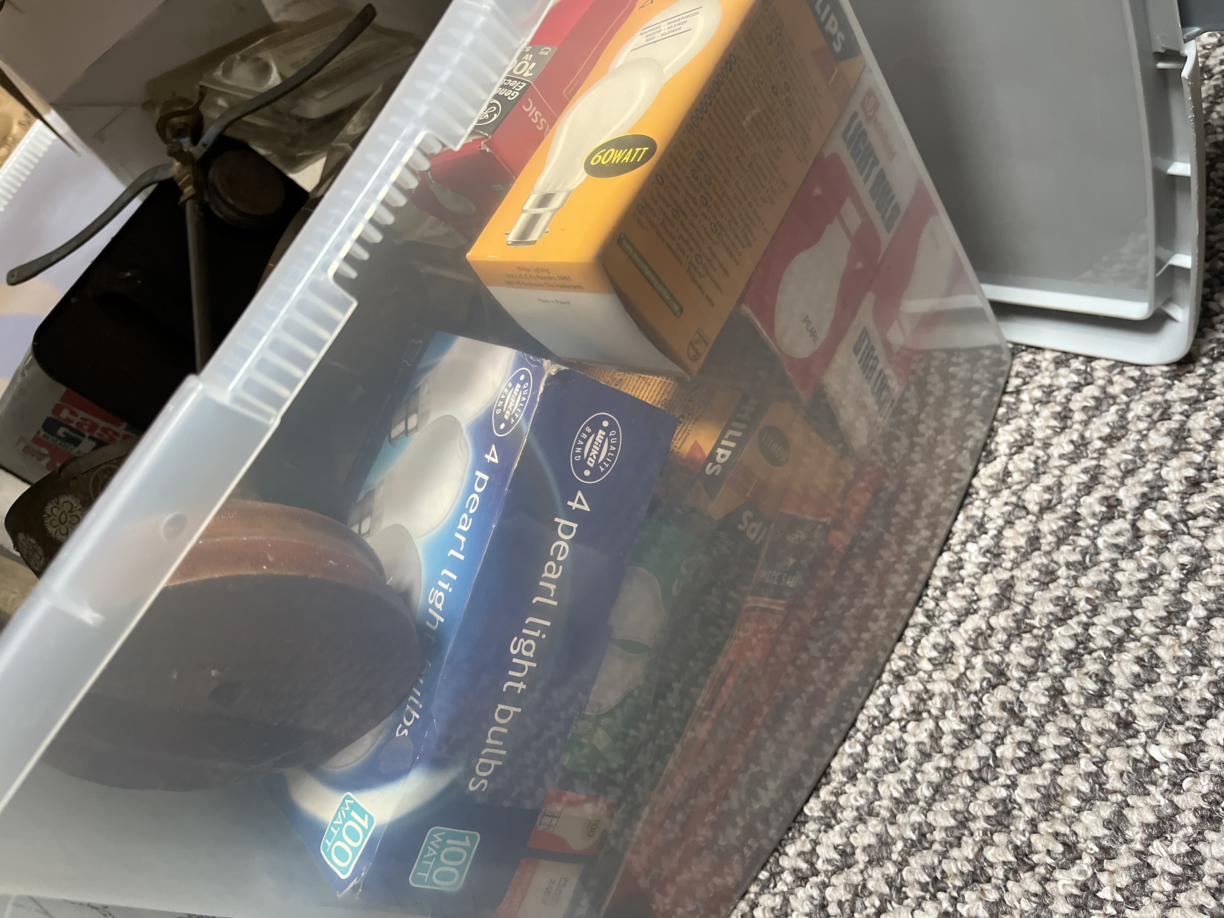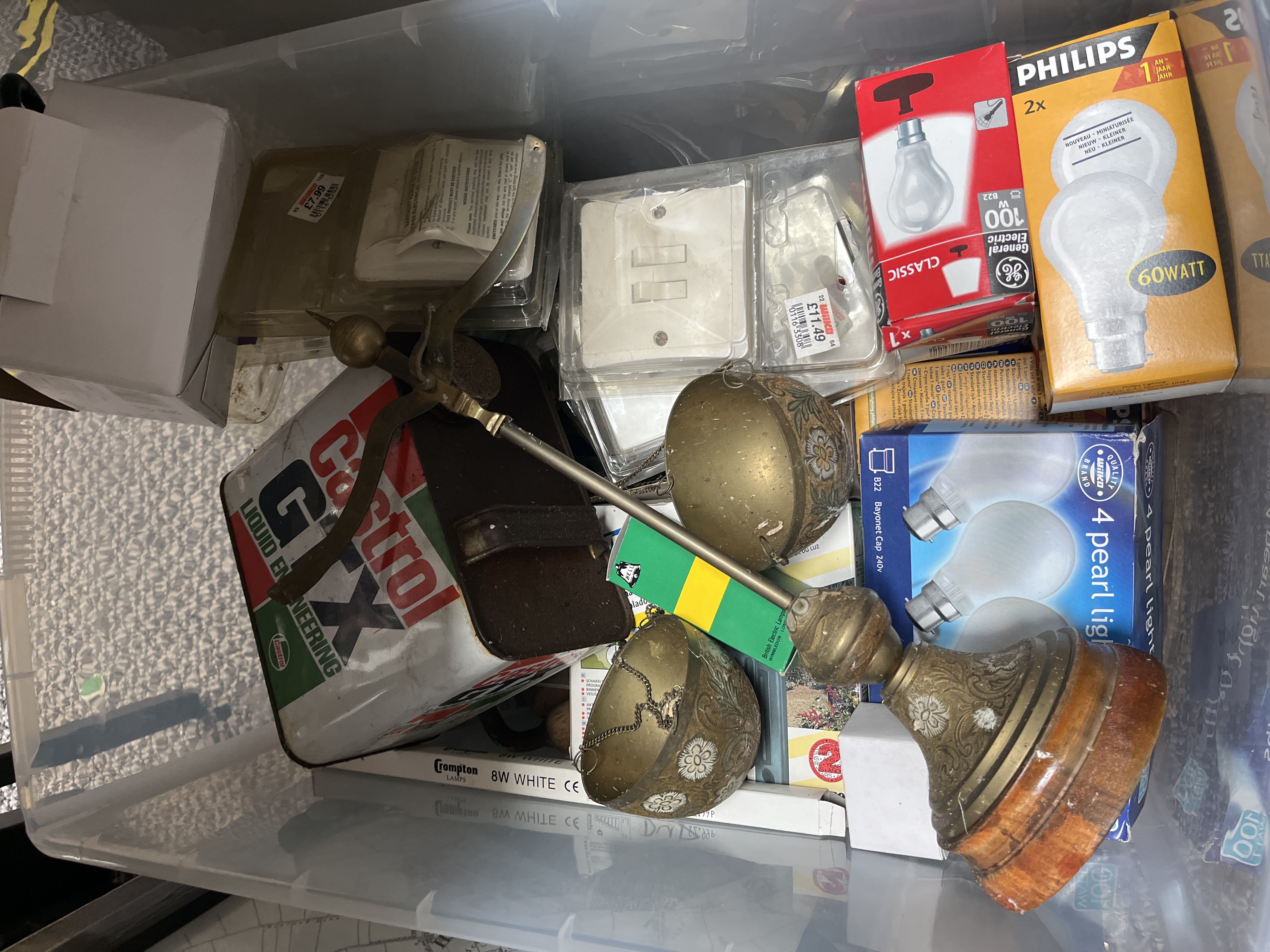 A collection of vintage household and automotive items contained within a plastic storage bin. The lot features a vintage lithographed Castrol GTX motor oil tin and a decorative brass balance scale with floral etched bowls and a wood-turned base. The assortment further includes several boxes of light bulbs from manufacturers such as Philips, GE, and Wilko, including 60W and 100W equivalent lamps. Also present are light switches in original retail packaging and a Crompton 8W white fluorescent tube. Materials consist of metal, glass, plastic, and cardboard.