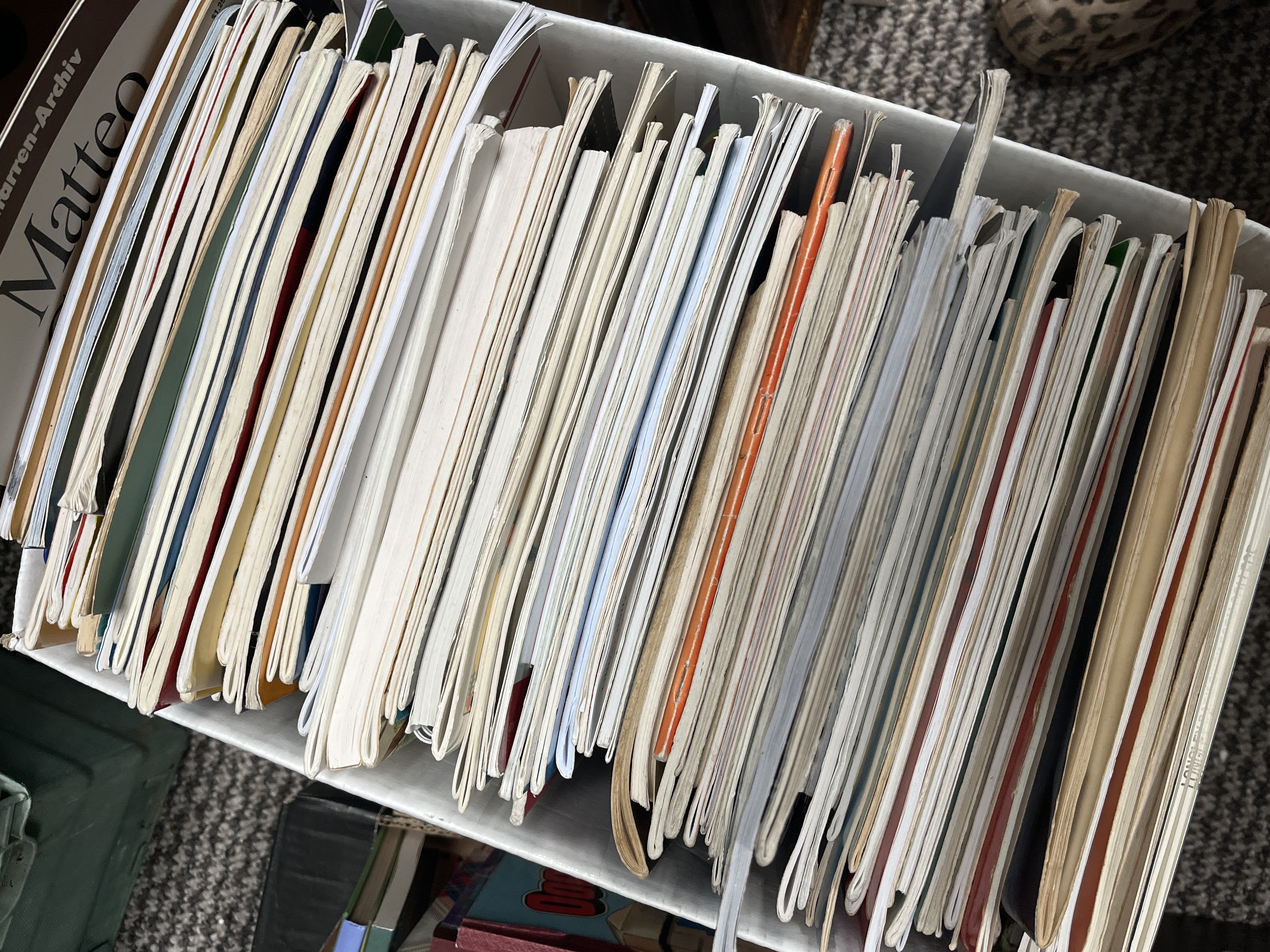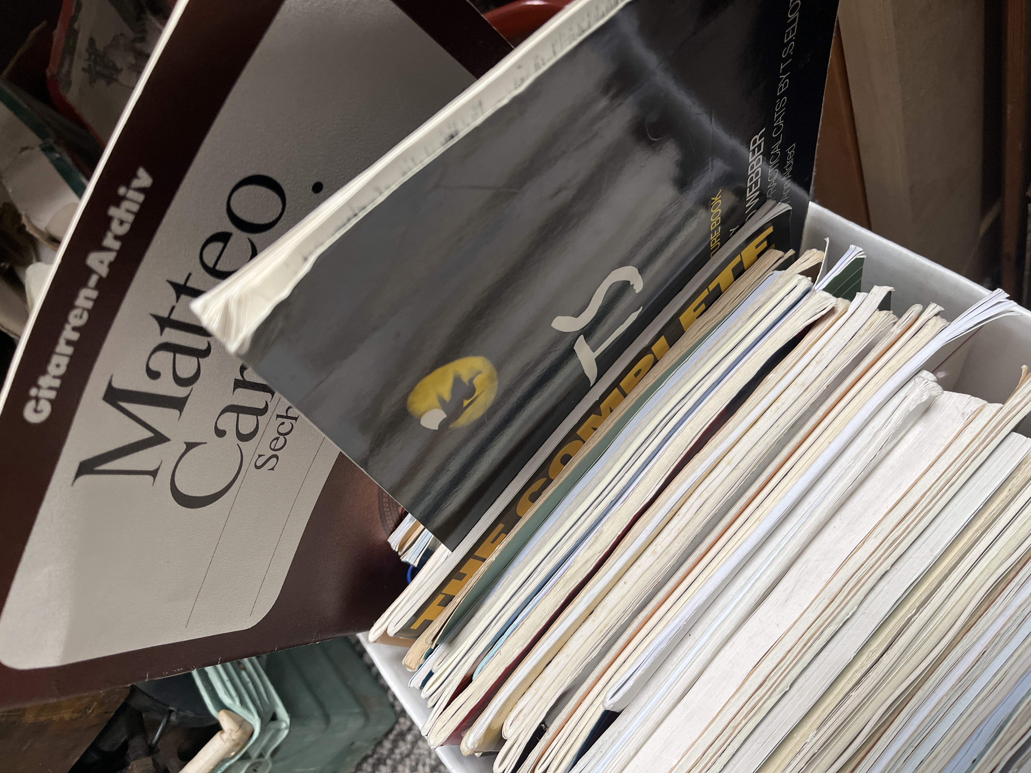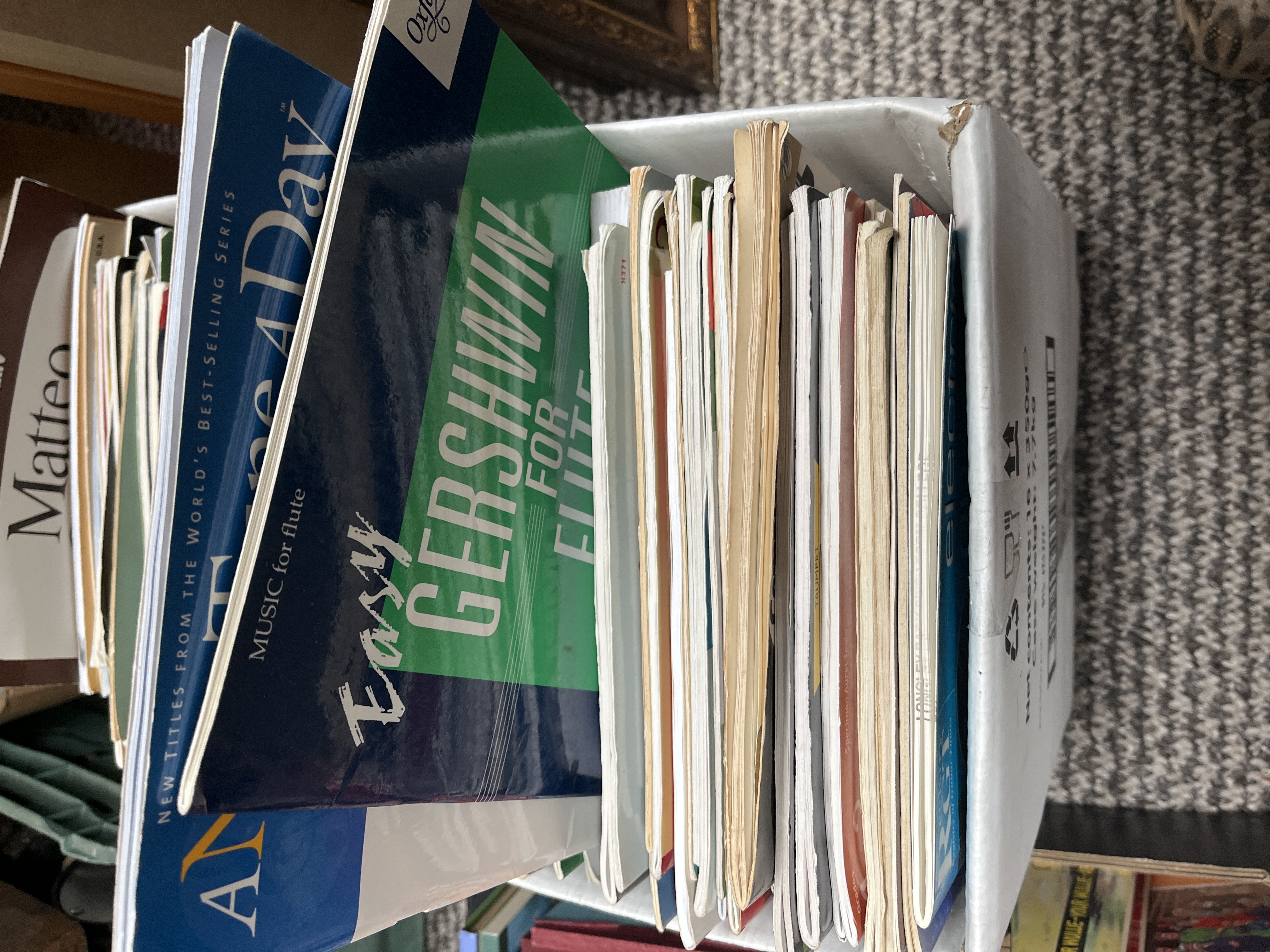 A collection of printed sheet music and instructional booklets, primarily focused on flute and guitar arrangements. The lot includes titles such as Easy Gershwin for Flute published by Oxford University Press, music from the stage production Cats by Andrew Lloyd Webber, and a volume from the Gitarren-Archiv for Matteo Carcassi. The items are housed in a white cardboard storage box. This group, identified as C1188, contains various softcover publications of varying sizes and periods.