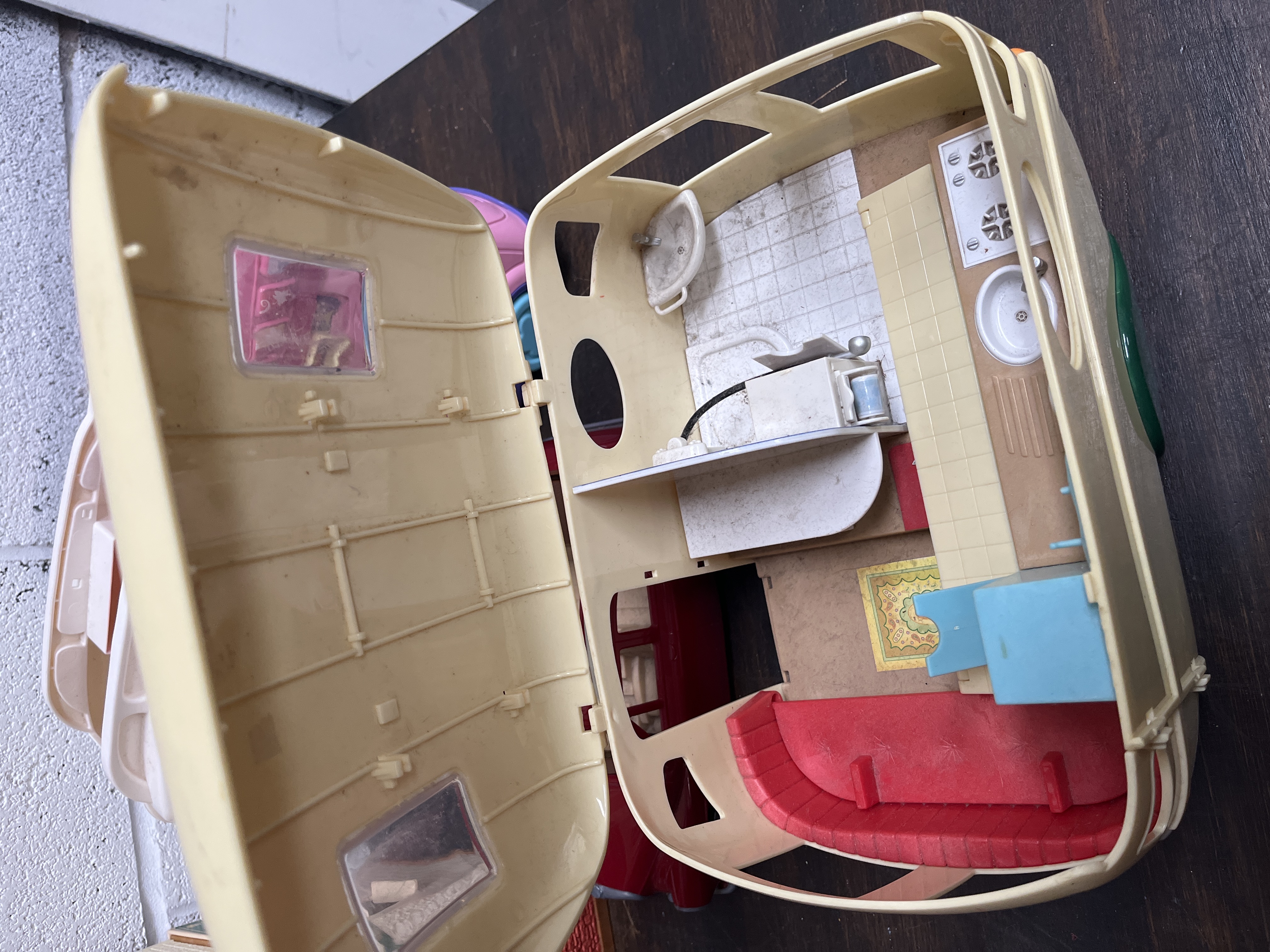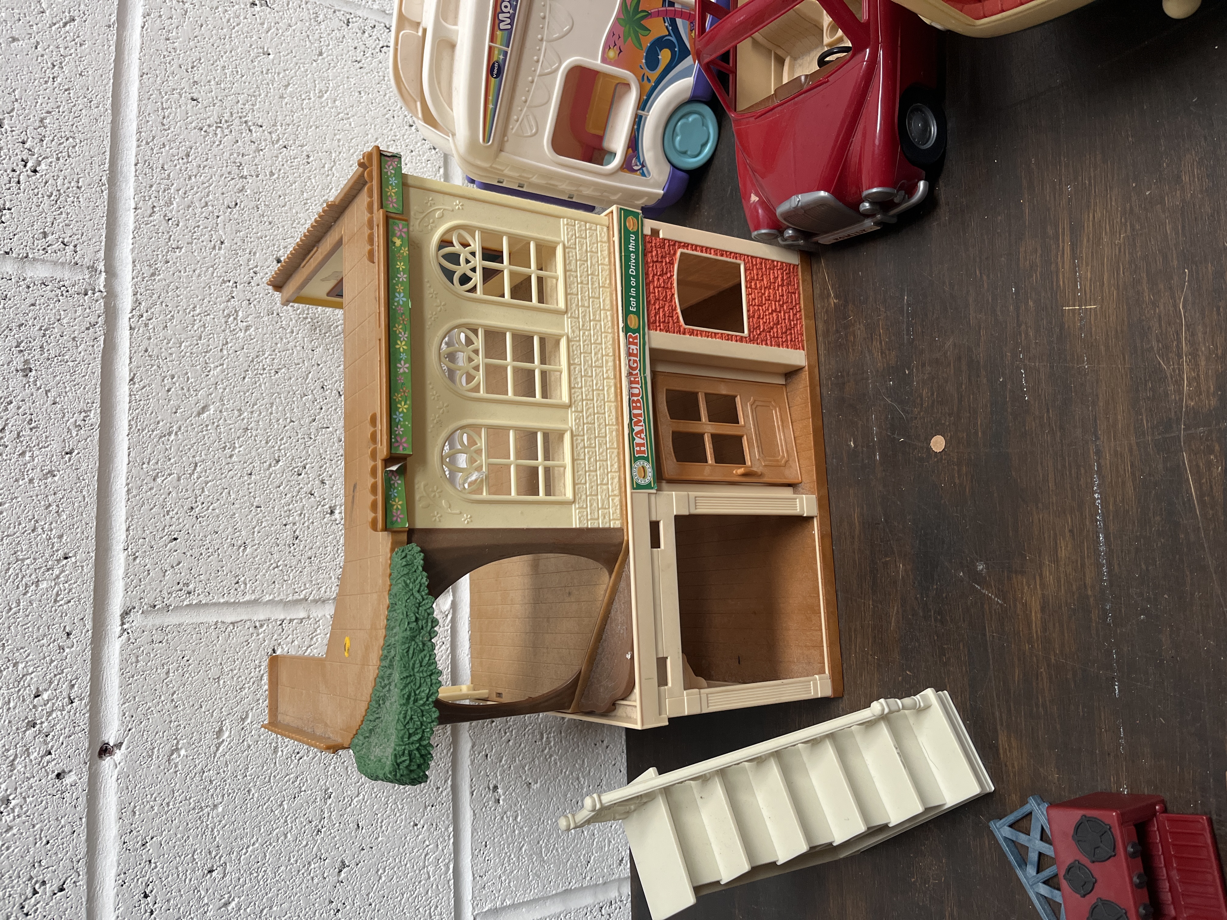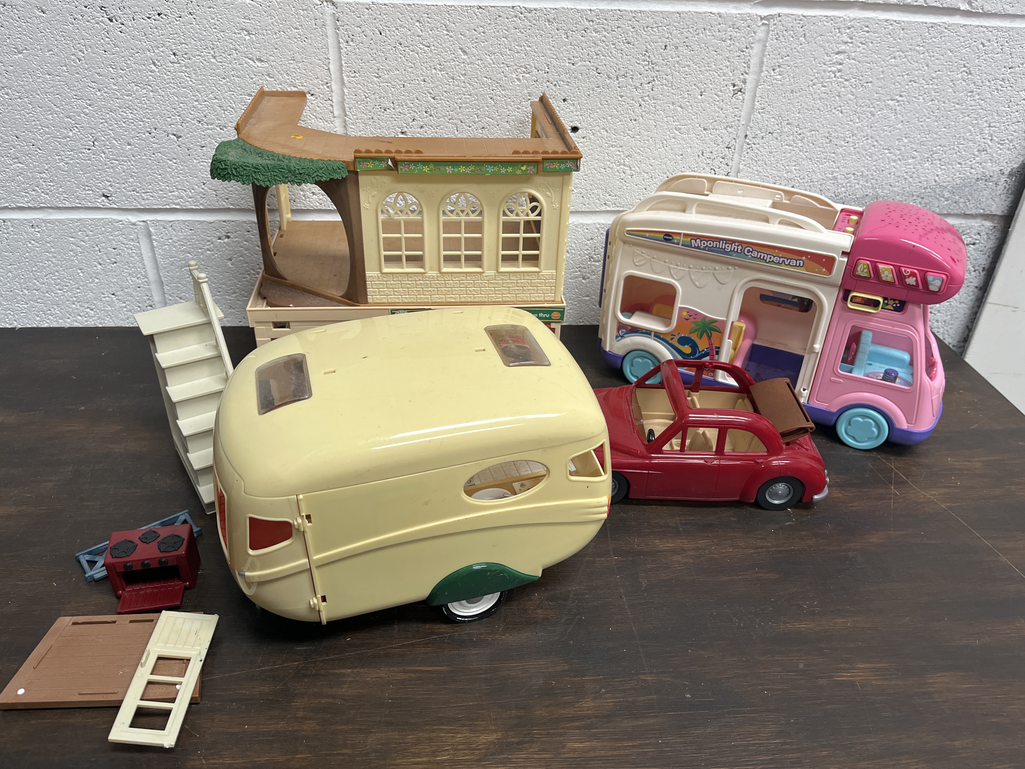 A collection of moulded plastic toy playsets and vehicles, primarily comprising items attributed to the Sylvanian Families (Calico Critters) range alongside a Vtech vehicle. The group features a cream-coloured caravan with a hinged side opening to a fitted kitchenette and red seating. Included is a red convertible car and a multi-level building structure with a sign reading HAMBURGER Eat in or Drive thru, decorated with floral trim and a green tree motif. Also present is a pink and white Moonlight Campervan with blue accents, bearing the Vtech manufacturer mark. The lot is completed by various accessories including white plastic stairs, a red toy stove, and assorted flat plastic elements.