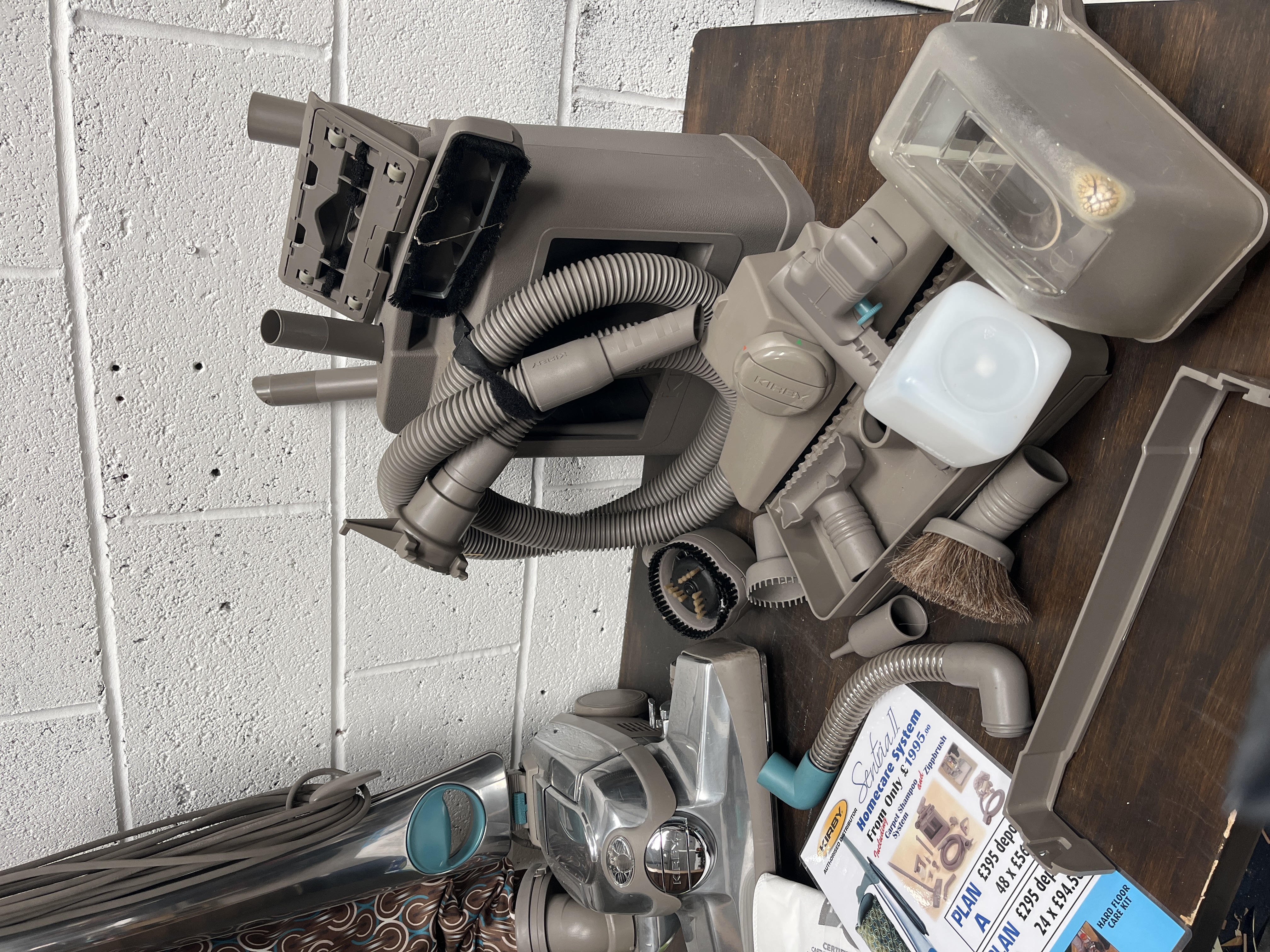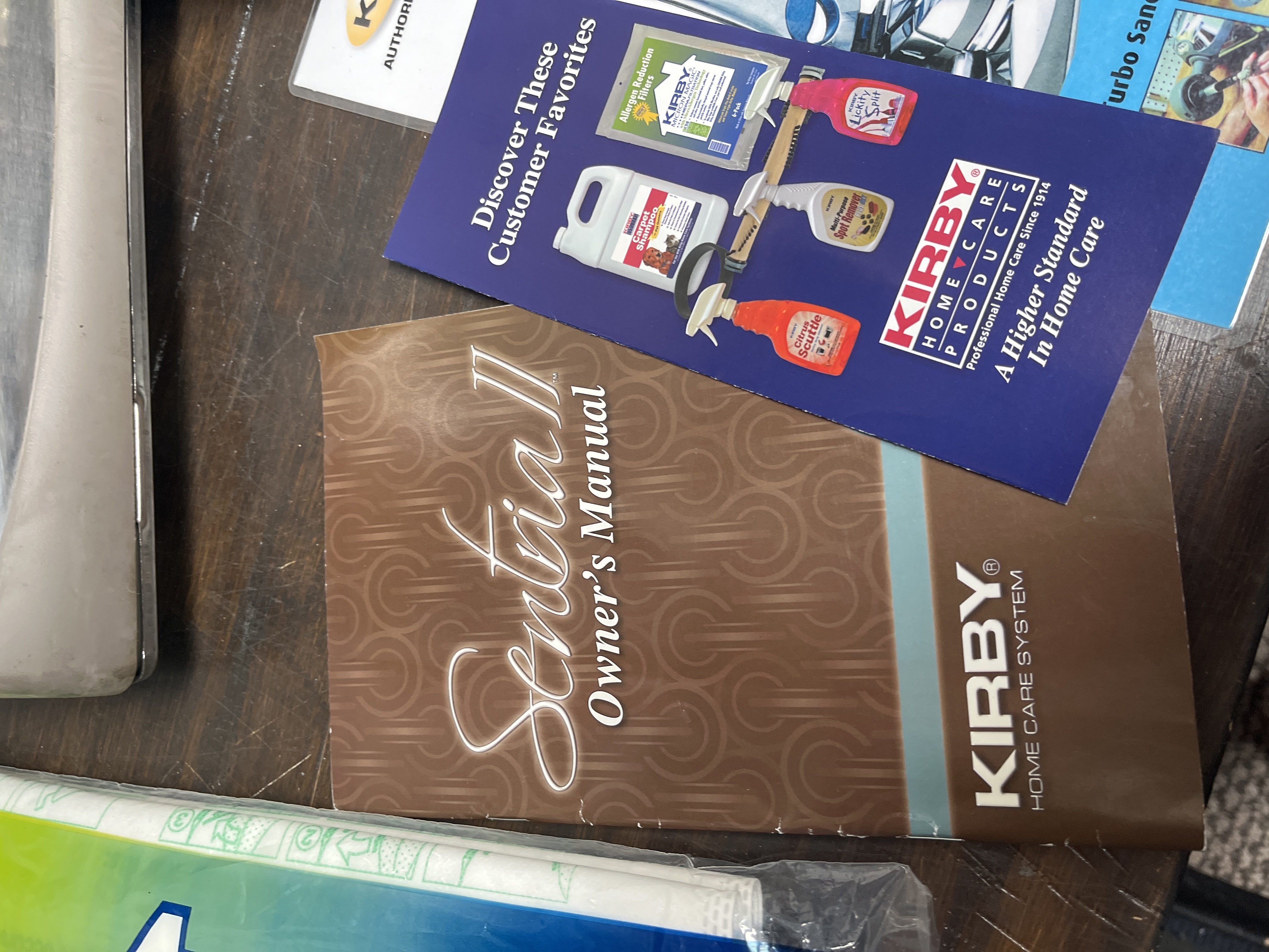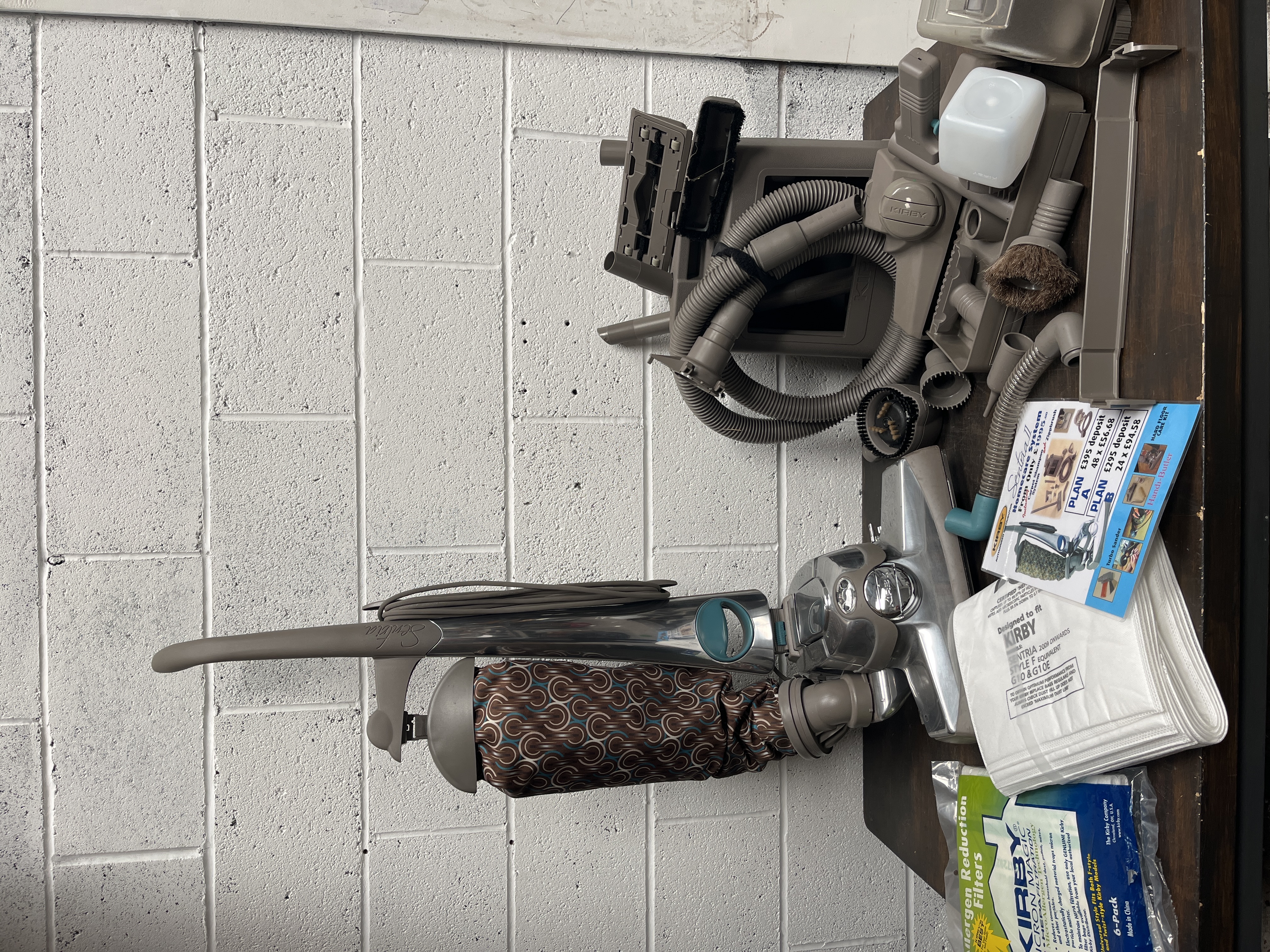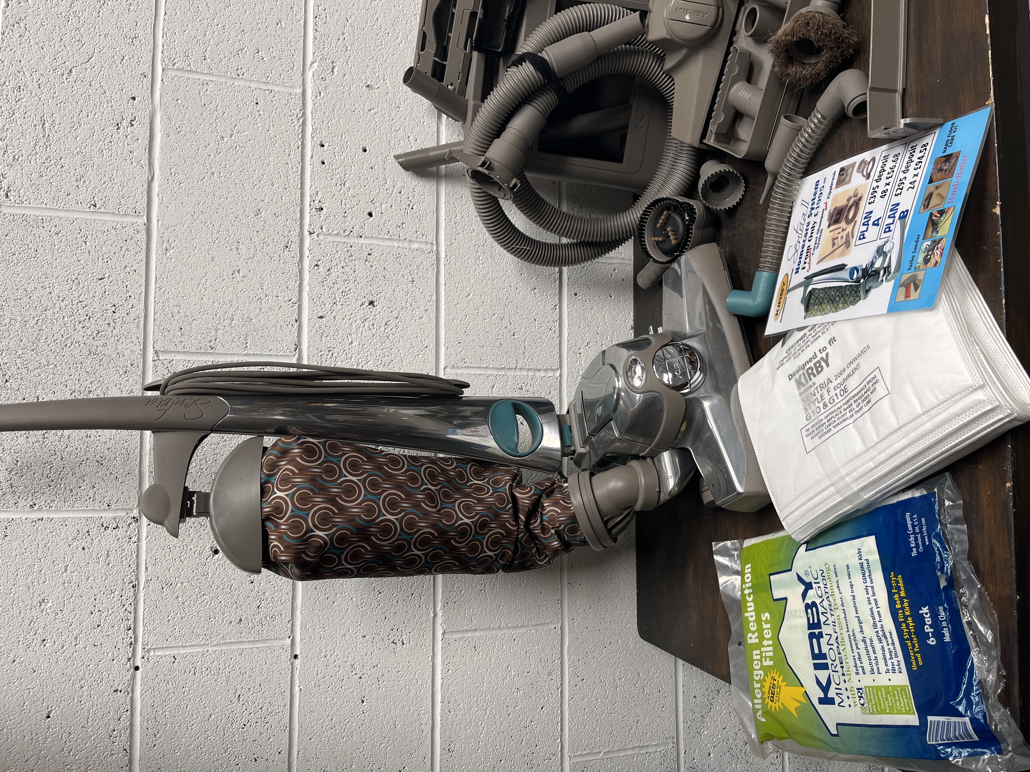 A Kirby Sentria II Home Care System comprising an upright vacuum cleaner with a polished chrome-finish body and a brown and gold patterned fabric collection bag. The lot includes an assortment of accessories including flexible hoses, various brush heads, extension tubes, and components for a carpet shampooing and hard floor care system. Also included are a group of Kirby brand HEPA Magic allergen reduction filter bags in original packaging, an official owner’s manual, and promotional literature. The Kirby and Sentria II branding is visible on the main unit and documentation.