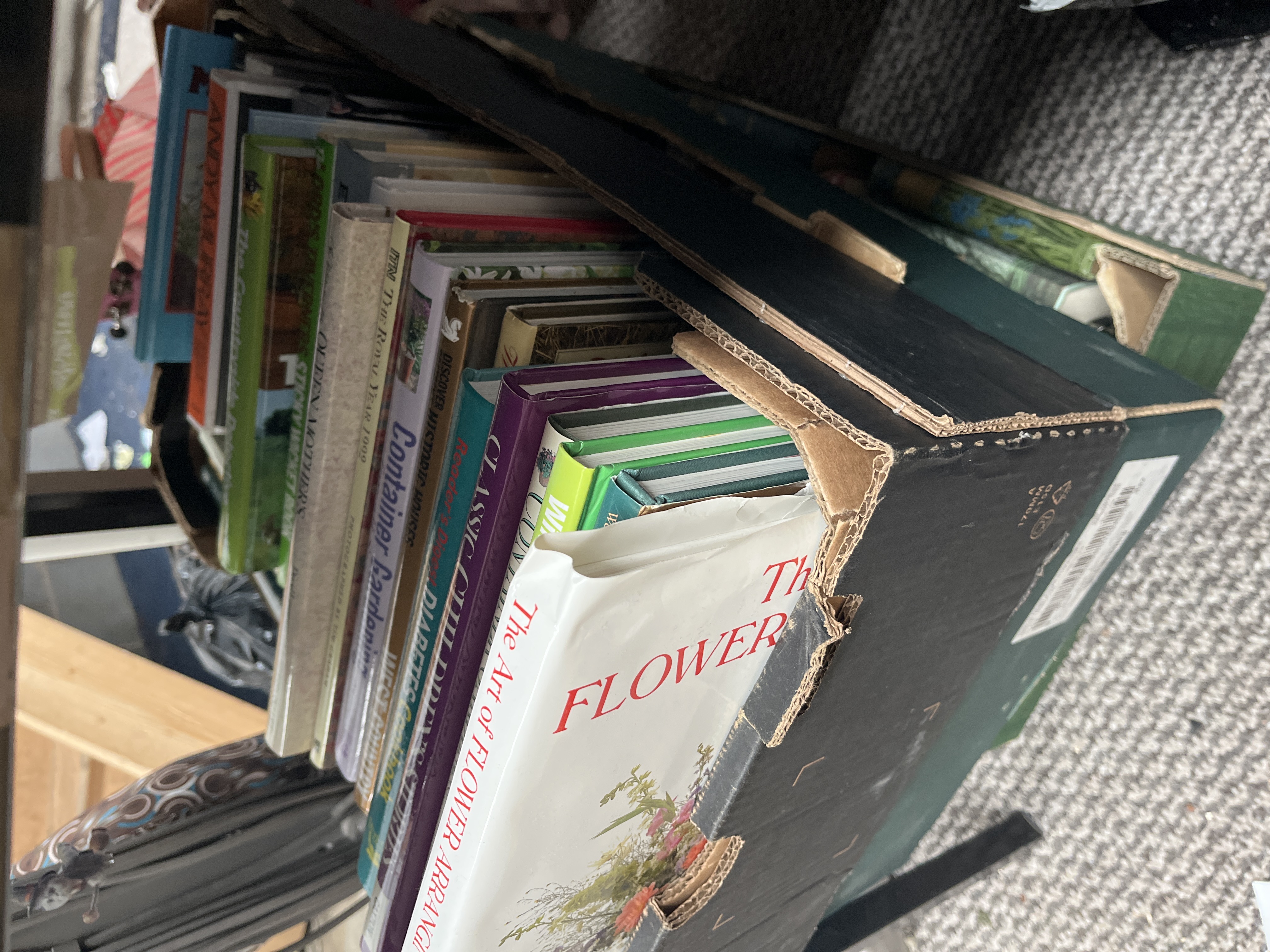 An assortment of primarily hardback non-fiction and reference books covering various subjects including horticulture, history, biography, and culinary arts. Visible titles include The Art of Flower Arranging, Container Gardening, In The Royal Year 1989, Classic Children’s Stories, and the Reader’s Digest Diabetes Cookbook. The volumes are housed within a black cardboard storage box.