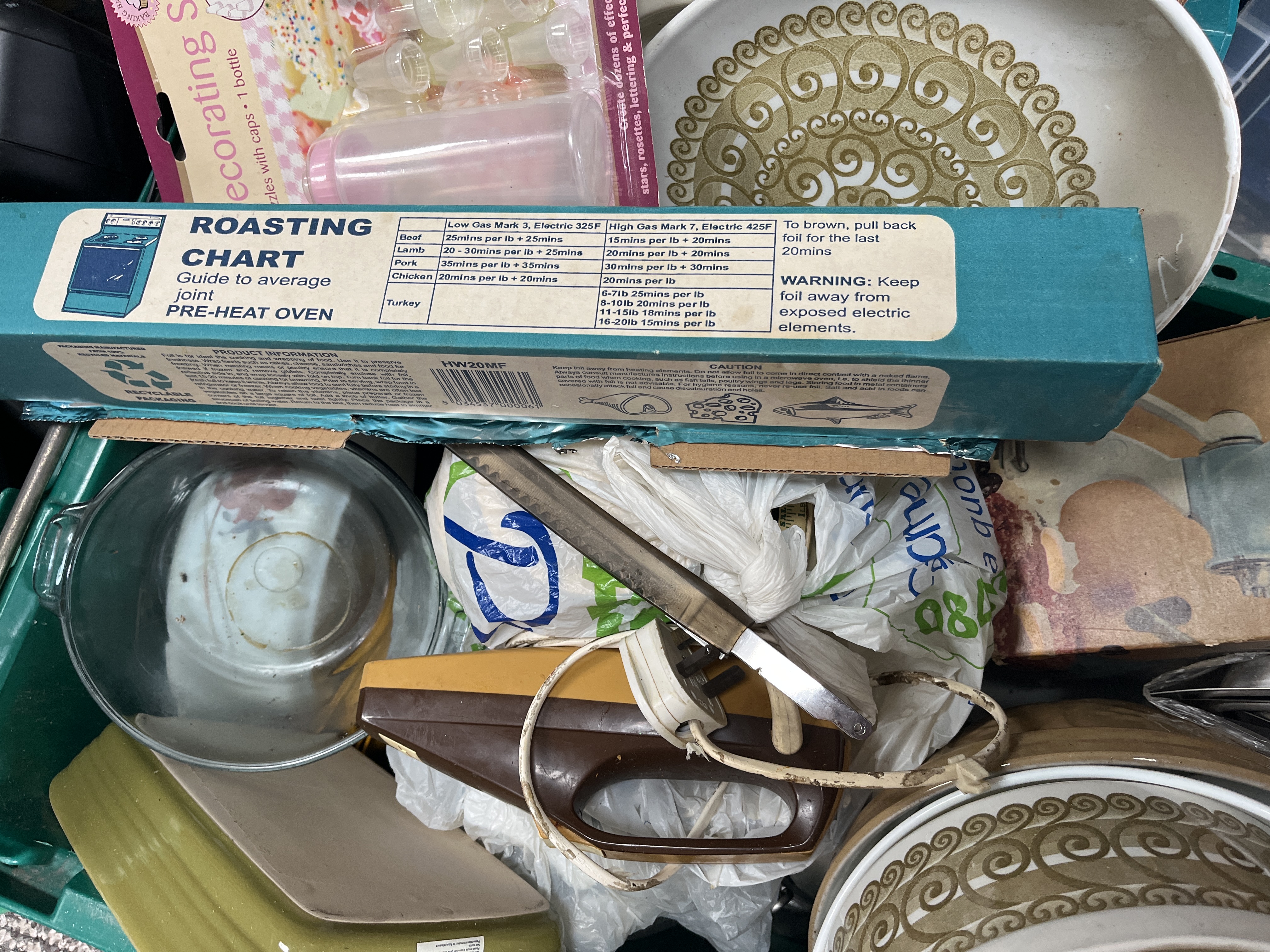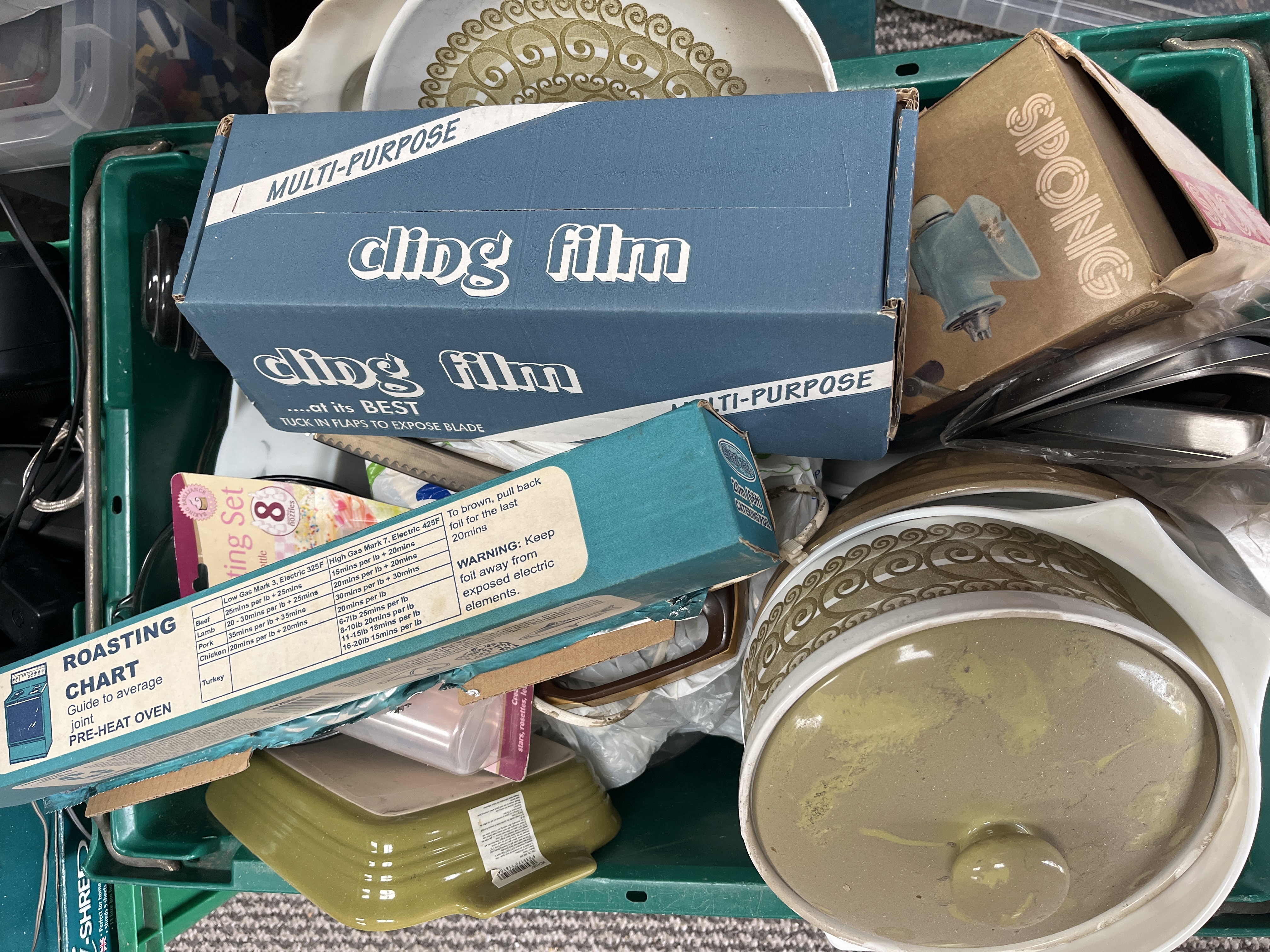 An assortment of mid-to-late 20th-century kitchenware and household sundries. The collection includes ceramic oven-to-tableware featuring a repeating olive and white scroll pattern, comprising a lidded casserole dish and an oval serving dish. Also present is a boxed item by Spong, a brown and tan electric carving knife with its associated power cord, and various boxed kitchen consumables including Multi-Purpose cling film and a foil dispenser featuring a printed roasting chart. The lot is completed by a cake decorating set with eight nozzles and other miscellaneous items. Materials include ceramic, metal, plastic, and cardboard packaging.