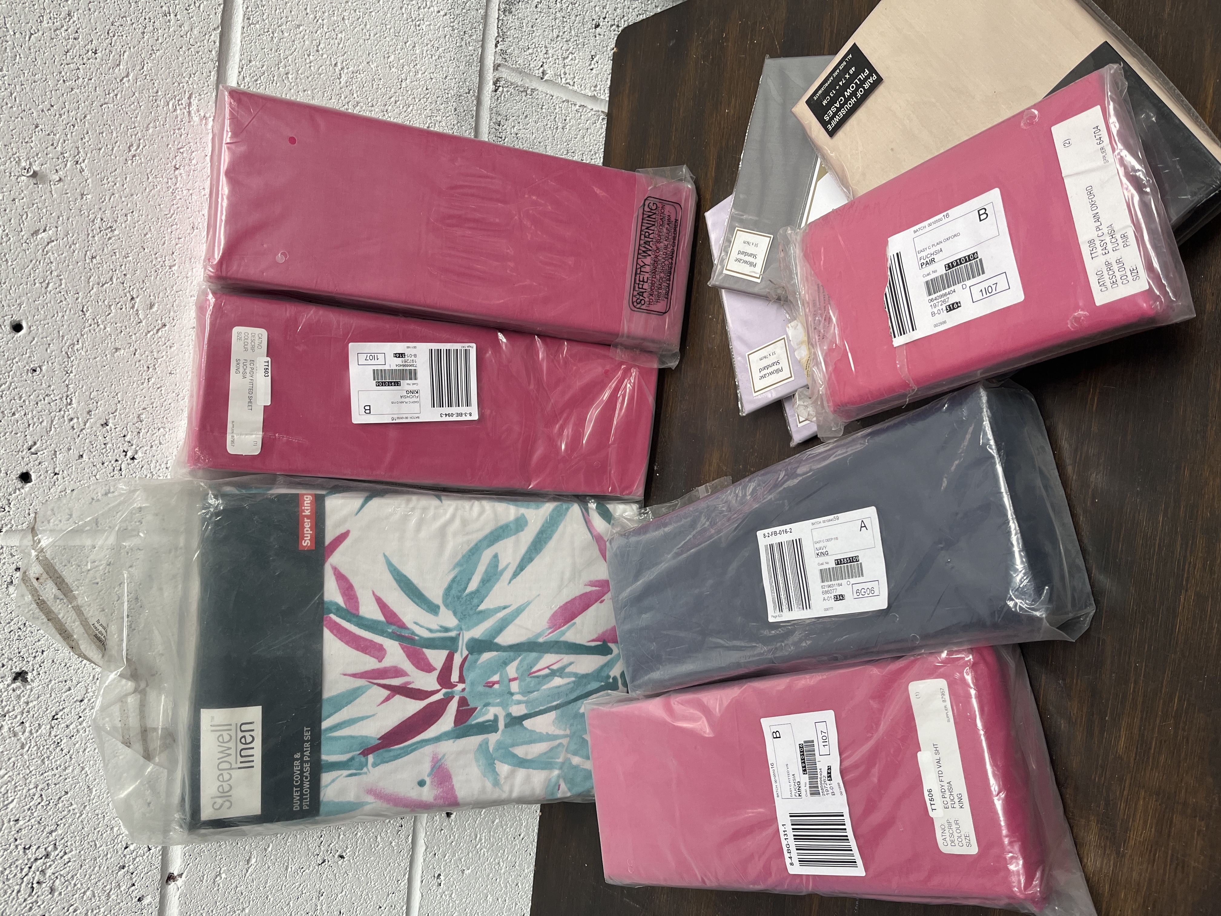 A collection of contemporary home bedding and linens, primarily in original retail packaging. The group includes various items such as fitted sheets, valance sheets, and pillowcase pairs in solid colours including fuchsia, navy blue, light grey, and tan. Notable items include a Sleepwell Linen branded duvet cover and pillowcase set featuring a fuchsia and teal bamboo leaf motif on a white background. Retail labels indicate sizes such as standard, kingsize, and super king. Markings on the packaging include descriptions such as Easy C Plain Oxford, Pair of Housewife Pillowcases, and material designations for easy care fabrics.