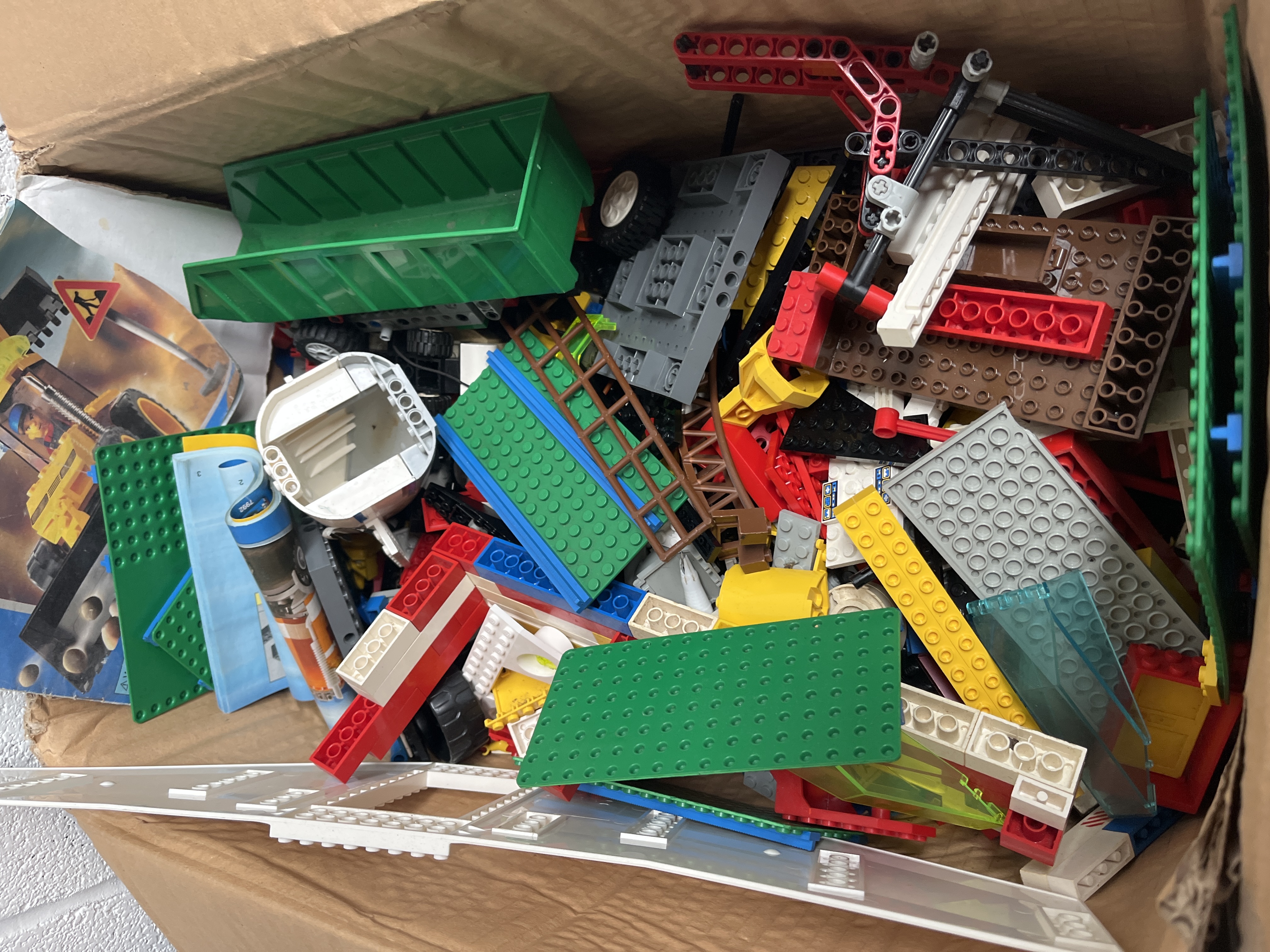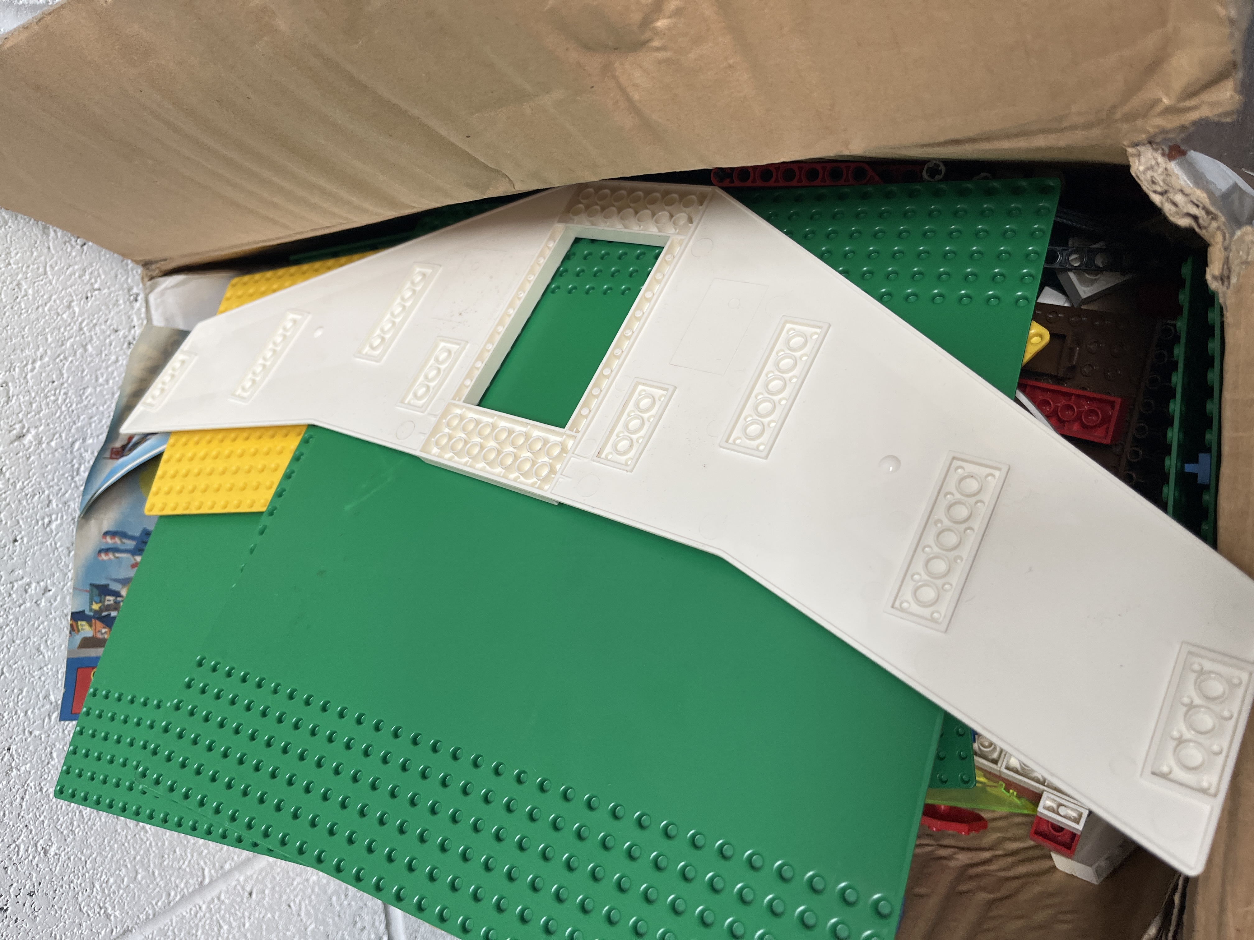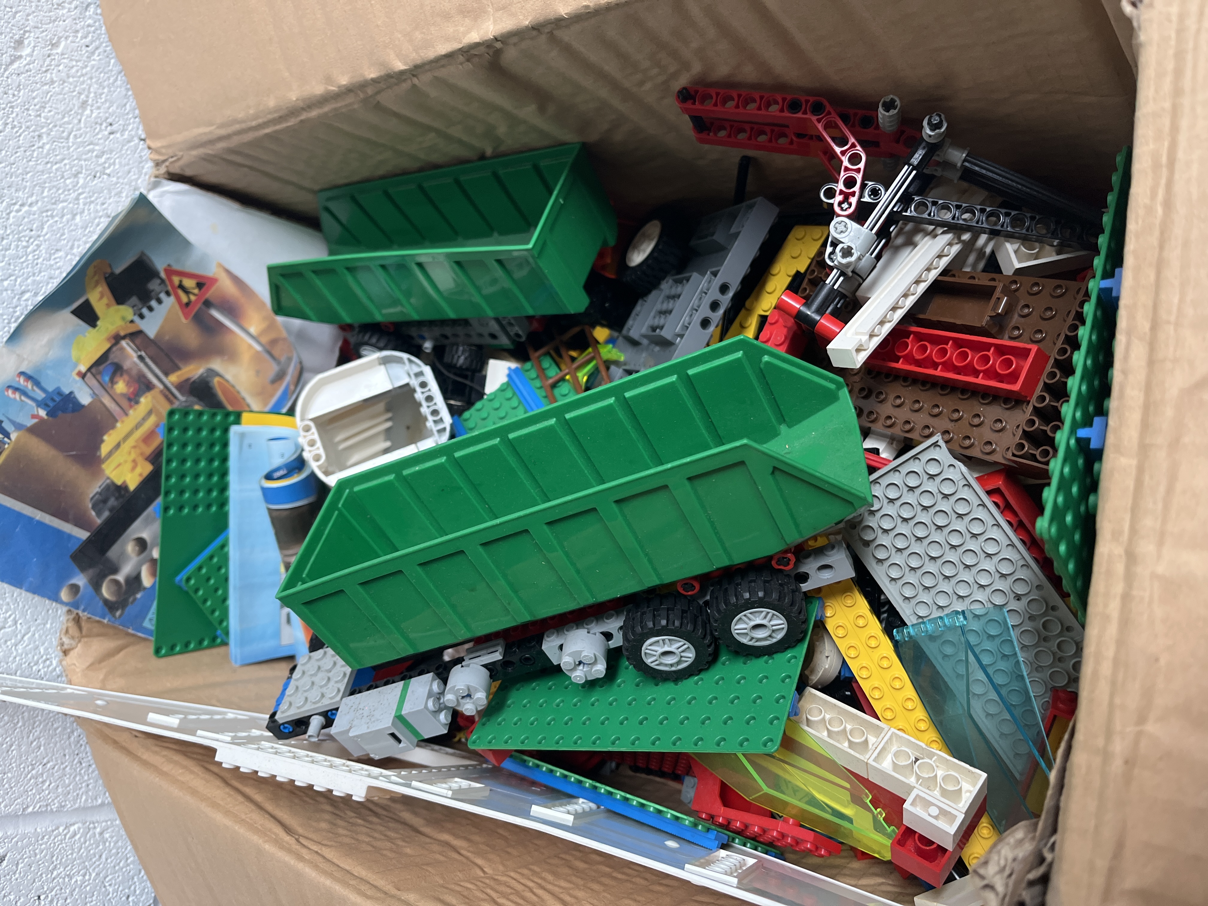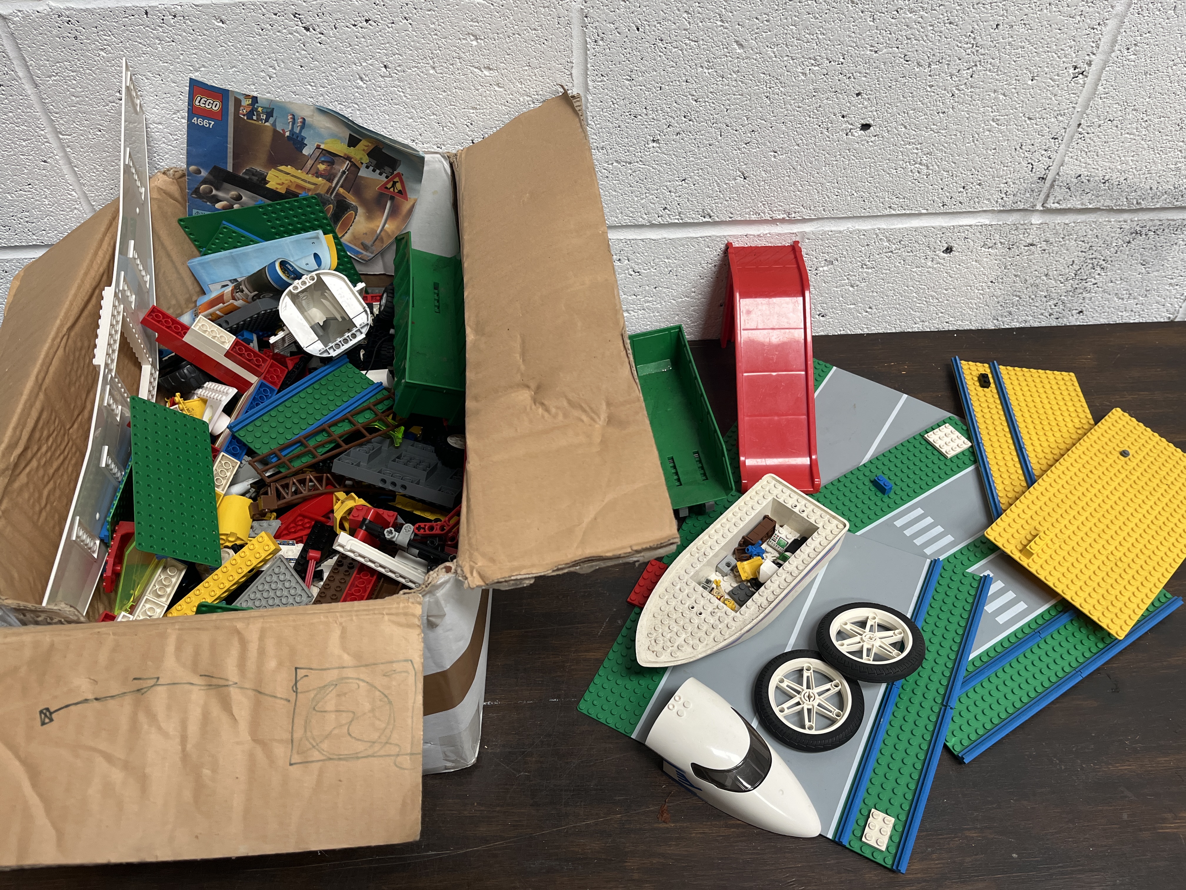 An assortment of loose LEGO building elements and components. The collection includes a variety of standard bricks, plates, and large baseplates in colours including green and yellow. Notable inclusions are several road-themed baseplates with printed markings, a white boat hull, aircraft fuselage components, and various wheels and tyres. The lot also contains elements from the Technic range and a green container unit. Accompanying the bricks are original instruction manuals for LEGO sets 4667 (Power Pitstop) and 7992 (Container Stacker). The items are constructed from injection-moulded plastic.