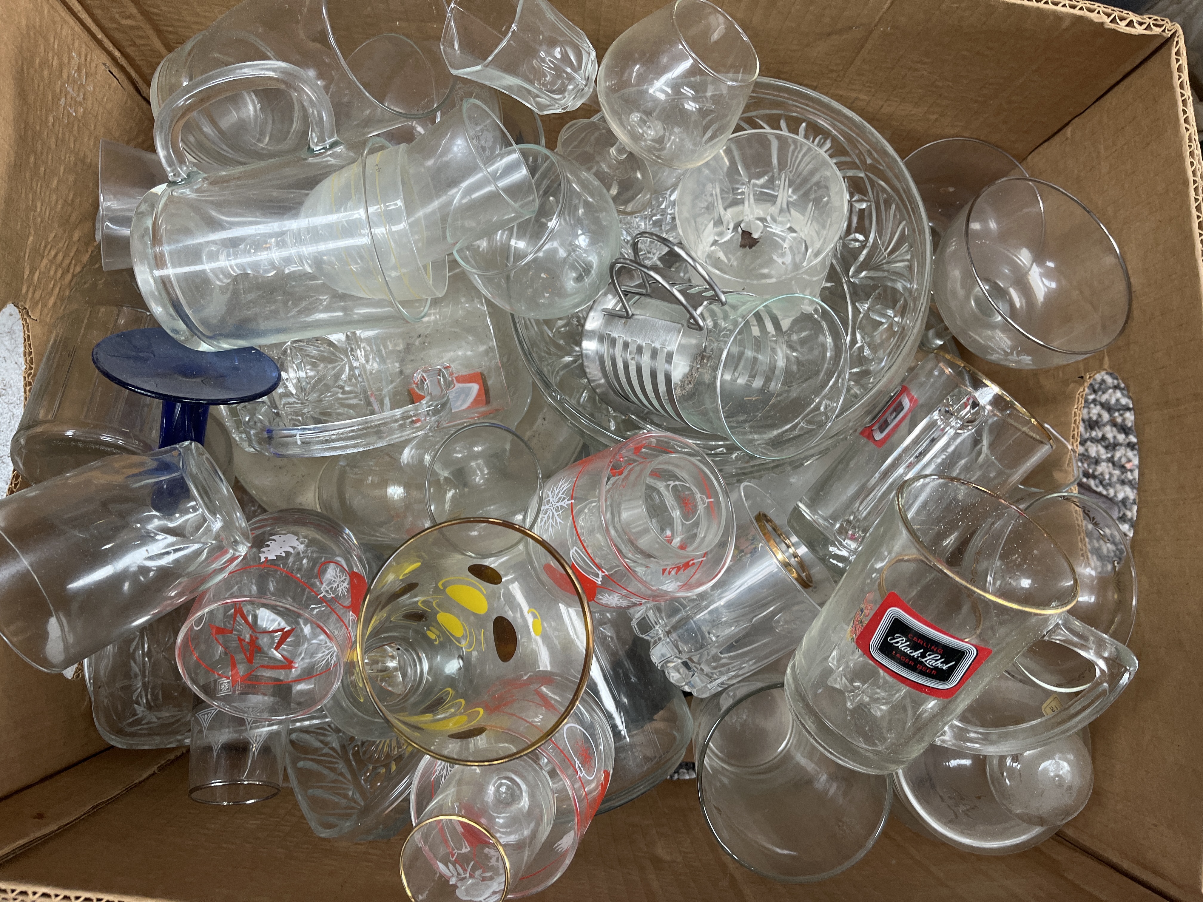 A collection of various glassware items including assorted drinkware such as beer mugs, tumblers, wine glasses, brandy snifters, and small juice glasses. Notable pieces include a Carling Black Label lager beer mug with a red and black printed label and gold-toned rim, glassware with red snowflake holiday motifs, and several gold-rimmed glasses. The assortment also contains a blue-stemmed glass, a large clear glass pitcher, several pressed glass bowls with geometric patterns, and a glass vessel with a metal handle. The items are primarily clear glass, with some featuring decorative prints and coloured accents.