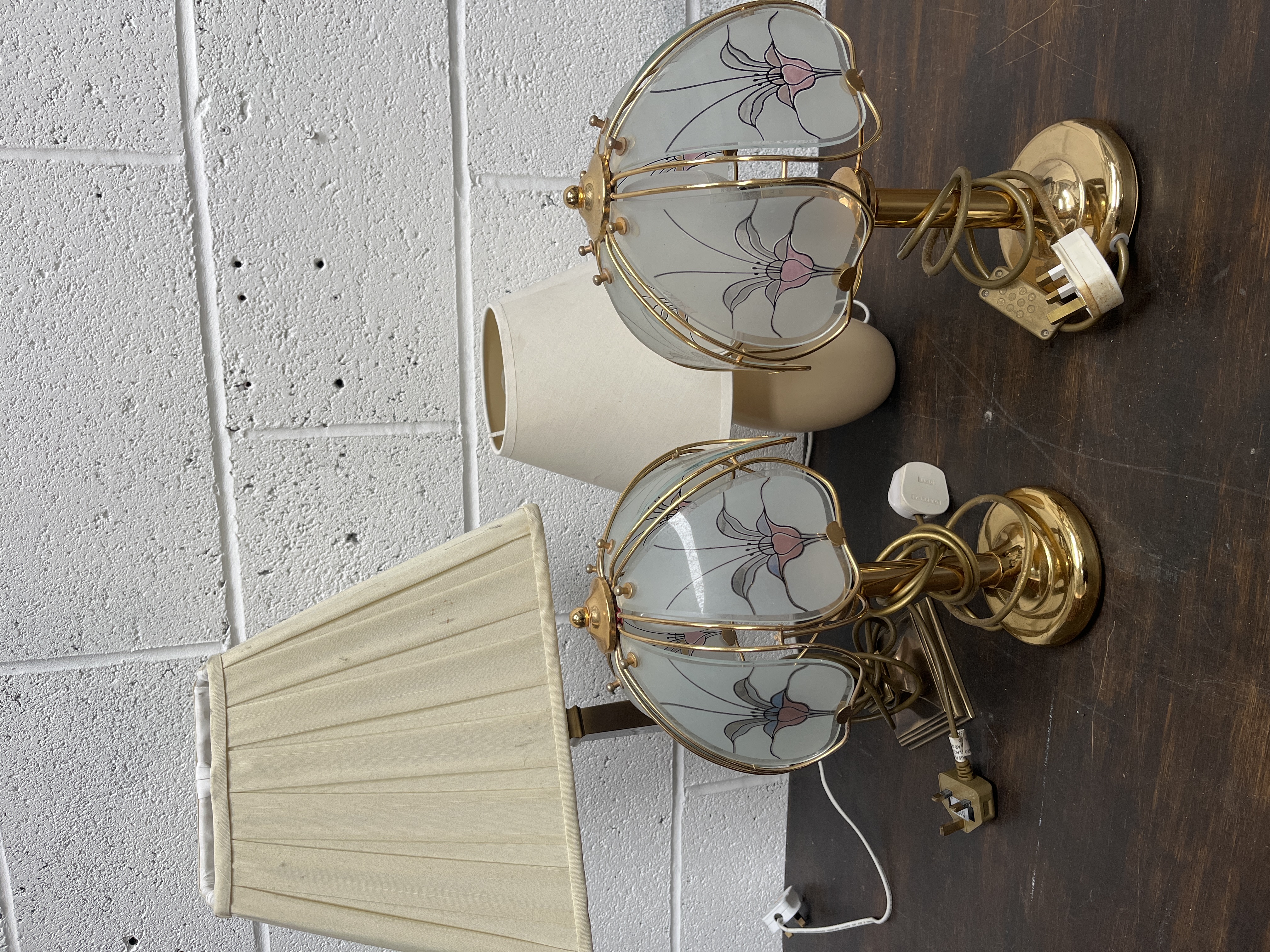 A collection of table lamps featuring two polished brass-finish touch lamps in the Hollywood Regency style. These lamps are designed with decorative spiral-wrapped stems and tulip-style shades composed of curved, frosted glass panels set within brass-tone wire frames. Each glass panel is embellished with a stylised pink and blue floral lily motif. Also included in the group is a lamp with a cream-coloured pleated fabric shade and an additional cream-coloured lamp base. The items are equipped with standard electrical cords and three-prong plugs.