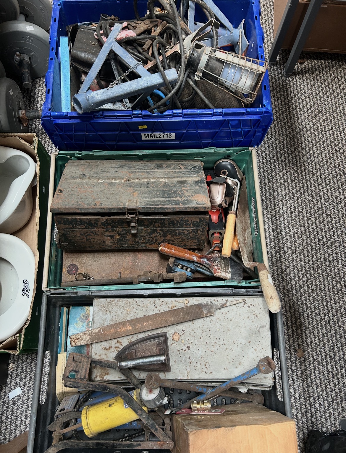 An assortment of vintage hand tools, industrial equipment, and miscellaneous hardware, including a metal toolbox by Draper. The collection is presented in several plastic crates and boxes and contains multiple trowels with wooden handles, a large metal file, various wrenches, and a caged work light with associated electrical wiring. Also featured is a yellow pressurized canister, a paintbrush, and stacked metal plates. One blue crate bears the label MAIL2713. The lot further includes white ceramic sanitary ware marked with the Boots logo. The items are constructed from various materials including steel, iron, ceramic, and plastic.
