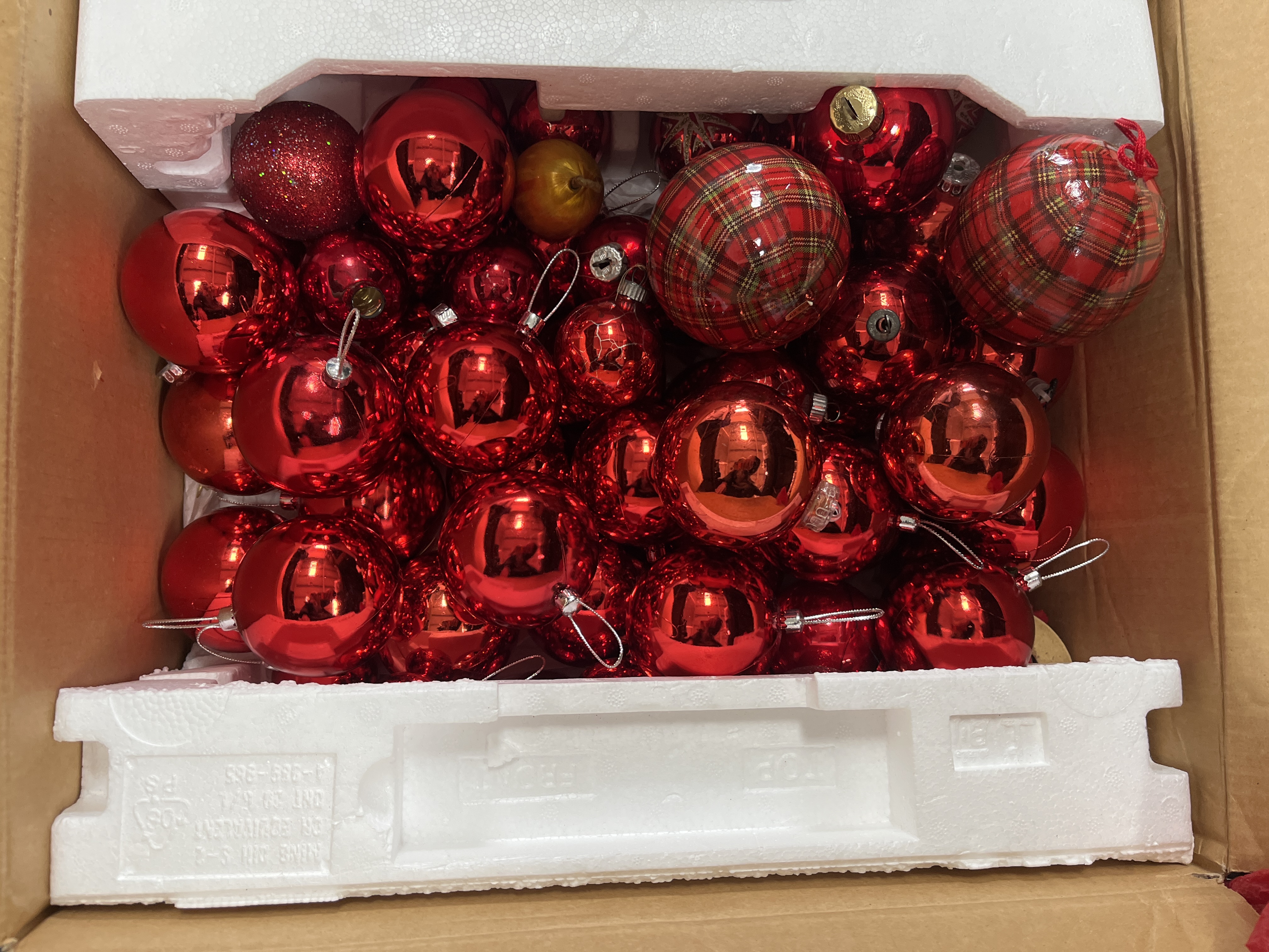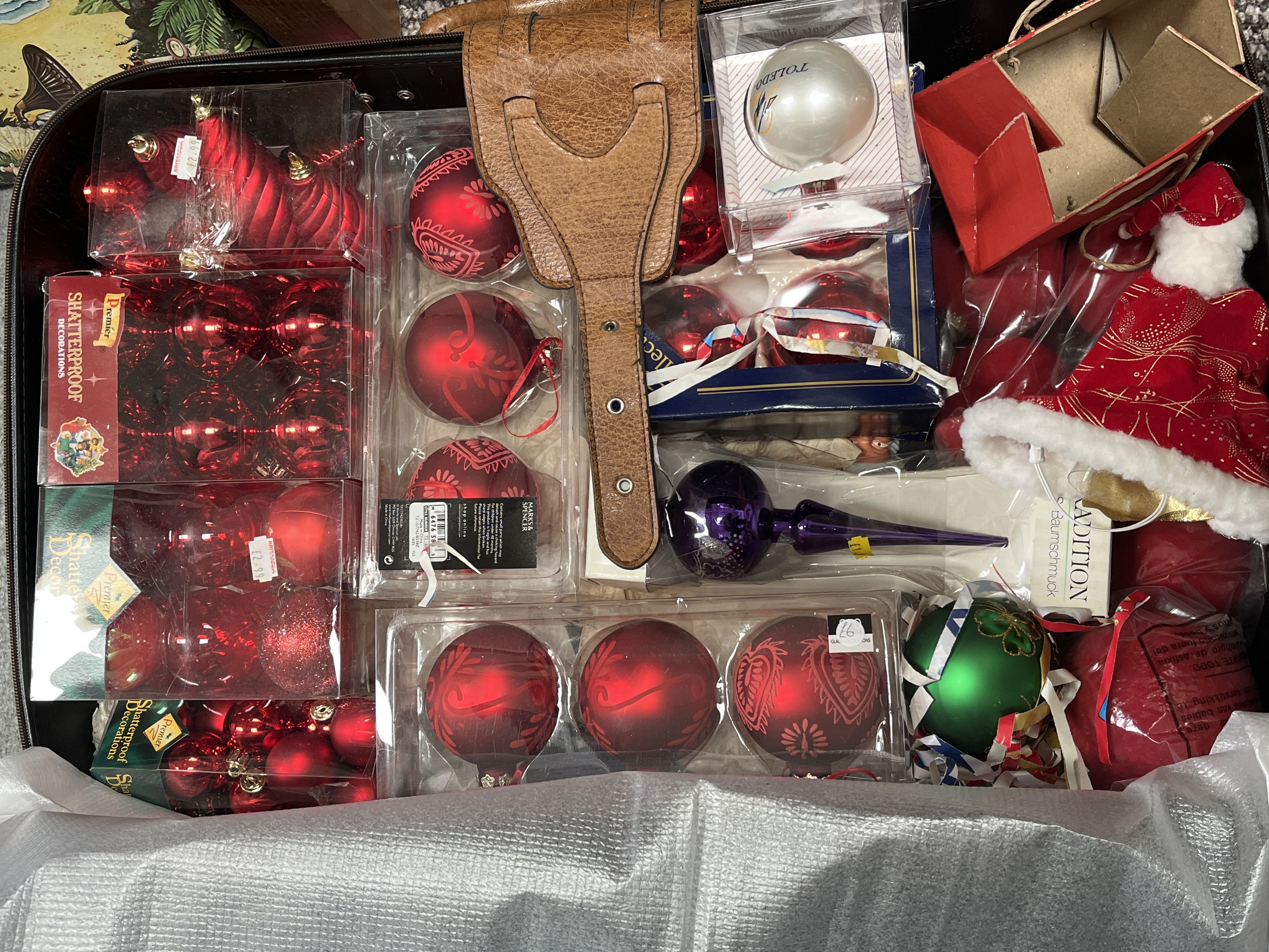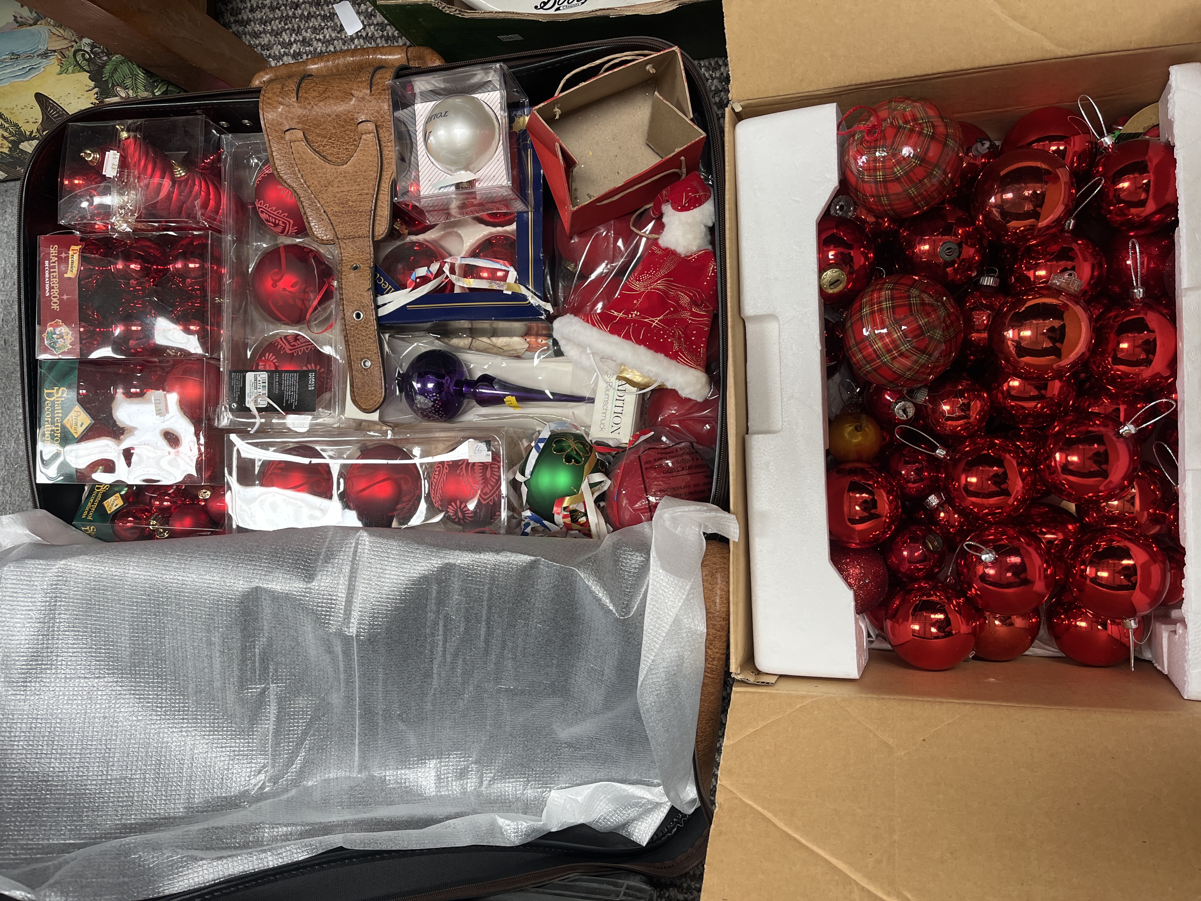A large assortment of holiday decorations primarily featuring red baubles in various finishes including matte, gloss, and glitter. The collection includes several sets of shatterproof ornaments by Premier, as well as patterned red and gold glass baubles from Marks & Spencer. Notable pieces include tartan-patterned ornaments, a purple glass tree topper, a green glass ornament with a gold-tone motif, and a white ornament marked TOLEDO. Also present is a miniature fabric Santa hat and a brown leather buckle strap. Several items remain in their original retail packaging or clear display boxes, including pieces from Tradition Baumschmuck. The lot is housed within a black suitcase and a cardboard box with protective foam inserts.