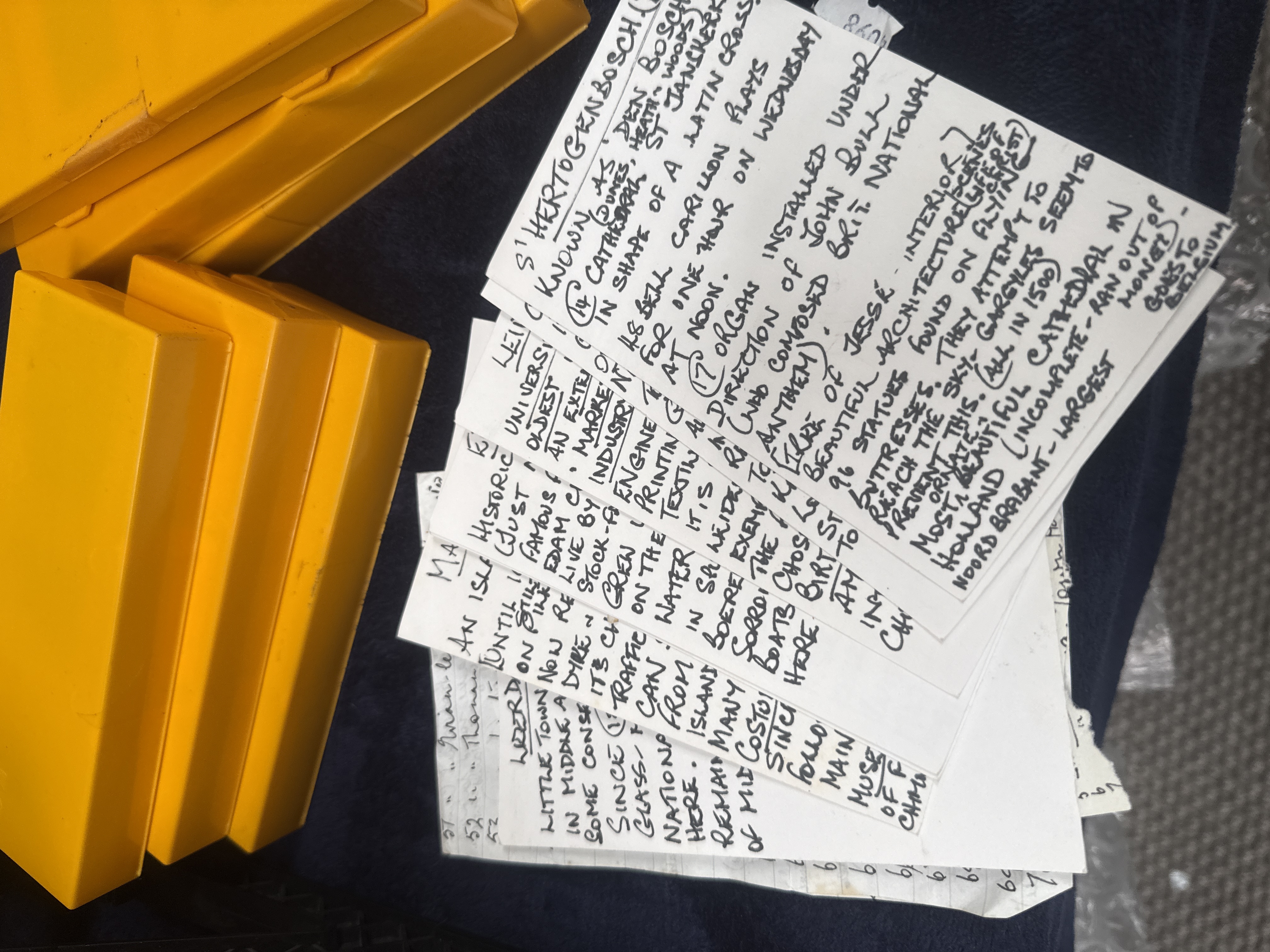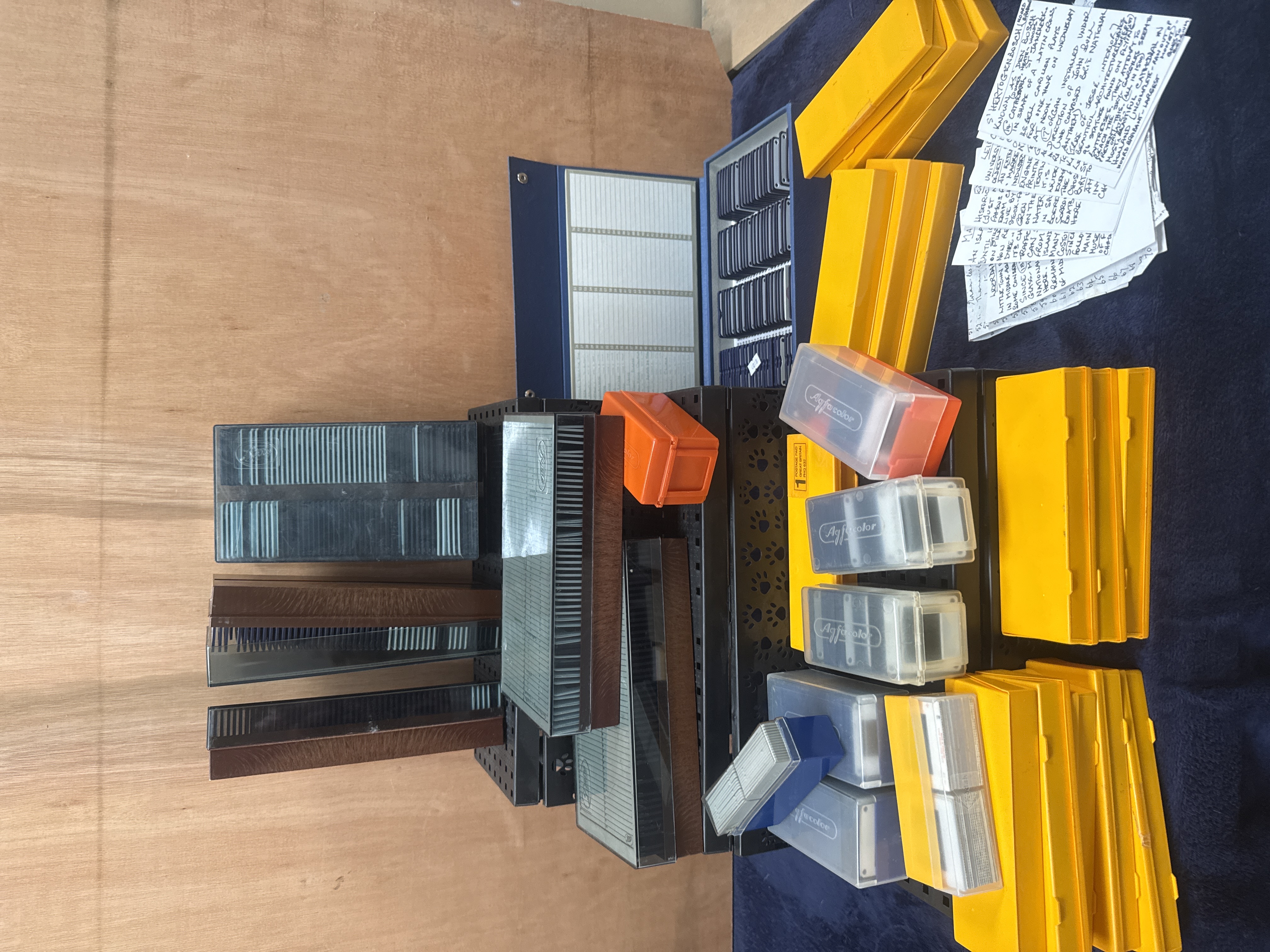 A collection of 29 items comprising mid-to-late 20th-century photographic slide storage cases, handheld viewers, and associated documentation. The assembly includes multiple plastic storage containers in various colours, including yellow, orange, and blue, alongside cases with a wood-grain effect finish. Several clear-lidded cases are marked with the Agfacolor brand. The lot includes a blue binder with an index sheet and several handwritten index cards. These cards contain detailed descriptive notes in English regarding European landmarks and locations, such as S’Hertogenbosch, Leiden University, and various sites in Belgium, forming a catalogued travel archive.