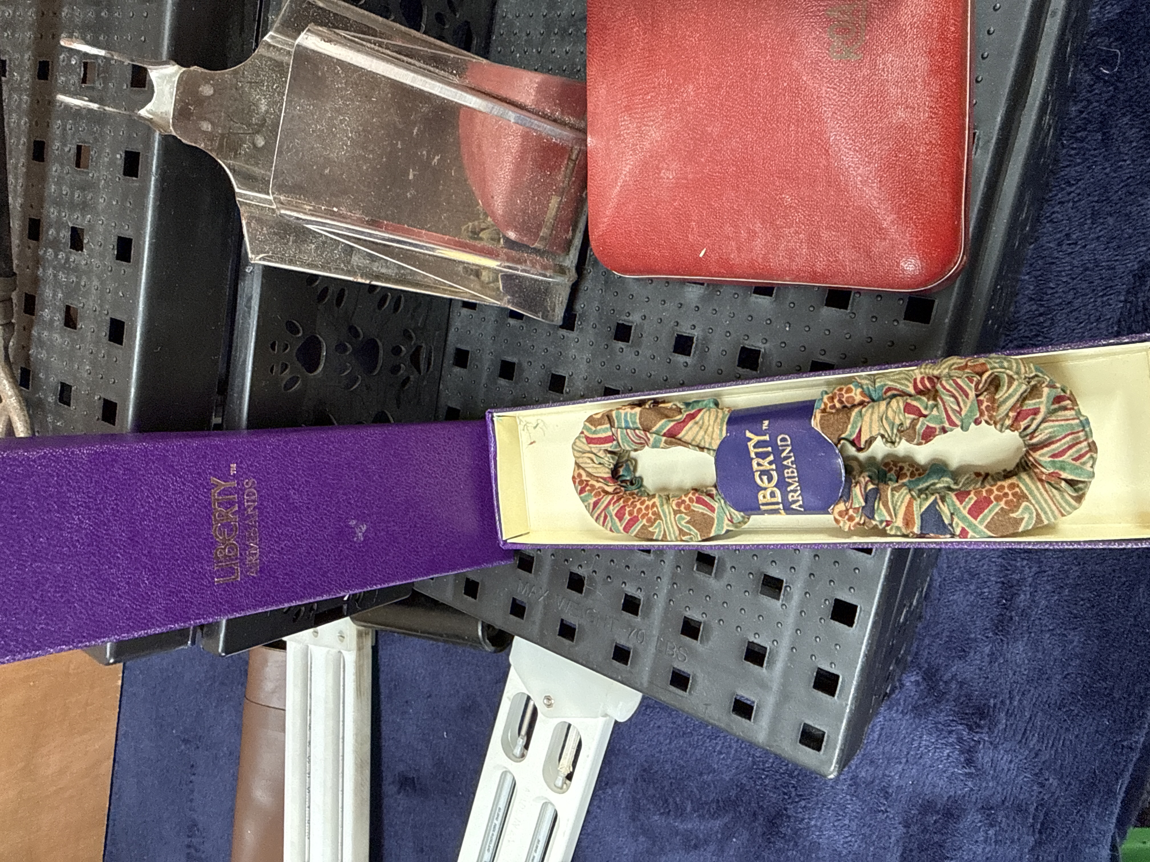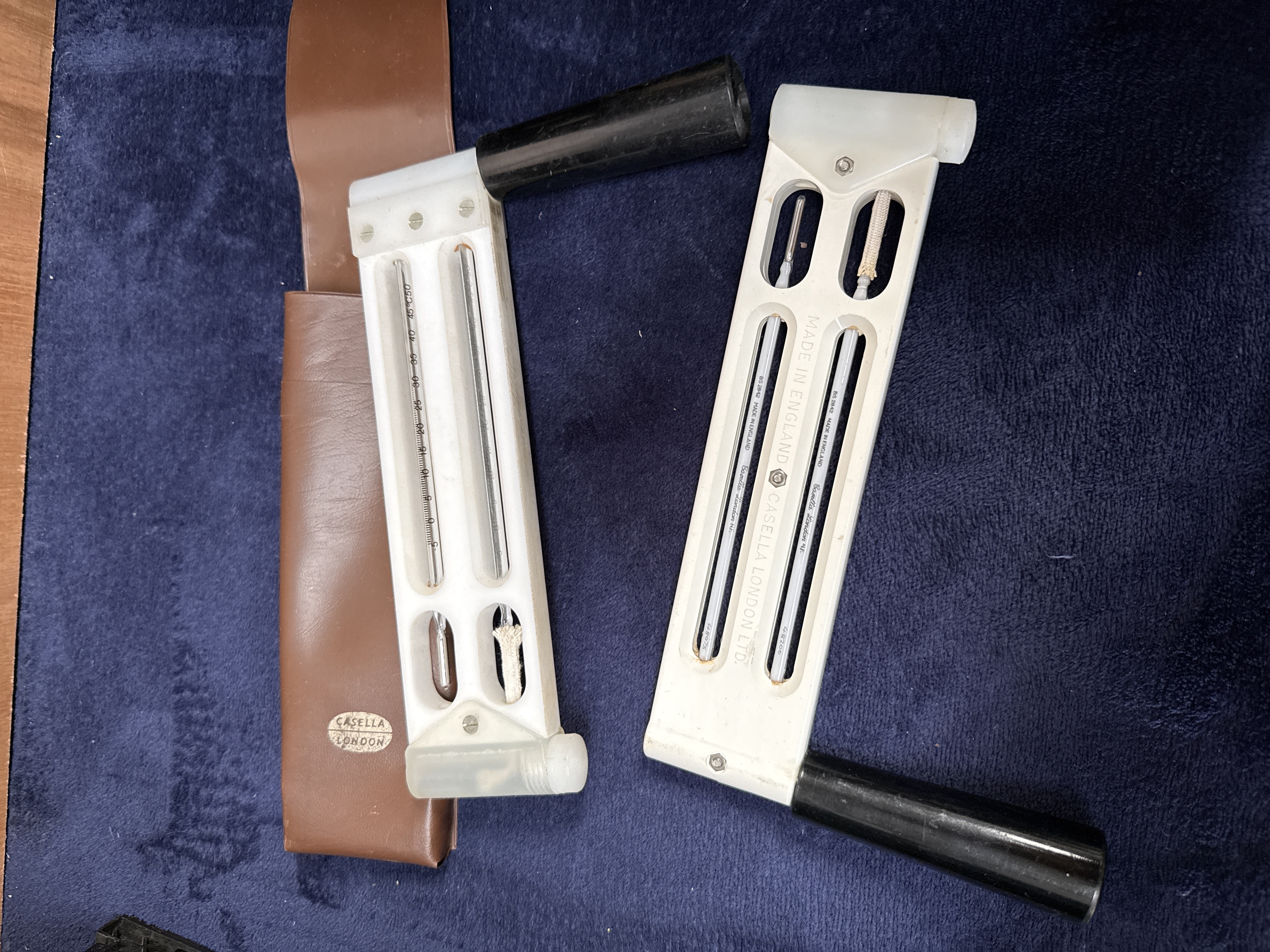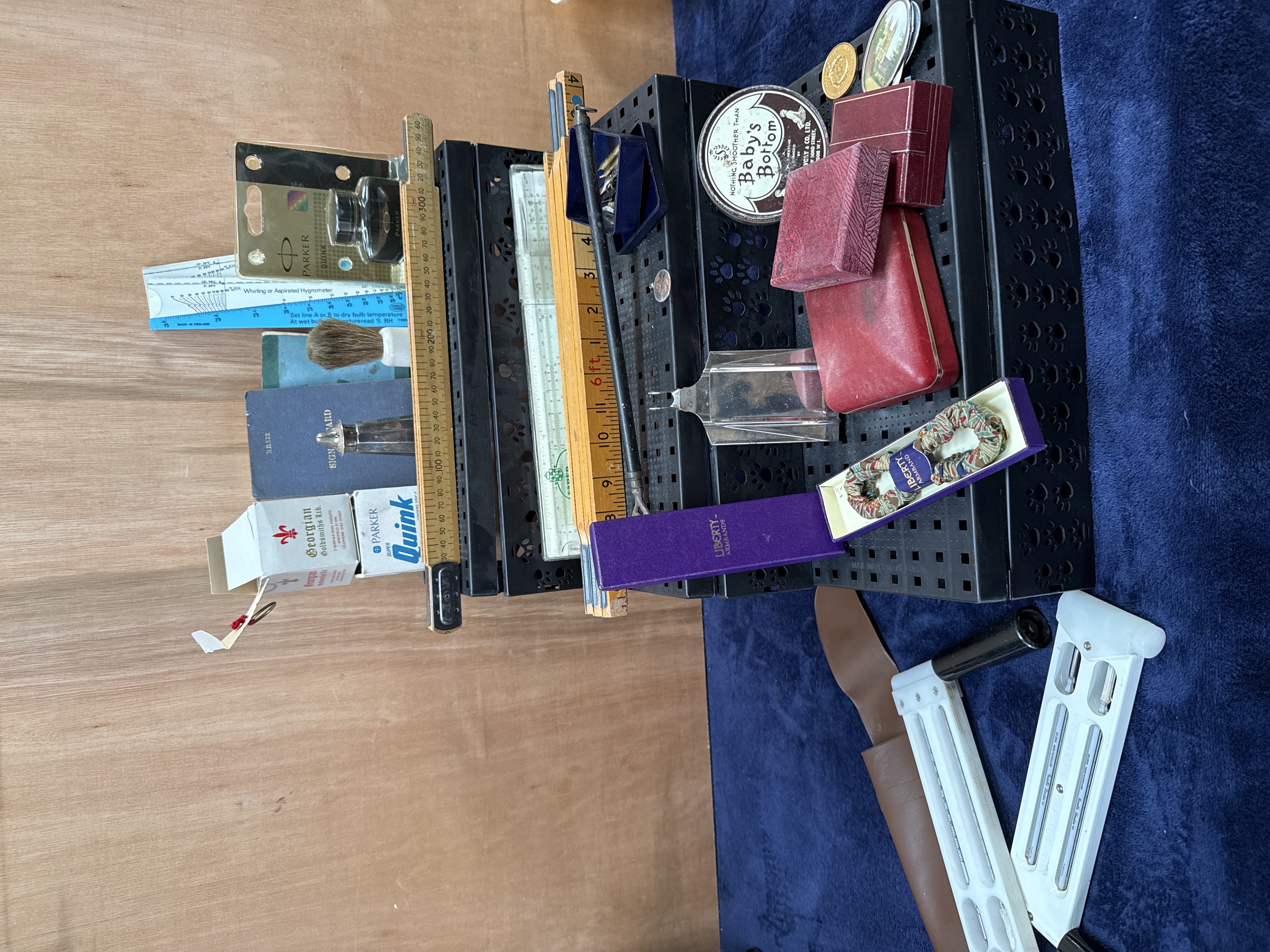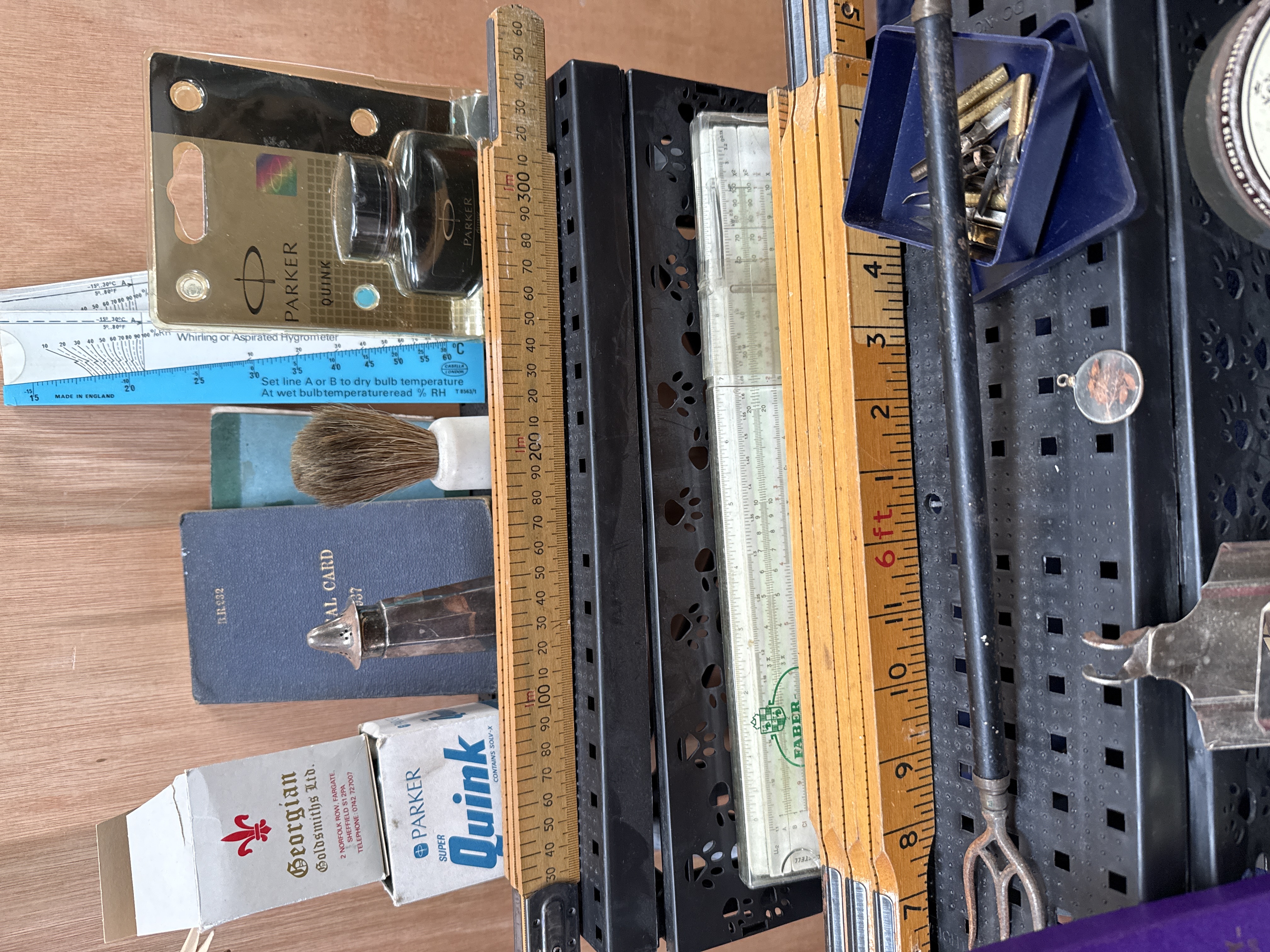 A collection of empty jewellery boxes in various sizes and finishes, including red and maroon presentation cases and a white box for Georgian Goldsmiths Ltd. of Sheffield. The lot also features 20th-century scientific and measuring instruments, notably two white whirling hygrometers by Casella London Ltd. with a brown carrying case, a Faber-Castell slide rule in a plastic sleeve, and a folding wooden ruler. Stationery and personal items include a bottle of Parker Super Quink ink in its original carton, a pair of patterned Liberty of London armbands in a purple box, a vintage shaving brush, a Baby’s Bottom tobacco tin, and a selection of metal nibs. The group is completed by a long-handled metal tool and miscellaneous ephemera.