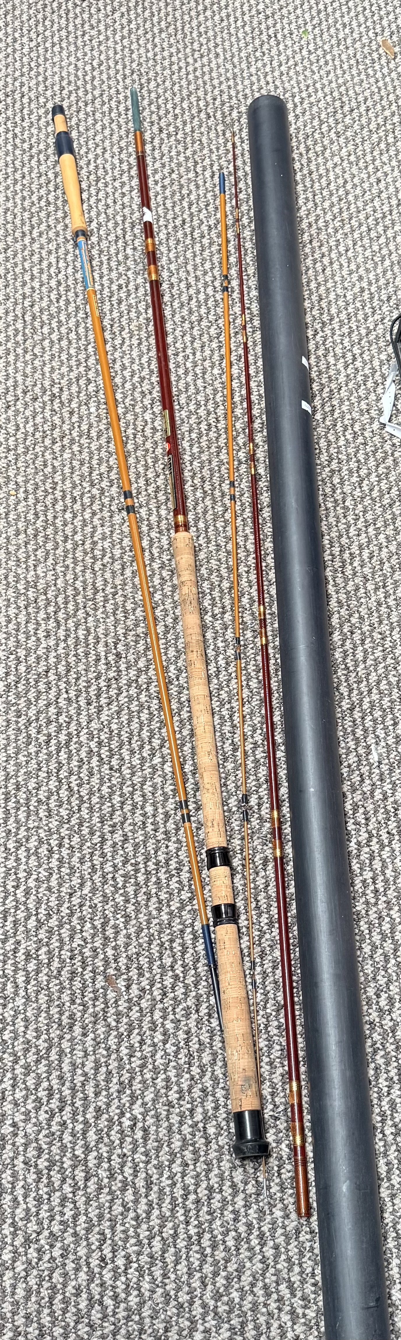 A collection of vintage-style split-cane bamboo fly rod components and a protective storage tube. The group includes several rod sections of varying lengths, featuring finishes in honey-yellow and deep reddish-brown tones. The primary handle section is equipped with a long, segmented cork grip and black metal reel seat fittings. Decorative thread wraps in black and gold are visible at the guide points and ferrules. A blue manufacturer’s label is partially visible on one section. The assembly is accompanied by a black, cylindrical, hard-surface storage tube.