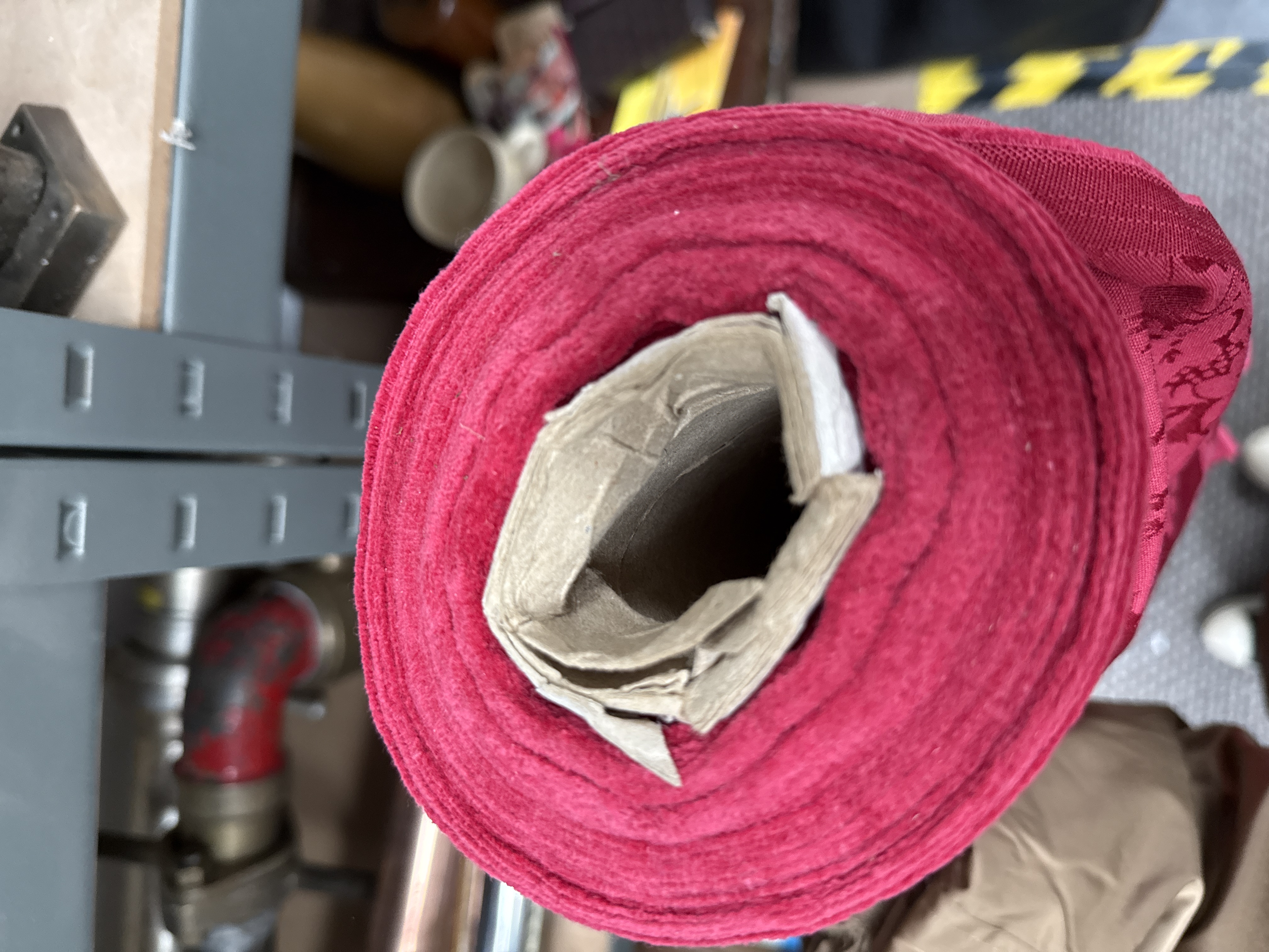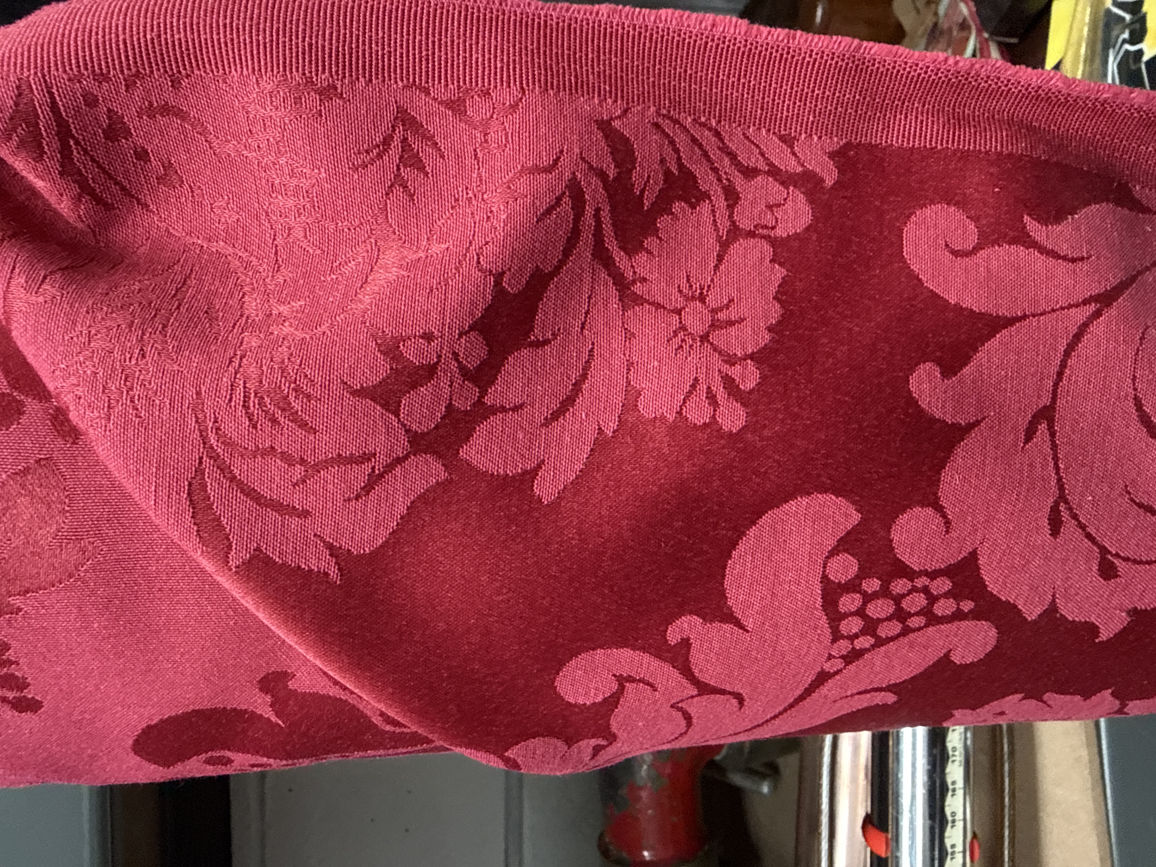 Attributed to Watts & Co., this roll contains several metres of heavy-weight damask upholstery fabric featuring a classical floral pattern. The textile is rendered in a deep maroon palette with a raised, cut velvet-style texture set against a flat-woven ground. The fabric is finished with a ribbed selvedge edge and is wound onto a cylindrical cardboard core. No maker’s marks or labels are visible. The design and construction are in the style of the Bellini or Hermitage patterns produced by Watts & Co.